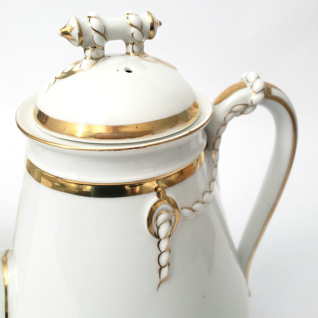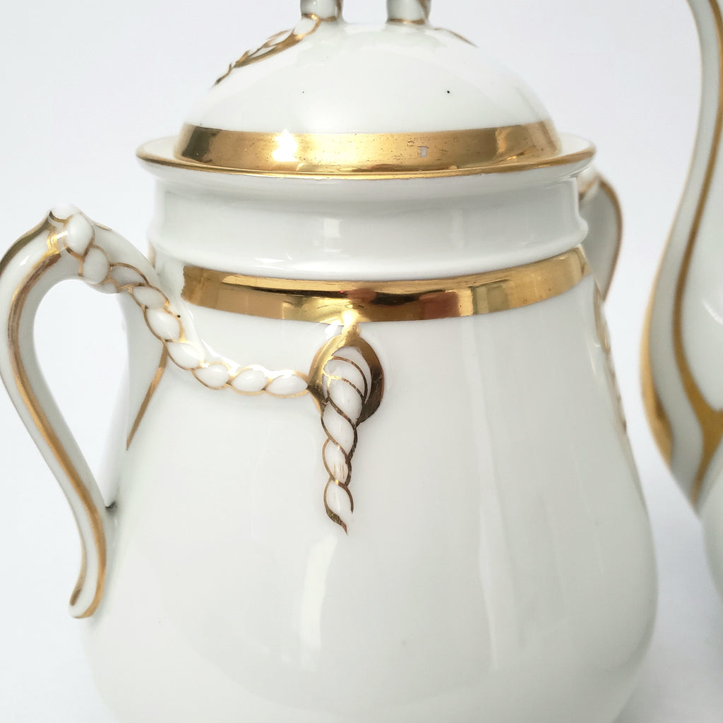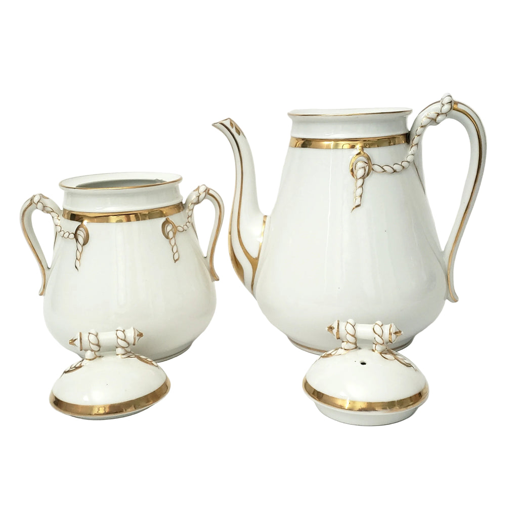 Description: This exquisite 19th-century porcelain lidded Sugar Bowl and matching Tea Pot will bring timeless elegance to your kitchen space. Each piece is decorated with gold metallic trim on white porcelain with a sophisticated raised rope-and-ring pattern. Some identify this as a Wedding Ring pattern by Haviland, Limoges, France. It bears an impressed mark and diamond registry mark on the bottom of the teapot, which assists in dating this piece to the 19th-century. A stunning addition to any china collection or a memorable gift for those who appreciate timeless kitchen table wares.