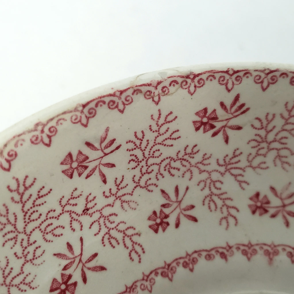 Product Description: Discover the timeless elegance of this authentic Antique Handleless Cup and Saucer crafted by Ridgway, Morley, Wear & Co, Staffordshire, England. Featured on the centered on the two pieces is a red transfer of the “Agricultural Vase” pattern–a charming farmland scene with animals and an ornamental urn in the foreground, beautifully framed by a delicate floral border. A pair that exemplifies the craftsmanship and artistry of 19th-century English pottery, making it a treasured addition to any collection.