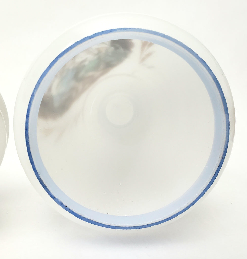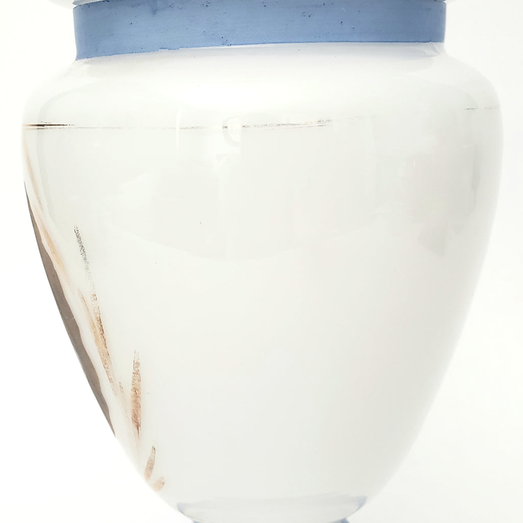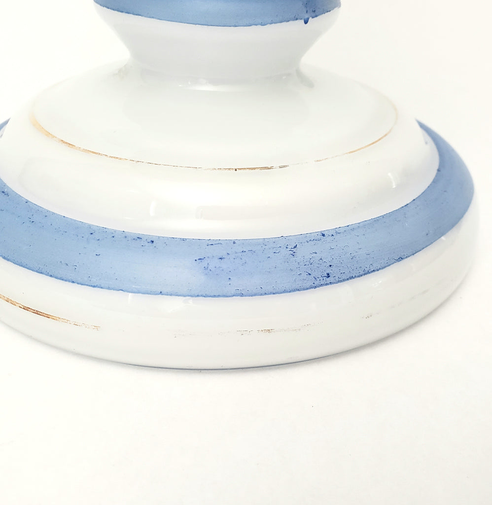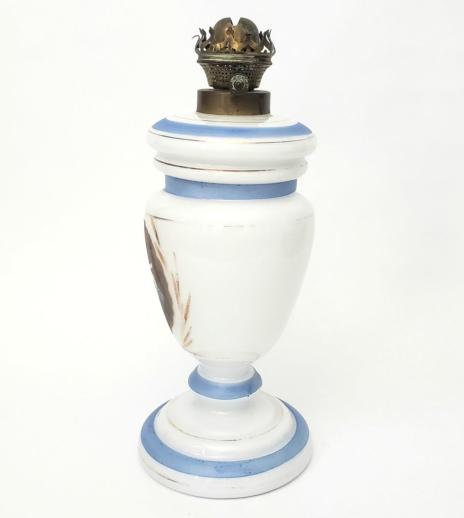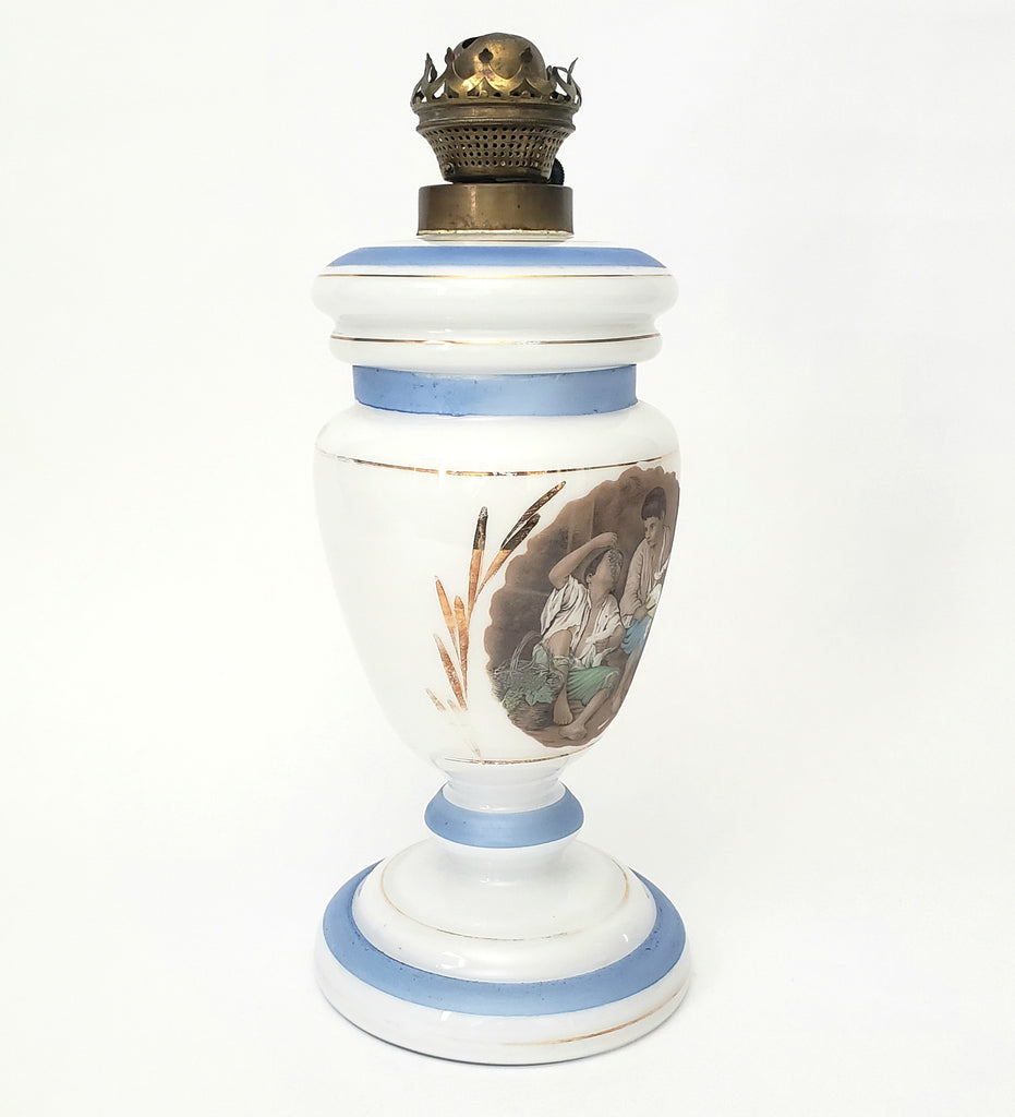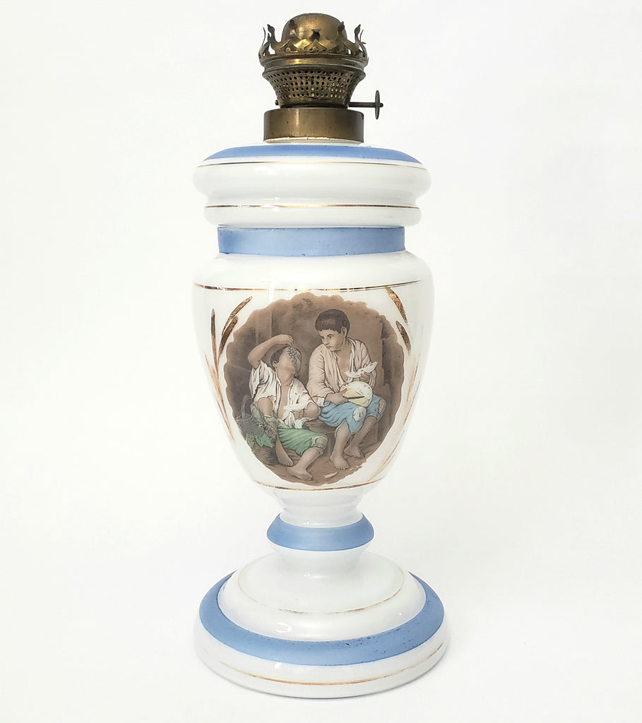 Description: This Antique Glass Kerosene Oil Lamp dating back to the late 1800s features the artistic themed art “The Beggar Boys”. This two-piece lamp is made of white, pressed glass with painted blue bands and thin gold trim. Display or repurpose this early lighting collectible from an era slightly before the widespread adoption of electricity.