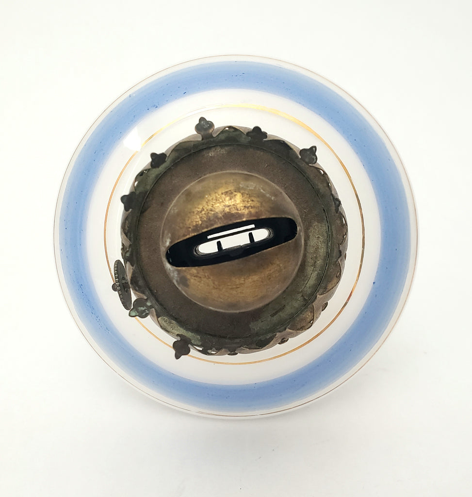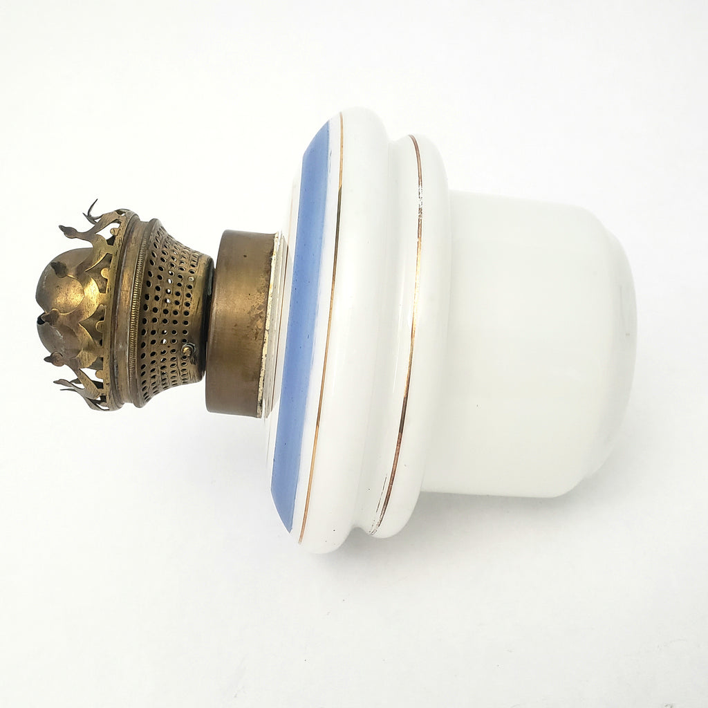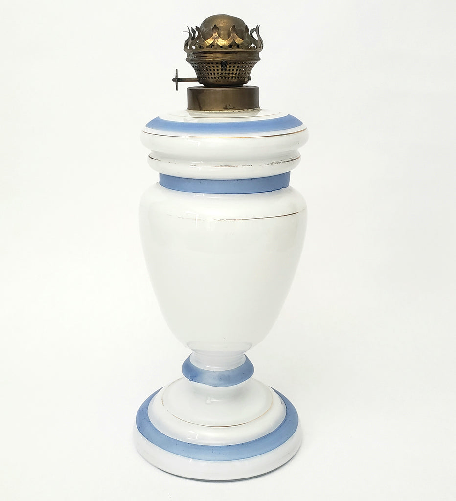 Condition: Previously owned - used. Condition is consistent with age and use. Due to age, material and safety concerns, this antique lamp is only being sold for decorative purposes or repurpose. Lamp has not been tested or disassembled, therefore recommended not for use. Body of lamp exhibits color wear on blue bands and gold trim. Gold trim is easily removable. Chimney, shade and original wick are “not” included.