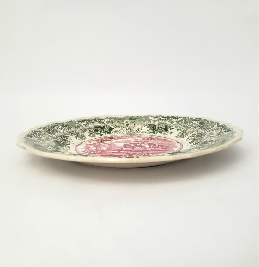 Description: This exceptional antique transferware 8” plate by William Adams & Sons from the early mid-19th century, showcases the craftsmanship of early Staffordshire pottery.  This 8” smaller salad plate size with a scalloped rim showcases a captivating two-color design with a detailed green floral and scrolling pattern featured on outer edge and a central scene of a romantic, equestrian scene of a couple riding horses accompanied by a running dog surrounded by a tree, mountains and an architecture element in the background. Bearing the impressed Adams mark on the back with the red printed “Andalusia” pattern name, this piece is a treasured addition for collectors of authentic English pottery who appreciate fine craftsmanship and historical artistry.