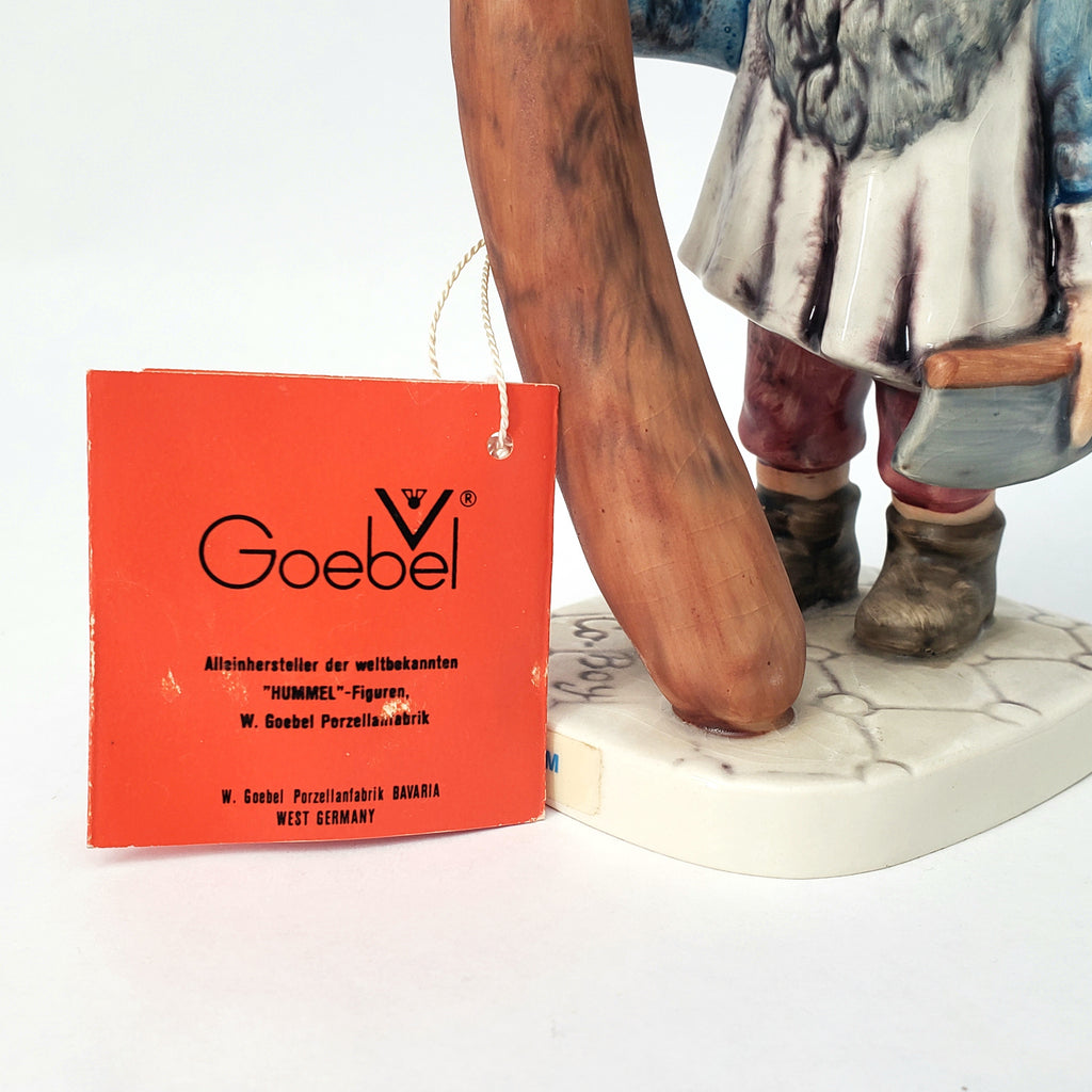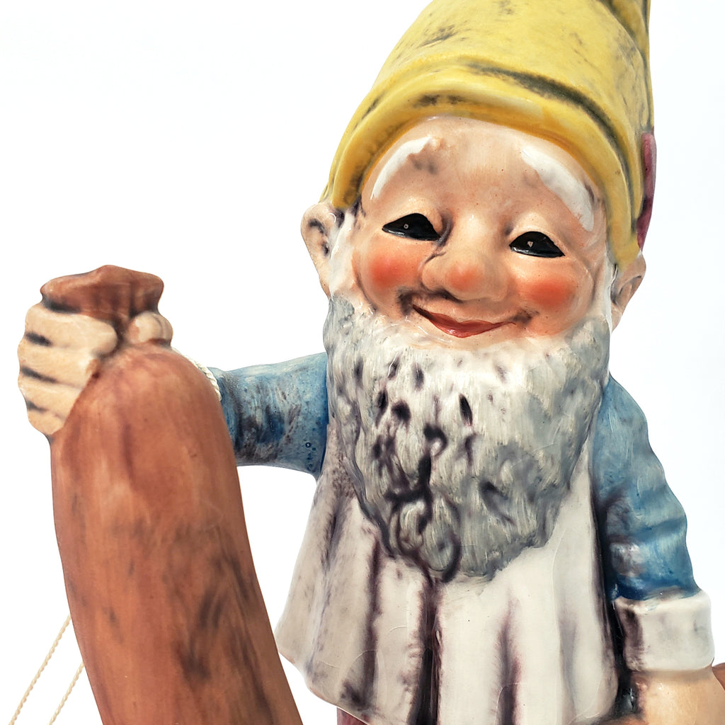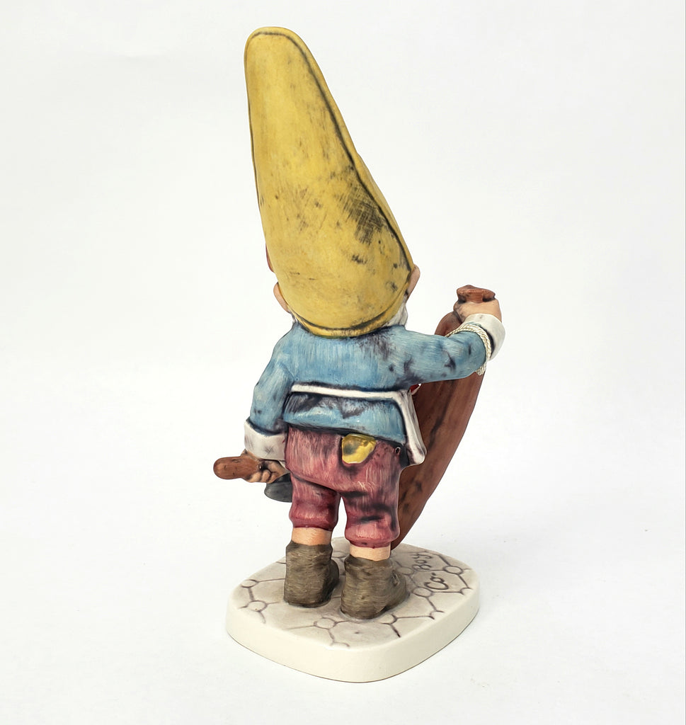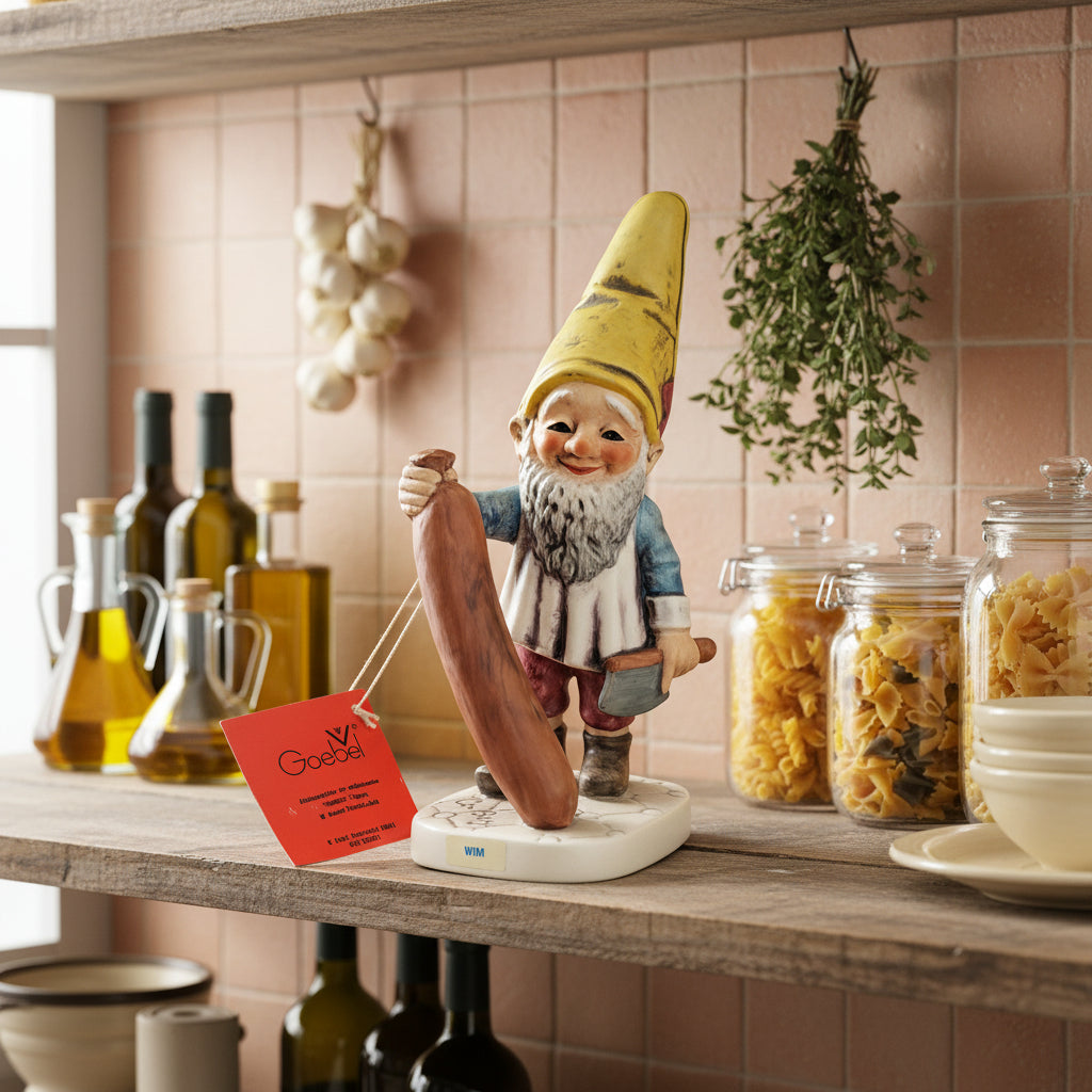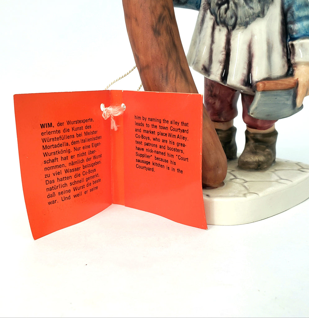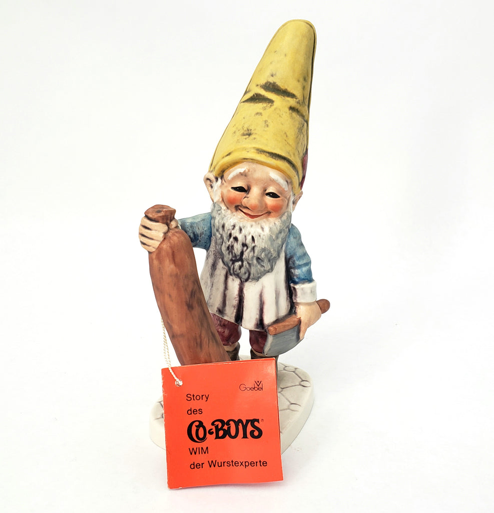 Description: This whimsical 7 ¾ inch tall Gnome is part of the Goebel “Co-Boys” figurines collection. Wim is a sausage expert, depicting his profession as a butcher, holding a large sausage and a cleaver. Famous for his Italian Sausage, he was honored by the townspeople and nick-named him “Court Supplier” because his sausage kitchen is in the courtyard.