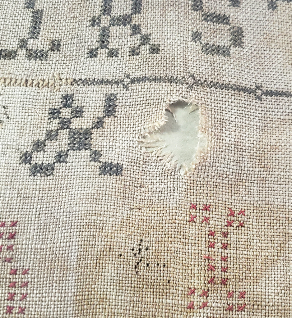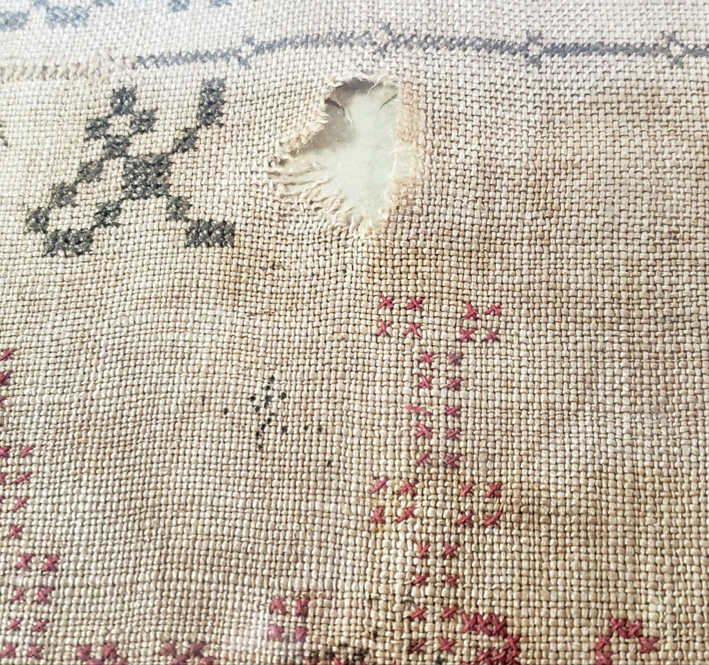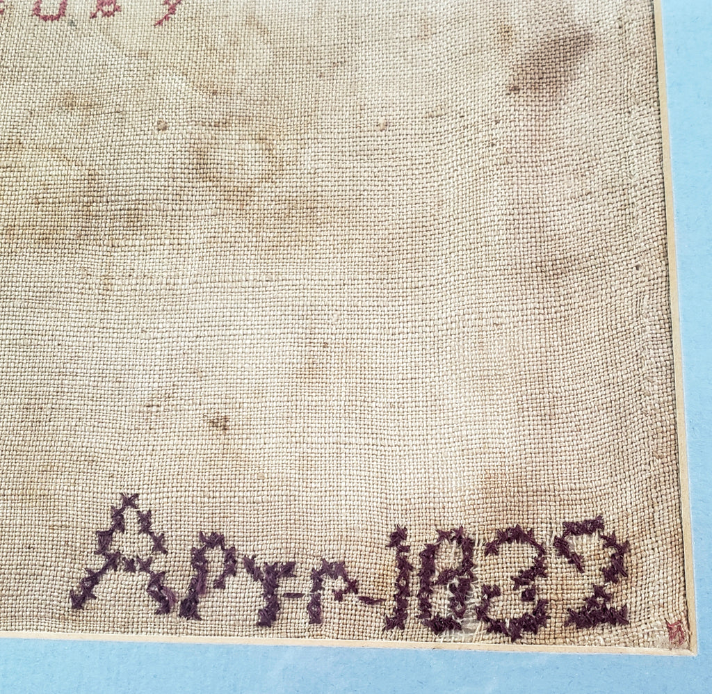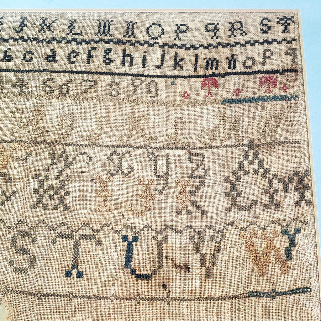 Condition: Previously owned – used. Condition is consistent with age and normal use. Sampler: Areas of fading and darkening which is common with most 19th century samplers. One ¾”x 1 “hole in center next to “X”. Frame: Rubs to corners. Not certain date when sampler was mounted to frame. Sampler has been acquired in as-is framed condition and has not been removed to inspect edges of original sampler. Paper back has separated from frame in areas.