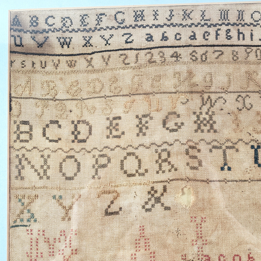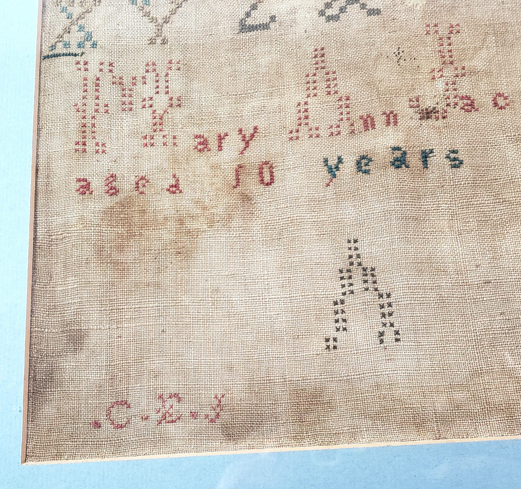 Description: Treasure a remarkable piece of textile history with this original needlepoint marking sampler by Mary Ann Jacoby completed at age 10. Her work includes different style cross stitched upper and lower case alphabets and a numeral on linen ground. Proudly displayed under glass with a light blue matt and wooden frame, each stitch reflects the dedication and skill of Mary Ann’s cross stitch accomplishment, making this sampler a treasured collectible for collectors or textile lovers and those who appreciate authentic period pieces.