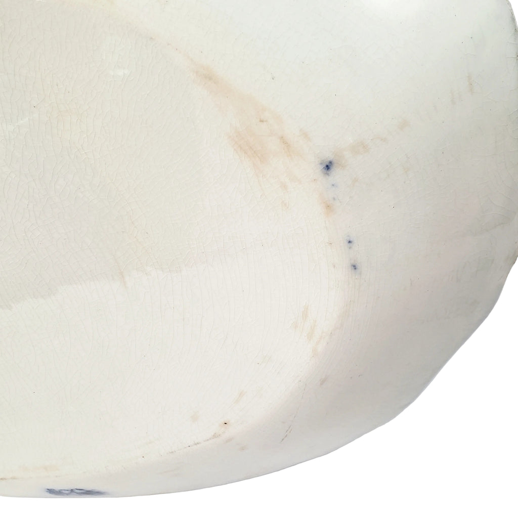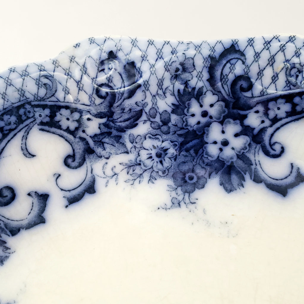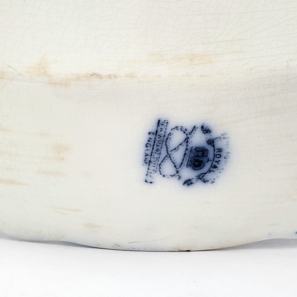 Description Discover an exceptional piece of English transferware history with this stunning 17 ¾” oval platter by New Wharf Pottery Co., Burslem, Staffordshire, England. The Royal pattern showcases a slightly cupped oval shape with intricate floral, scrolls and lattice designs in a rich, cobalt blue color on white. It’s a generous size in the Royal pattern, a unique find. Authentic aged character including all-over crazing and areas of natural discoloration within a striking glossy glaze, speaking to its genuine vintage character adding depth and history to this collectible transferware platter. Perfect for collectors or those seeking a distinctive statement piece with provenance and timeless appeal.