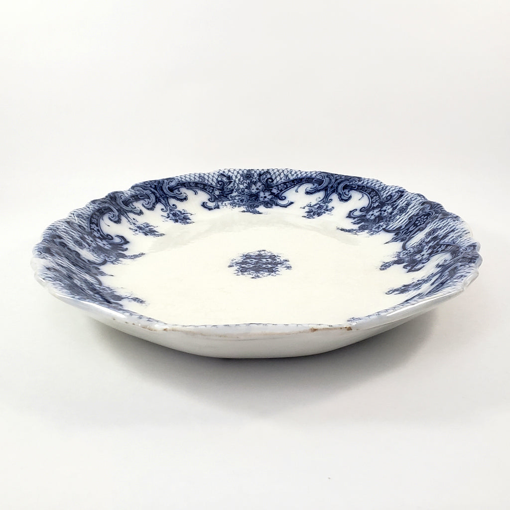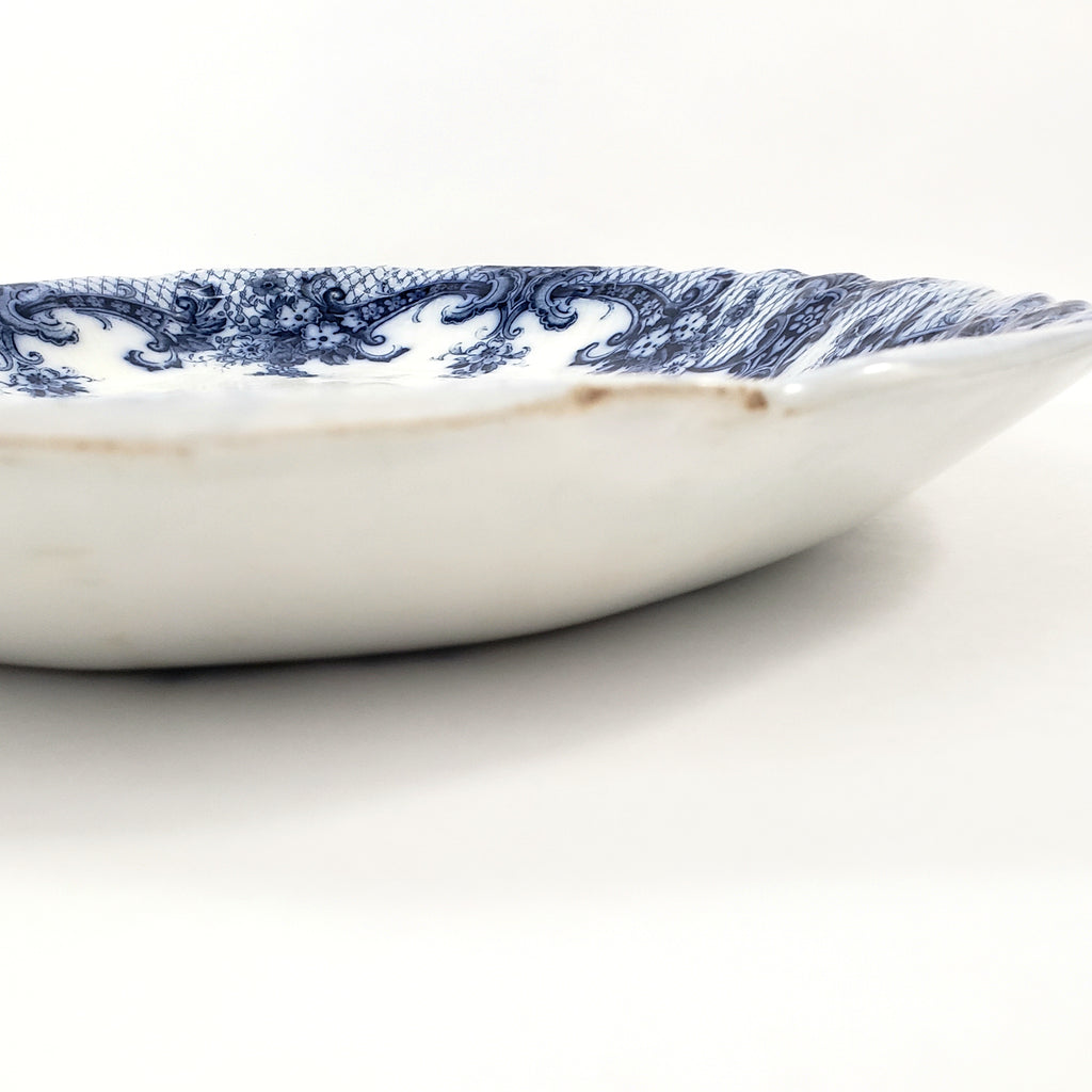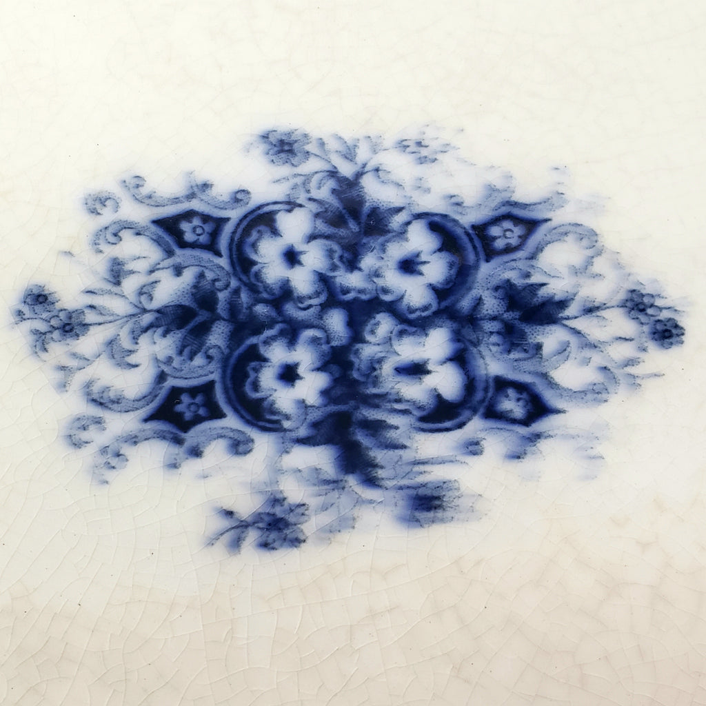 Description Discover an exceptional piece of English transferware history with this stunning 17 ¾” oval platter by New Wharf Pottery Co., Burslem, Staffordshire, England. The Royal pattern showcases a slightly cupped oval shape with intricate floral, scrolls and lattice designs in a rich, cobalt blue color on white. It’s a generous size in the Royal pattern, a unique find. Authentic aged character including all-over crazing and areas of natural discoloration within a striking glossy glaze, speaking to its genuine vintage character adding depth and history to this collectible transferware platter. Perfect for collectors or those seeking a distinctive statement piece with provenance and timeless appeal.