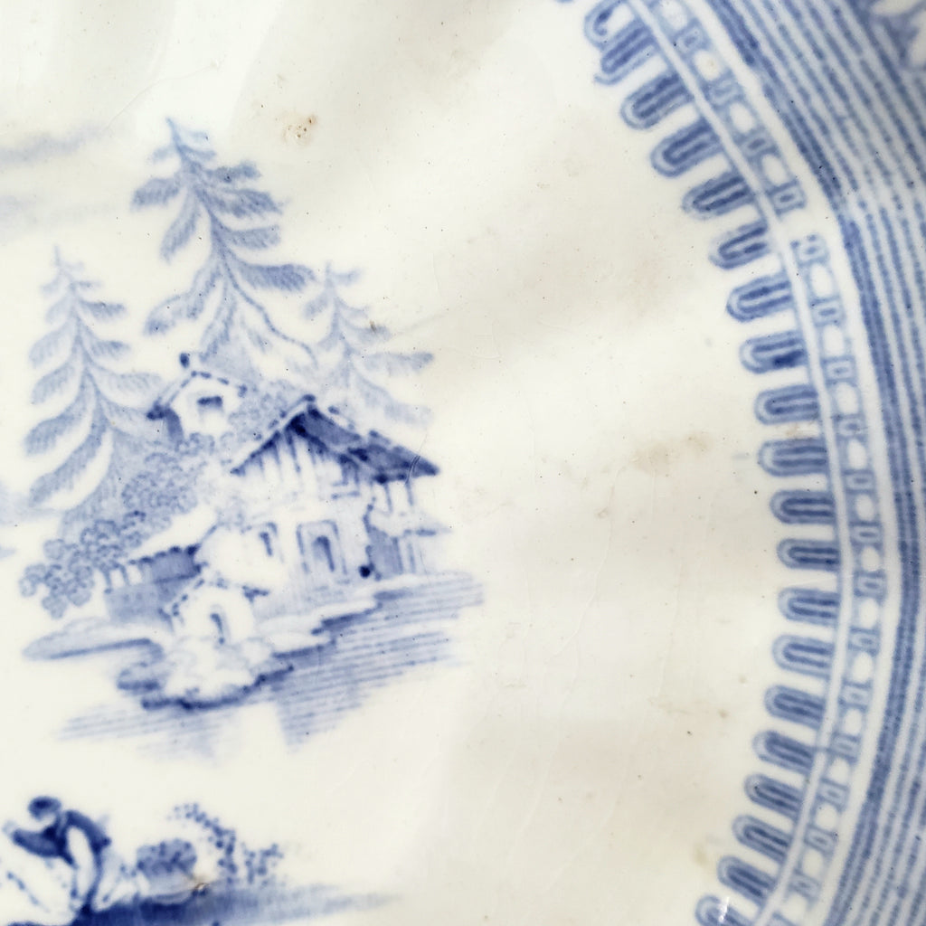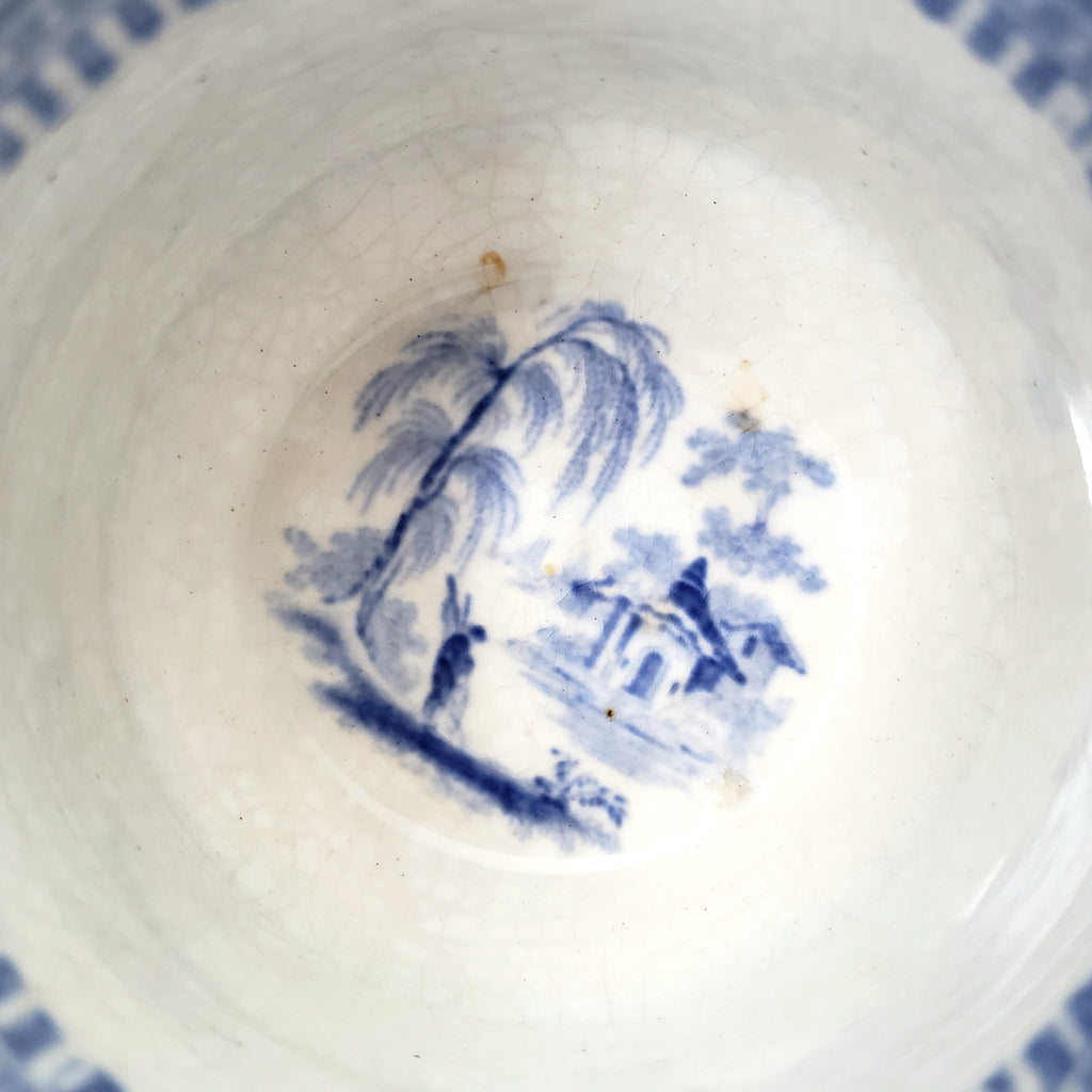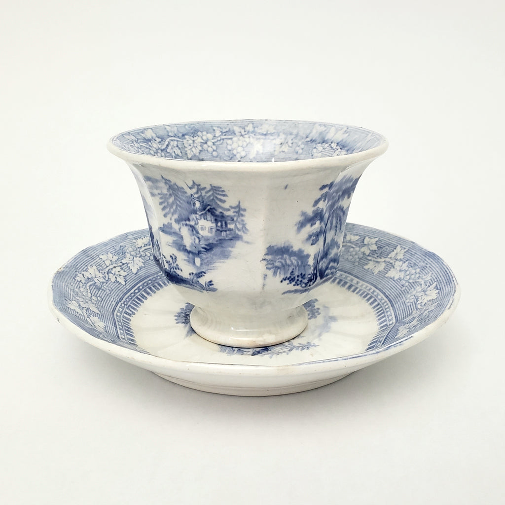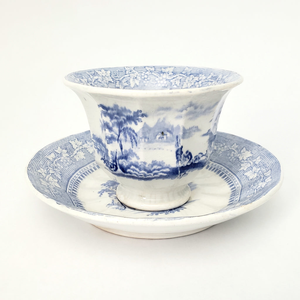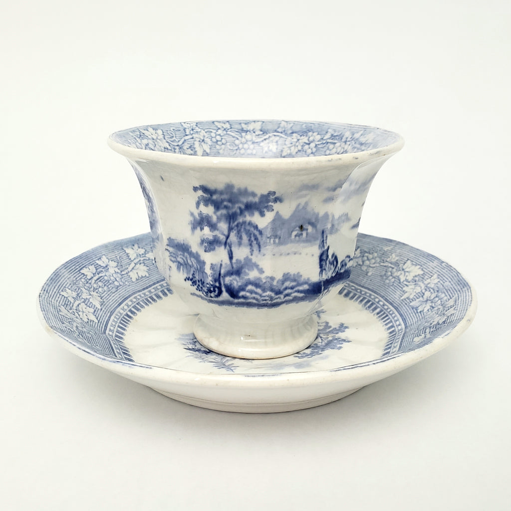 Description: This Blue & White Transferware Handleless Cup & Saucer in the "Vintage" pattern by J & G Alcock, Staffordshire, England, is a fine example of 19th-century English pottery. This set features a light blue transfer-print on white with a central scene depicting two men along the banks of a waterway with trees, mountains and houses in the distance. The pattern is detailed, framed by a decorative leaf and grape motif border with authentic age, typical of the period.
