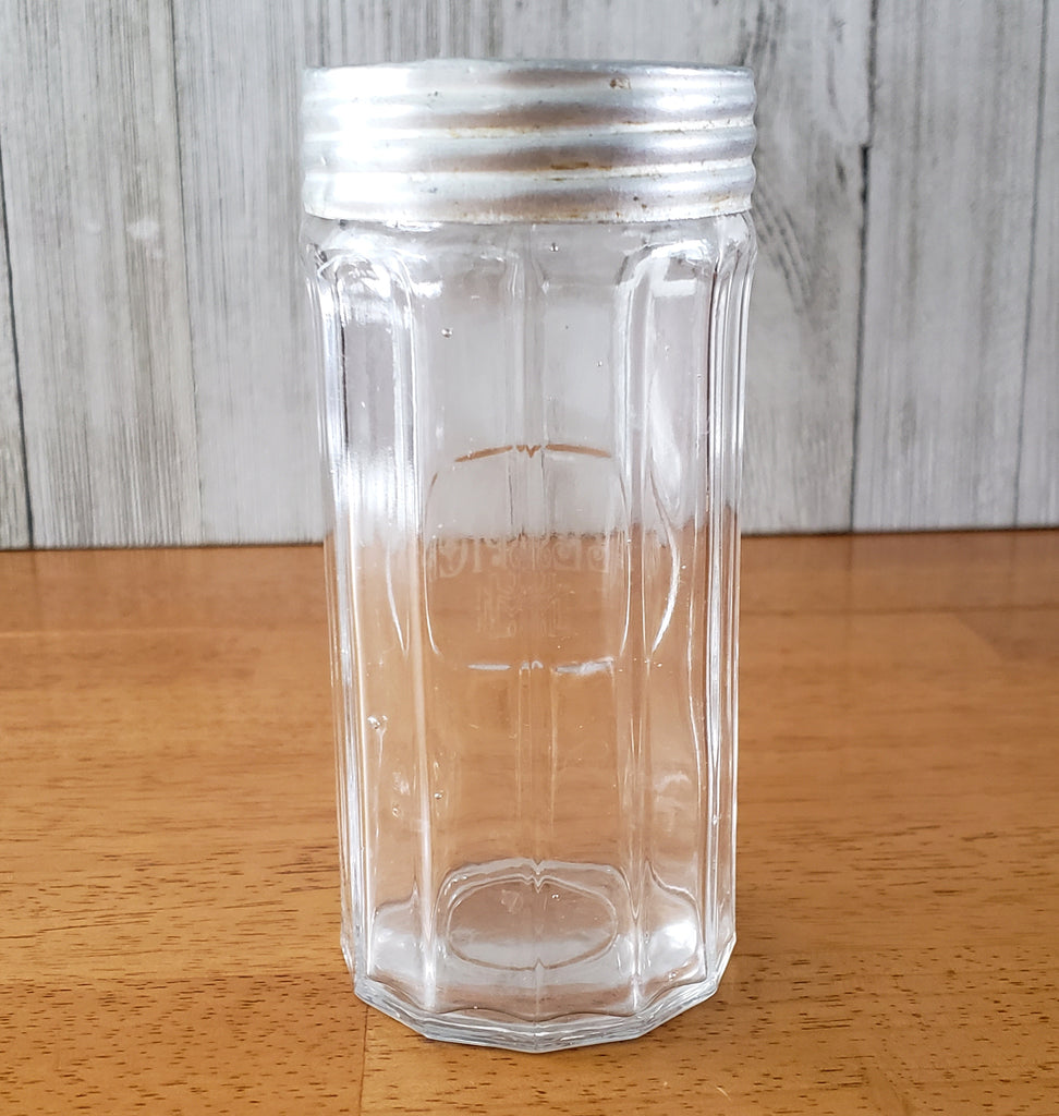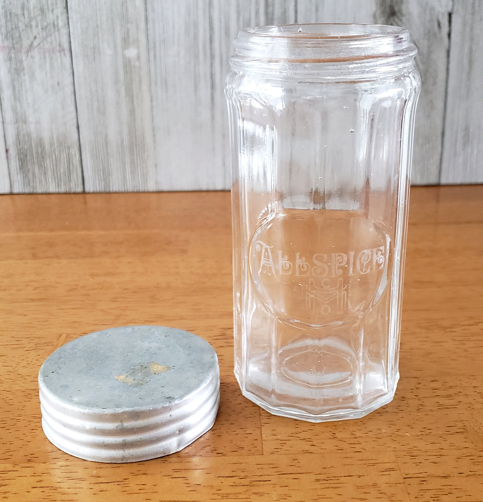 Description: Add timeless charm to your kitchen with this Vintage Glass "Allspice" Jar. Once commonly seen in kitchen and Hoosier cabinets during the 1930s and beyond, this spice jar stands 5 1/4" tall with its aluminum screw-on lid and 12-paneled body. The elegant acid-etched label; ALLSPICE and symbol featured on the front adds nostalgic detail.
