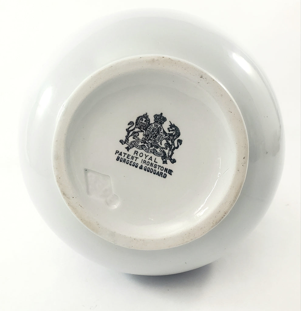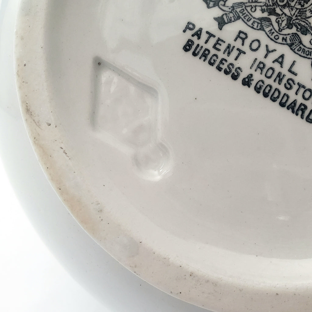 Maker Marks: ROYAL Patent Ironstone Burgess & Goddard (printed black) along with an impressed British Registration mark.