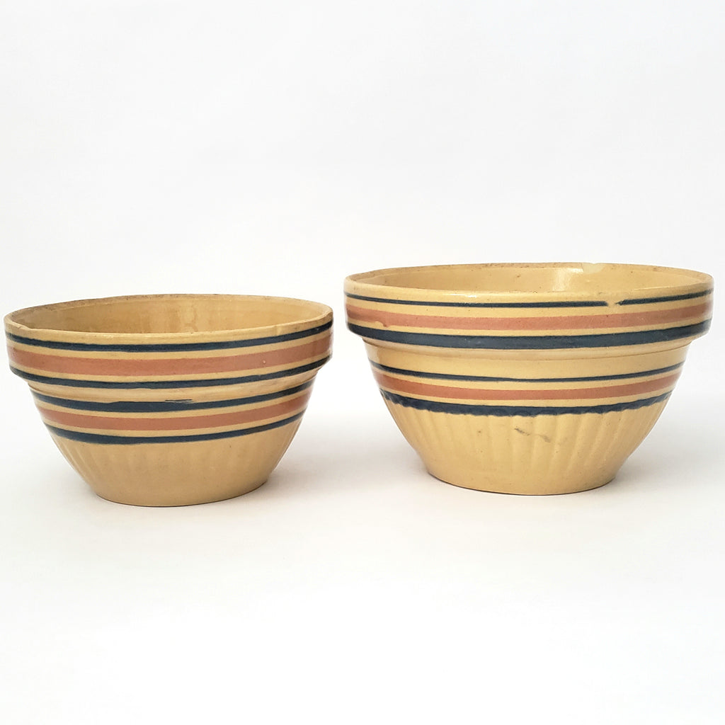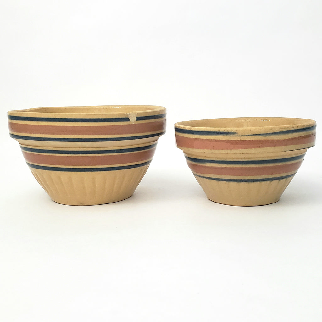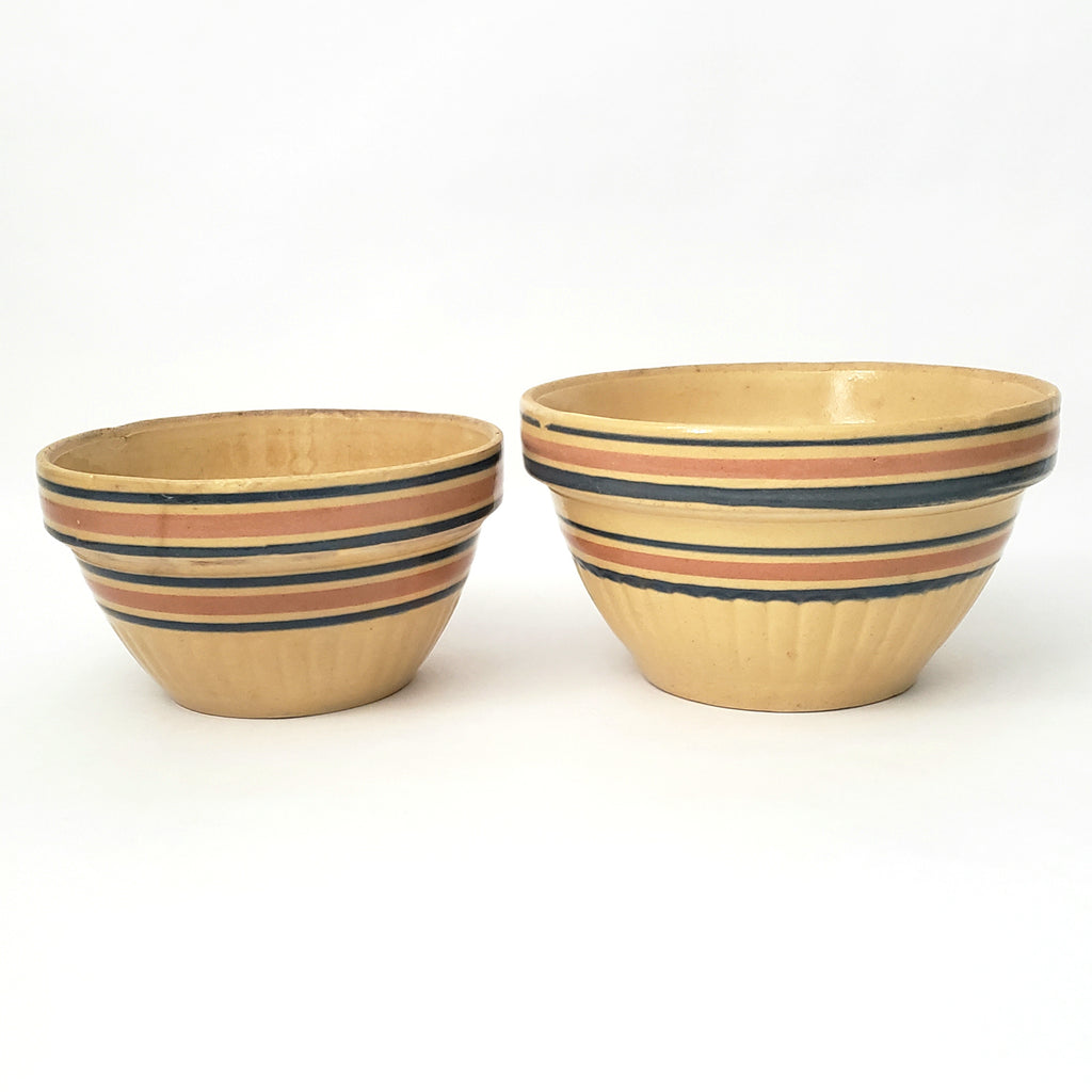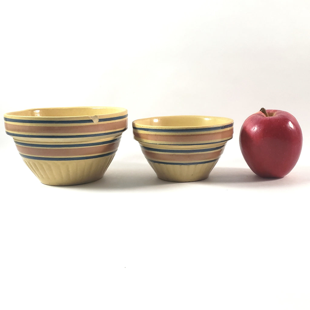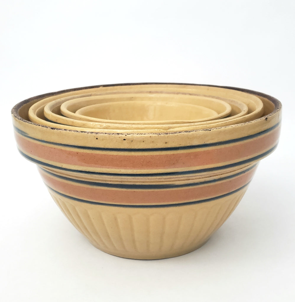 Description: Step back in time with this vintage treasure: a five-piece graduating yellow ware mixing bowl set with a rustic farmhouse appeal. With a time-worn appearance, each bowl features a distinctive taper body with wide pink and thin blue slip bands above a raised, vertical paneled arch pattern on the lower half. Diameter ranging from 5 inch to 9 1/4 inch, each bowl nests within each other, making them a charming graduating set of five. Despite showing its age and use as discussed below under "Condition", it’s not often we find a graduate set of five still together.