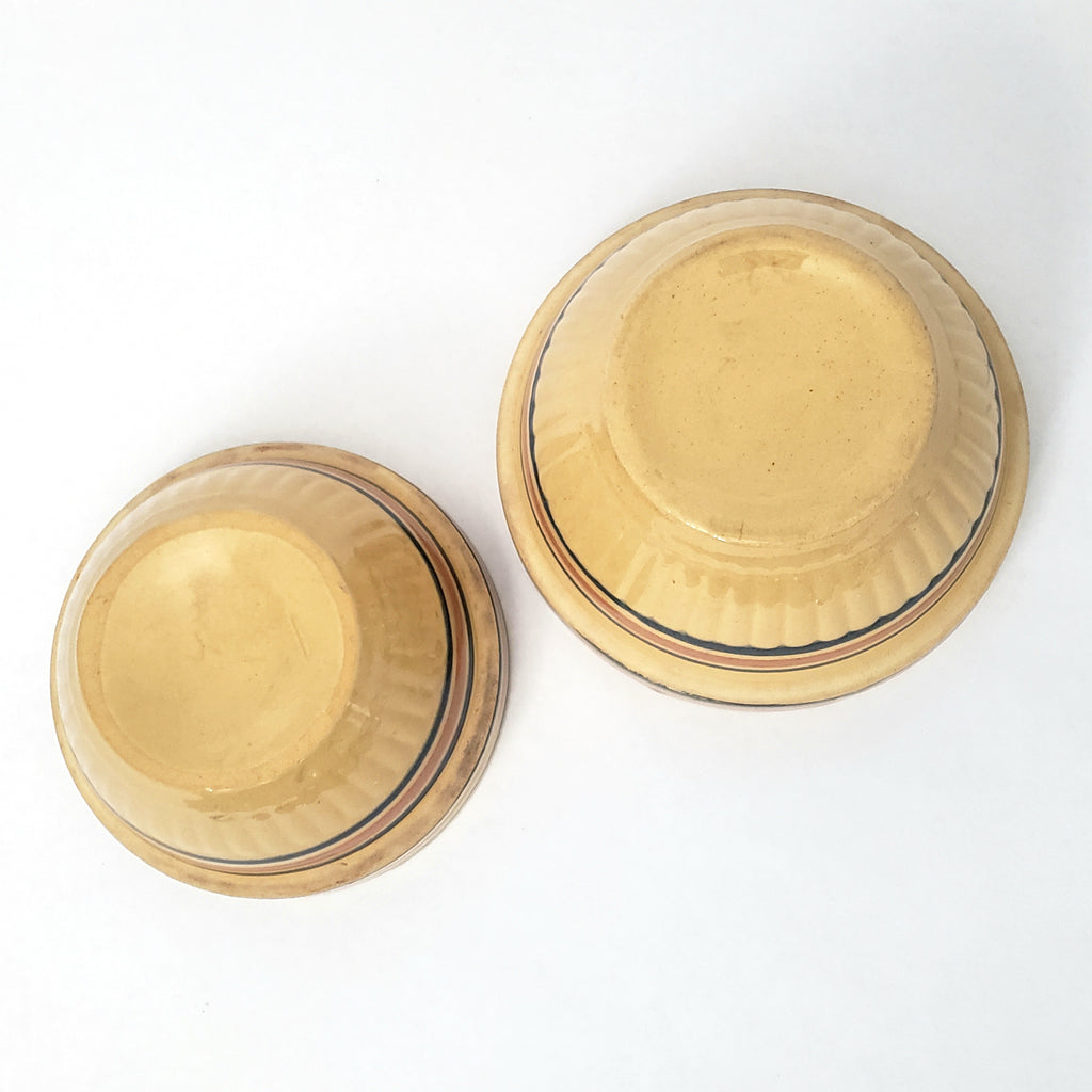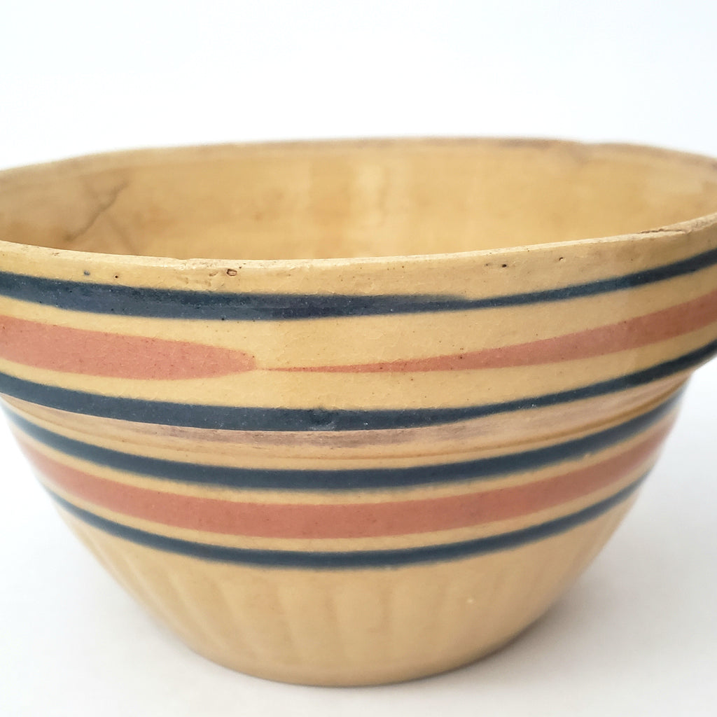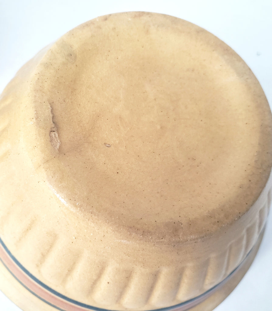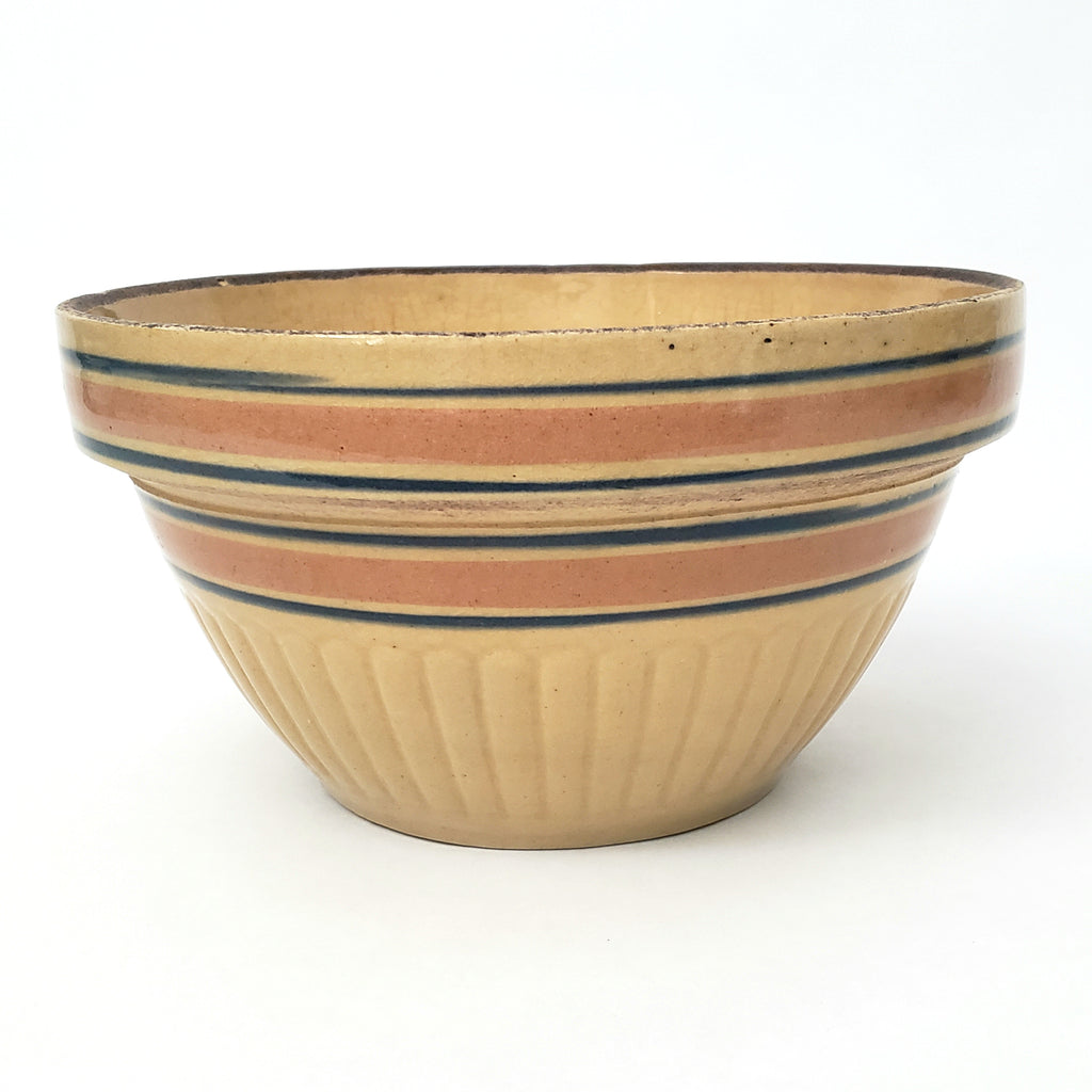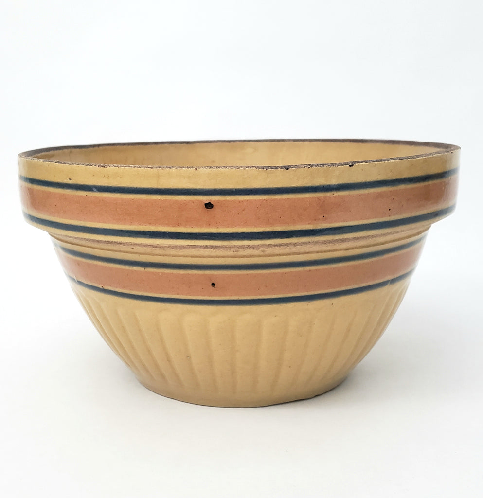 Description: Step back in time with this vintage treasure: a five-piece graduating yellow ware mixing bowl set with a rustic farmhouse appeal. With a time-worn appearance, each bowl features a distinctive taper body with wide pink and thin blue slip bands above a raised, vertical paneled arch pattern on the lower half. Diameter ranging from 5 inch to 9 1/4 inch, each bowl nests within each other, making them a charming graduating set of five. Despite showing its age and use as discussed below under "Condition", it’s not often we find a graduate set of five still together.