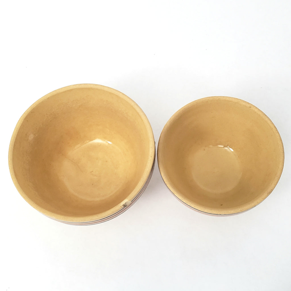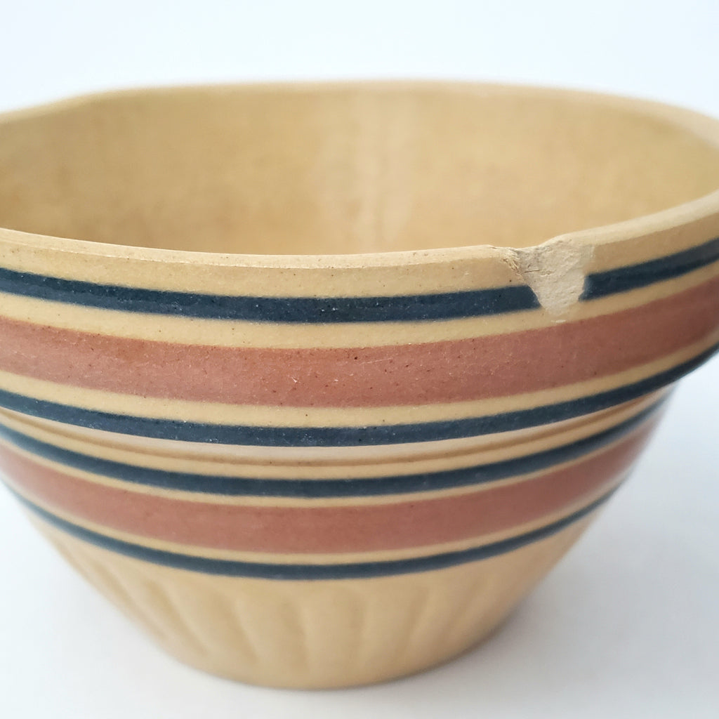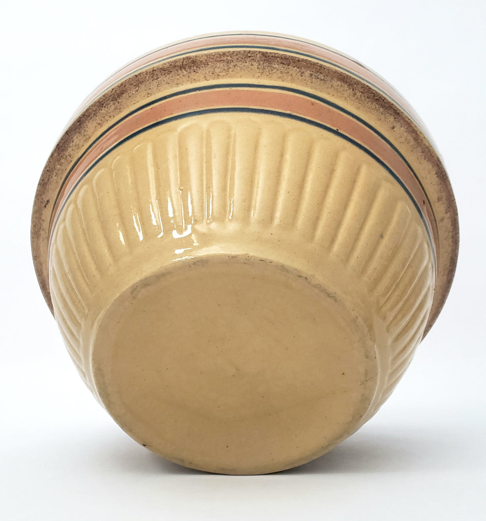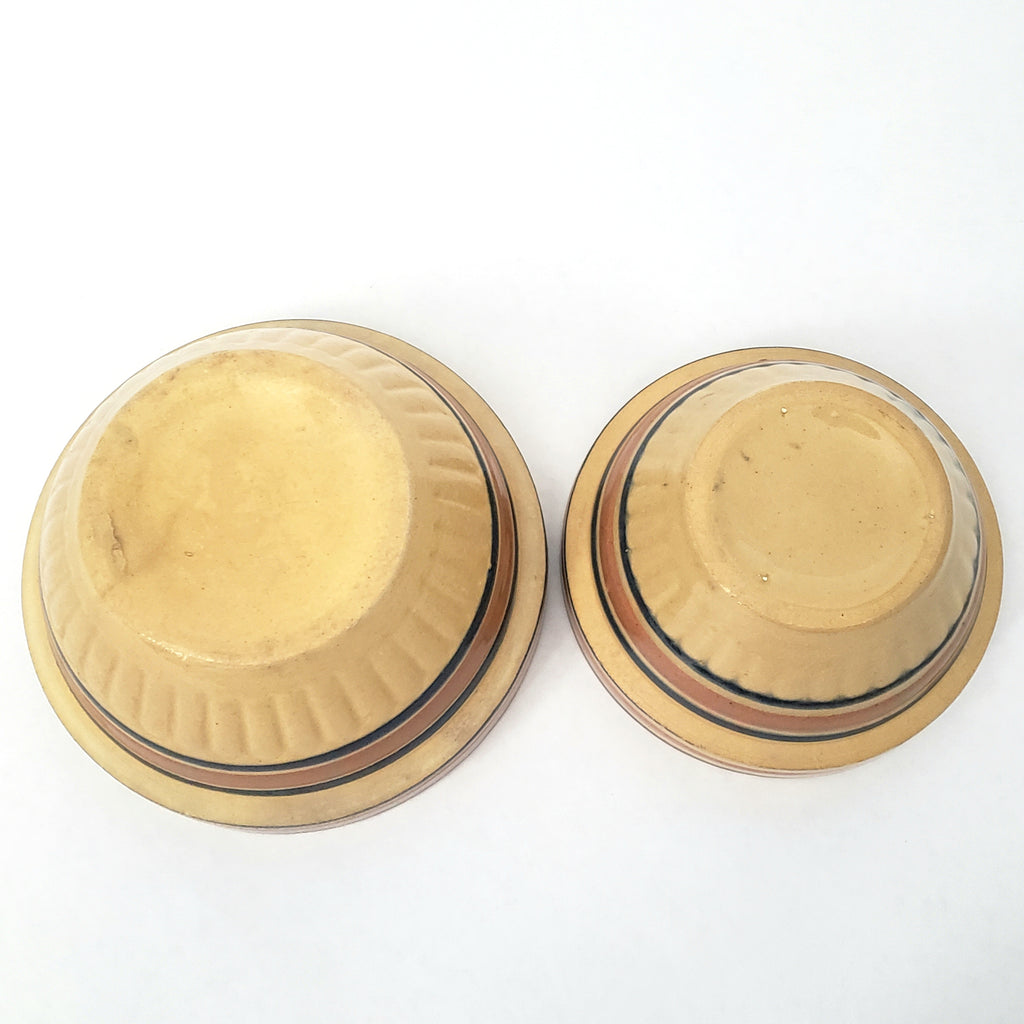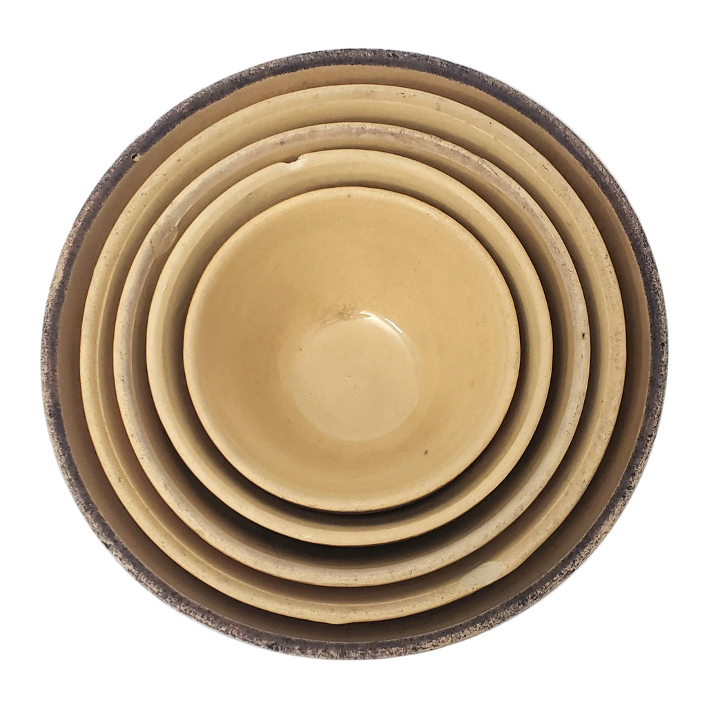 Description: Step back in time with this vintage treasure: a five-piece graduating yellow ware mixing bowl set with a rustic farmhouse appeal. With a time-worn appearance, each bowl features a distinctive taper body with wide pink and thin blue slip bands above a raised, vertical paneled arch pattern on the lower half. Diameter ranging from 5 inch to 9 1/4 inch, each bowl nests within each other, making them a charming graduating set of five. Despite showing its age and use as discussed below under "Condition", it’s not often we find a graduate set of five still together.