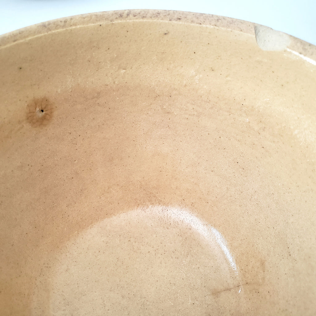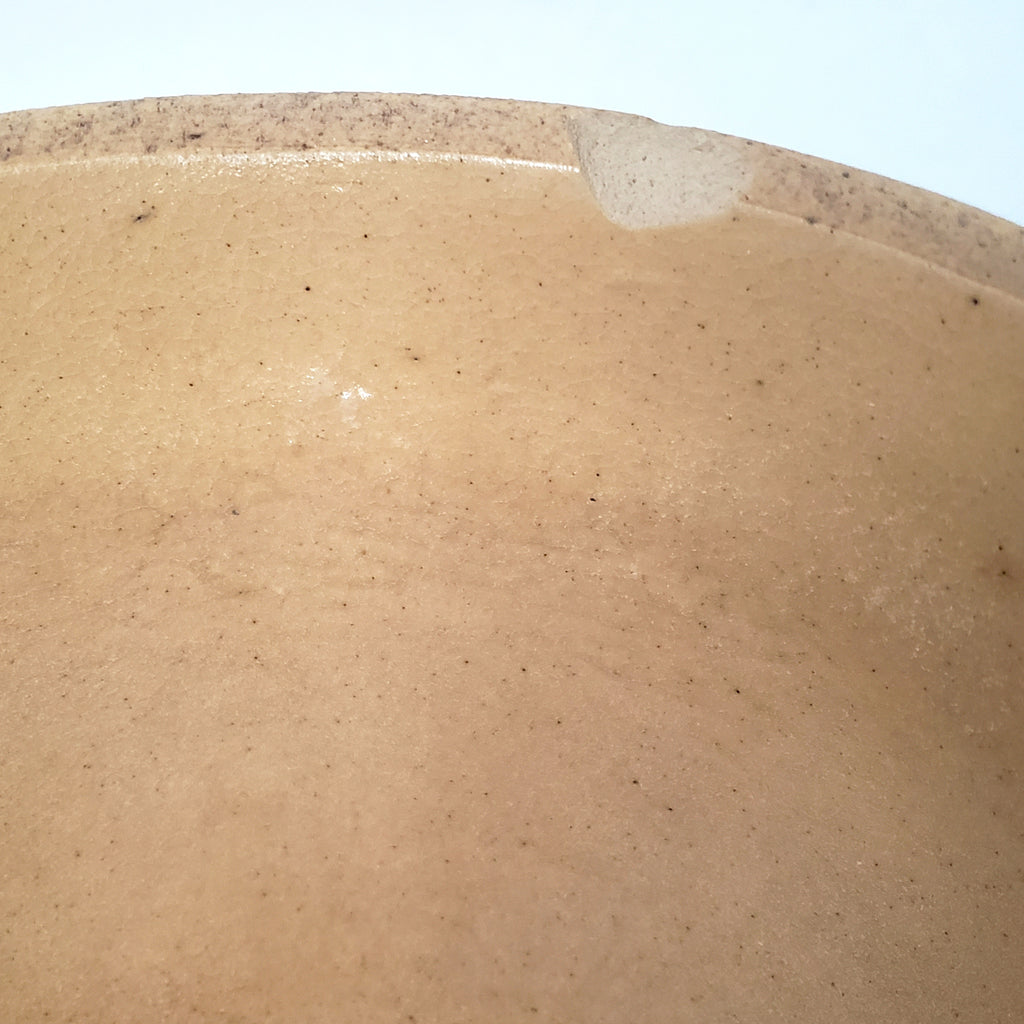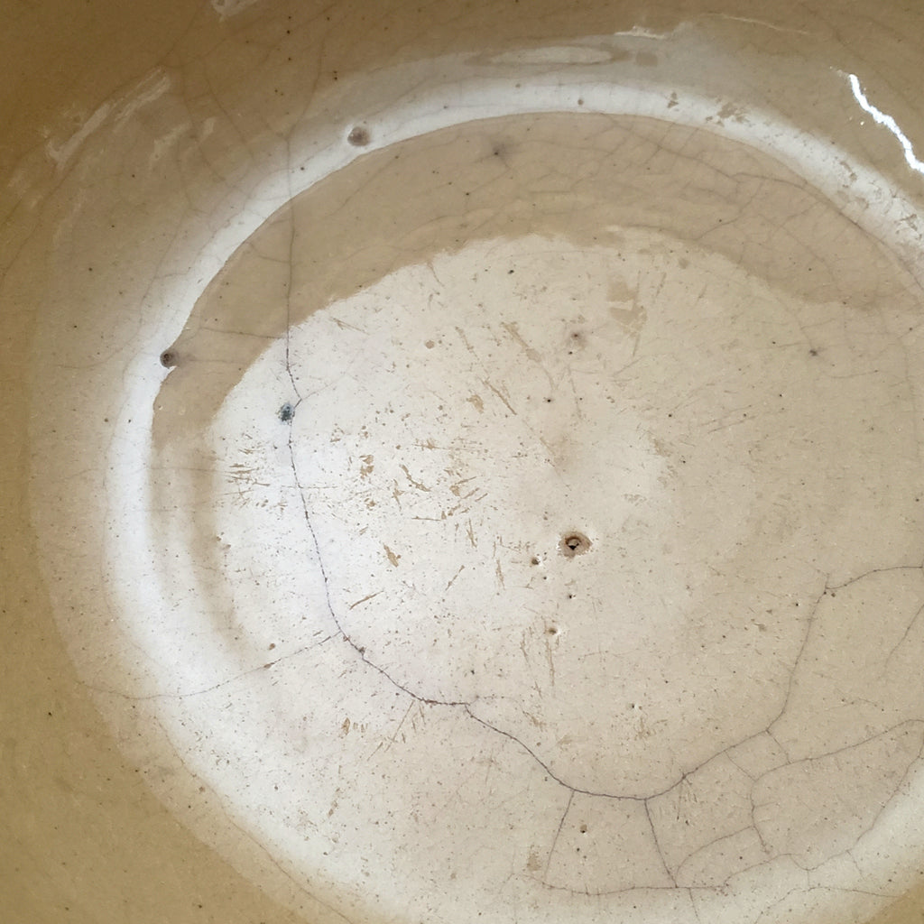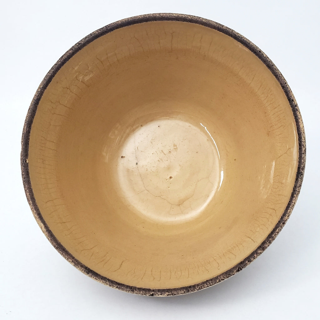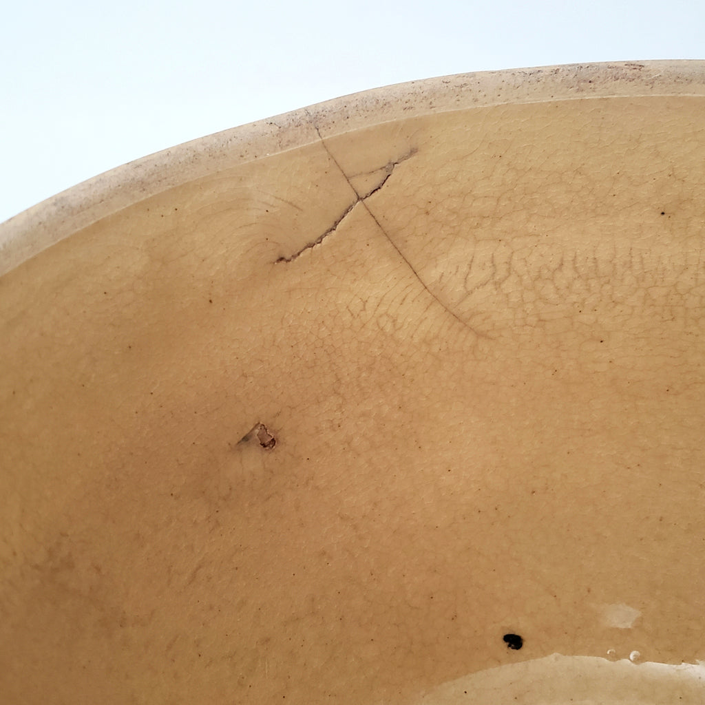 9 ¼”, Height: 5” – Dark discoloration to unglazed rim and other areas, hairline crack on inner base that goes through in areas on bottom exterior( as shown). Small nicks to rim, early small glaze chips on exterior (as shown). Extensive crazing on interior. Slightly darker discoloration on interior than other pieces.