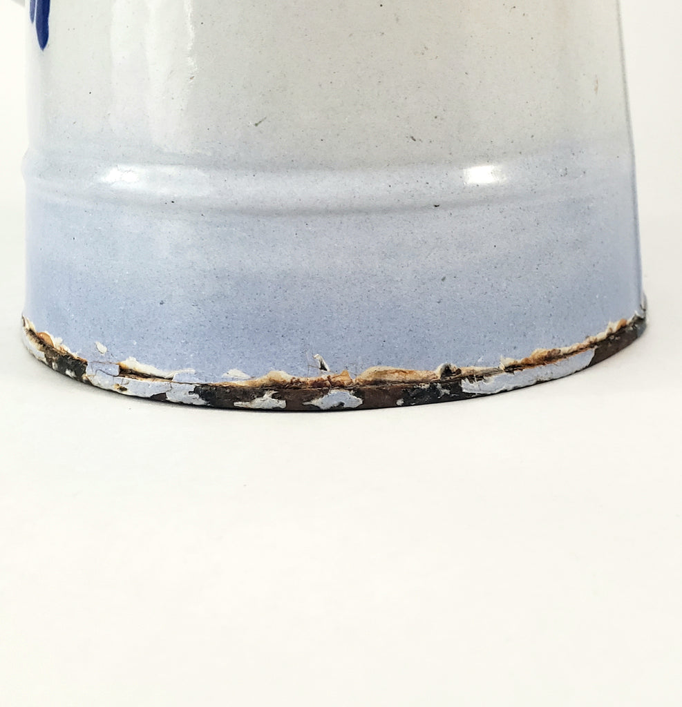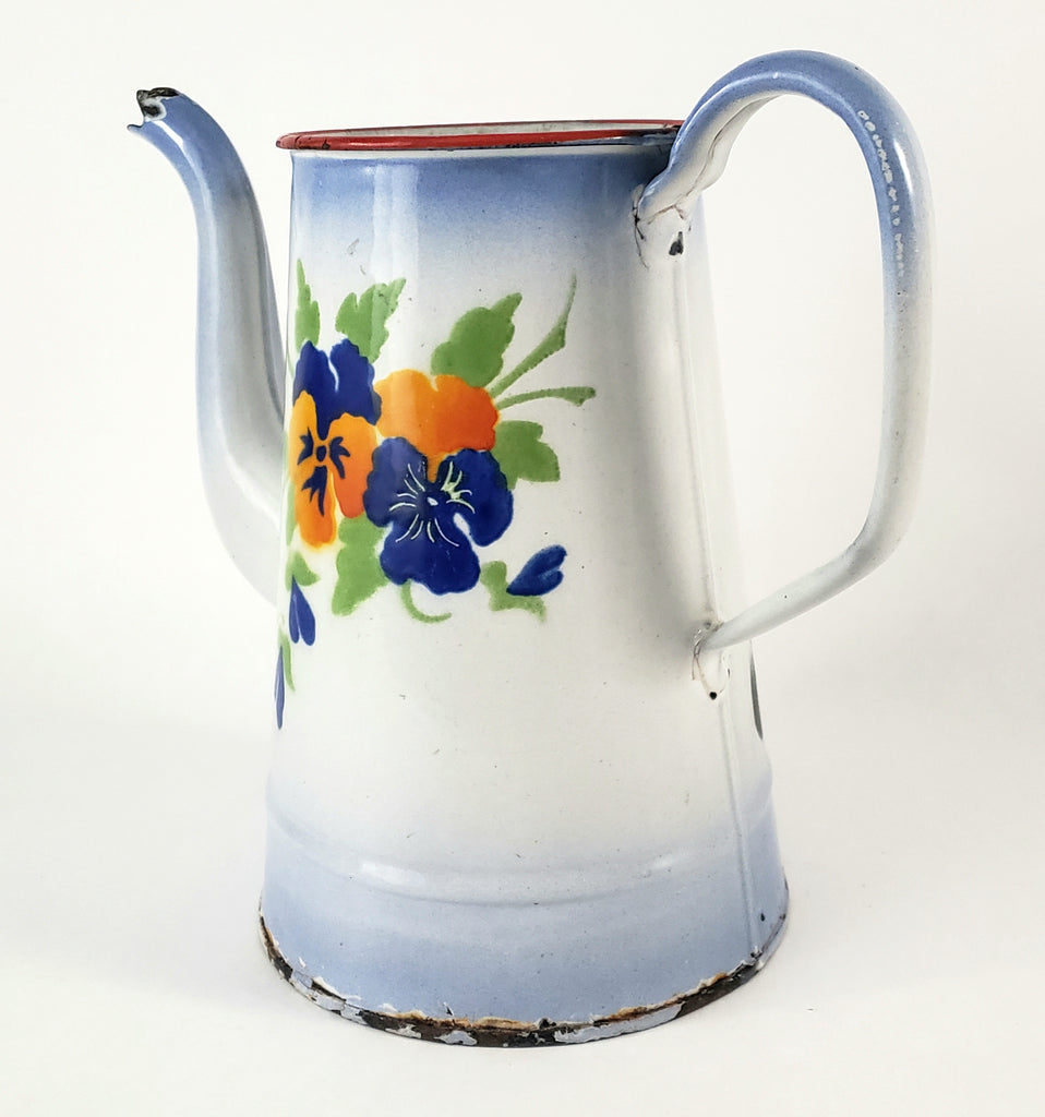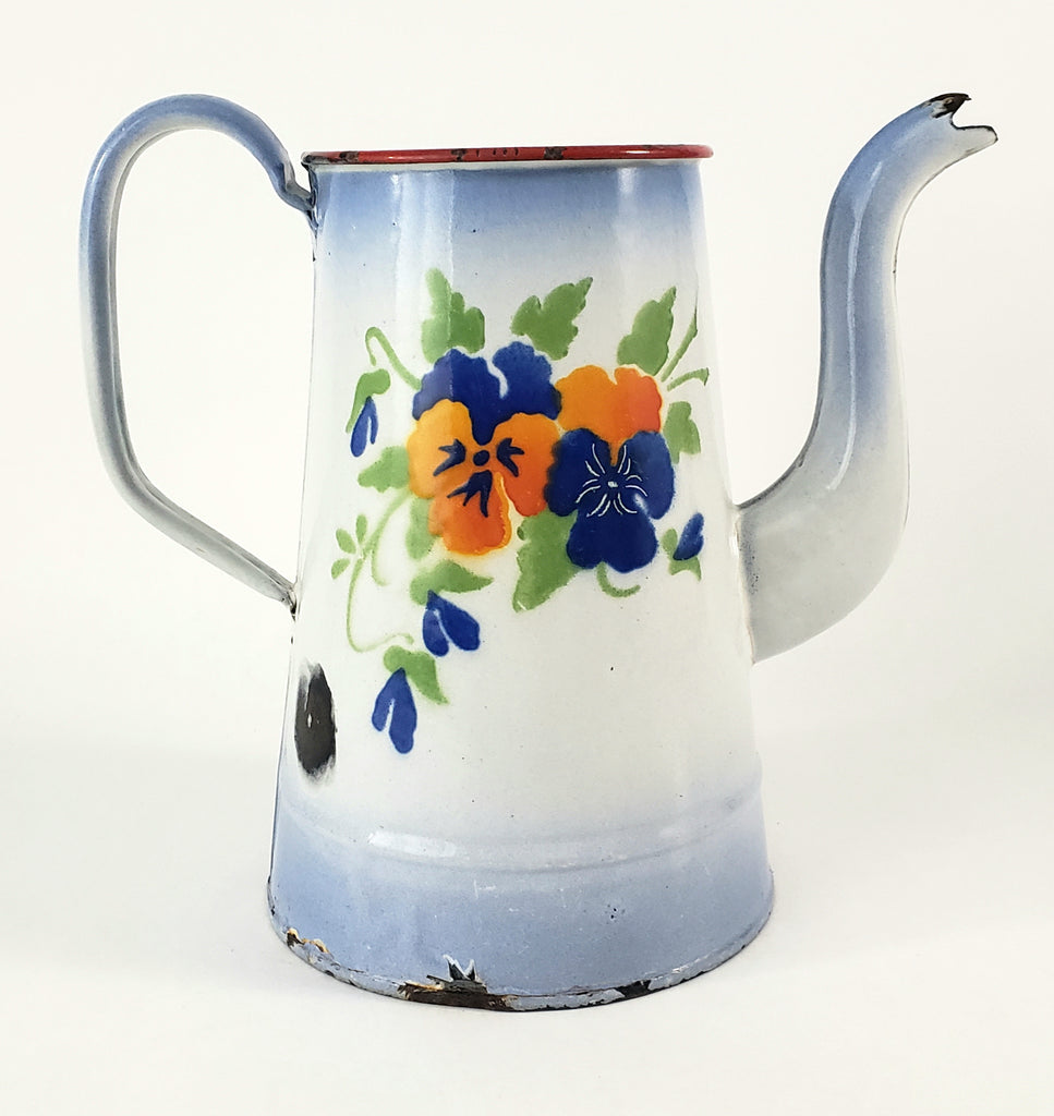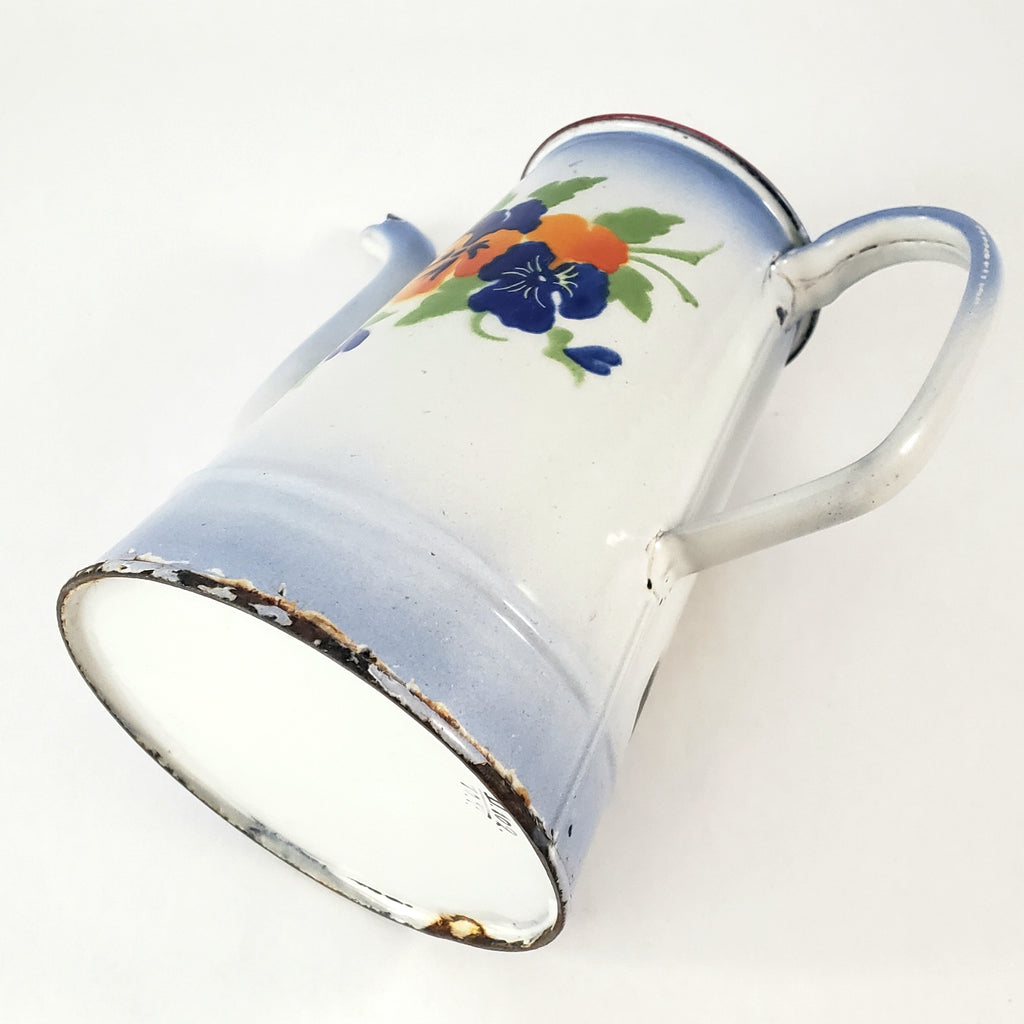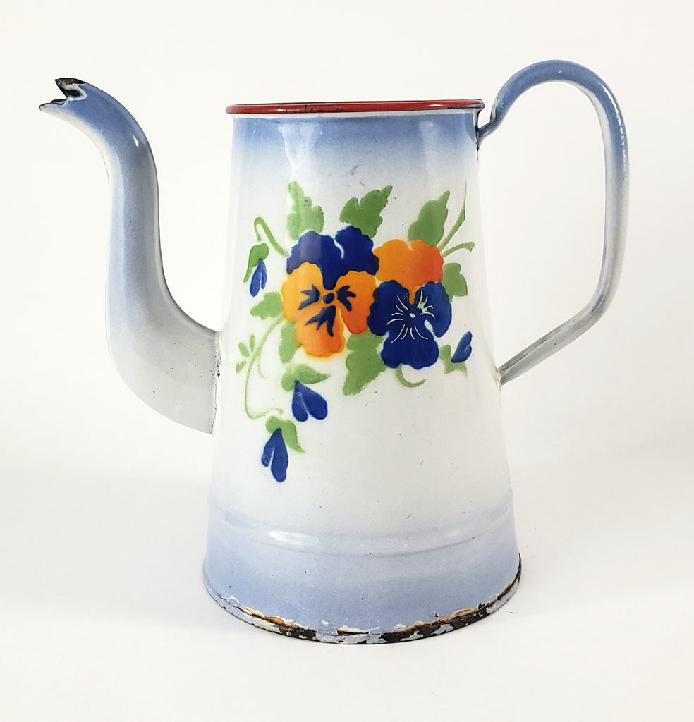 Antique French Enamelware Coffee Pot Gooseneck Spout Pansies No Lid