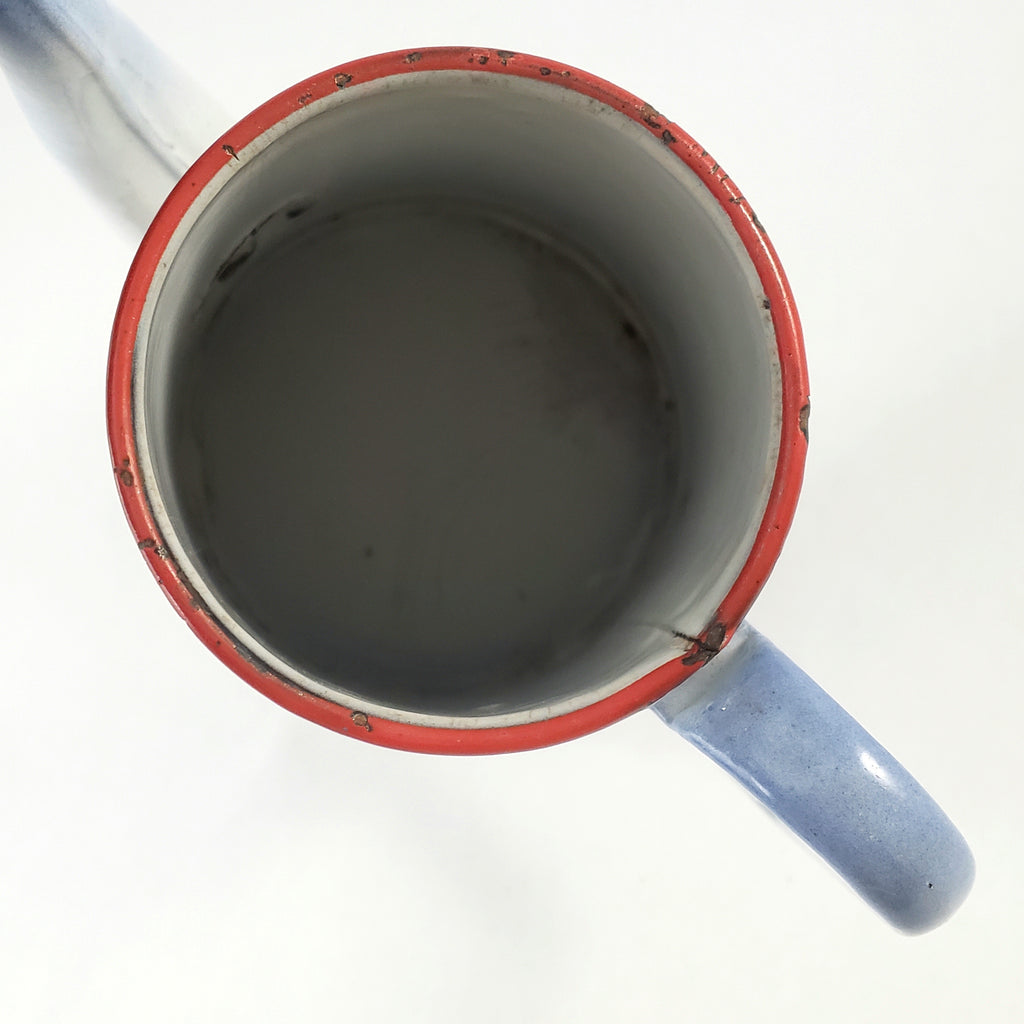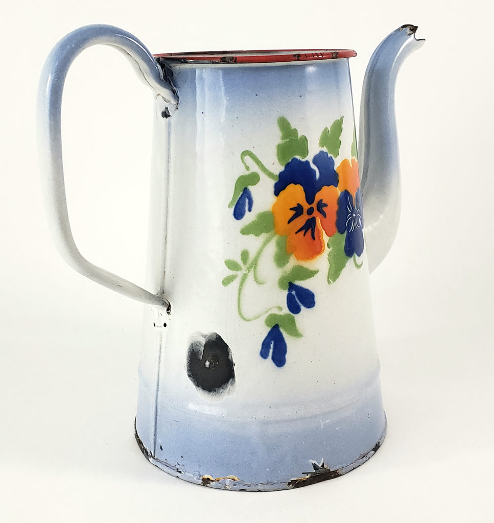 Product Description: A delightful coffee pot with a gooseneck spout for your favorite dried or faux floral arrangement. Made of metal with an enameled coating, it features two sides purple and orange pansies and green foliage on a gradient light blue background with a red rim. Its charming pattern with enamel chips adds a touch of vintage farmhouse appearance.