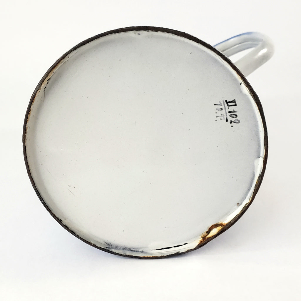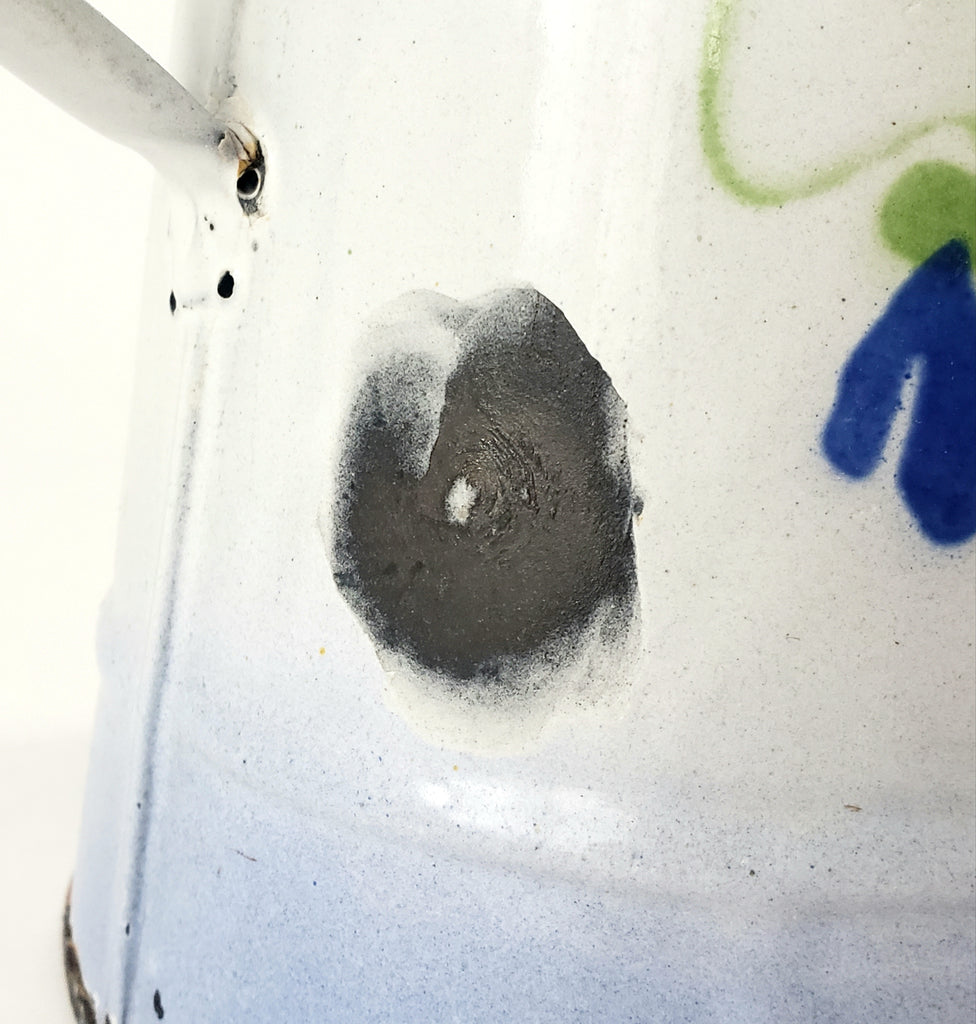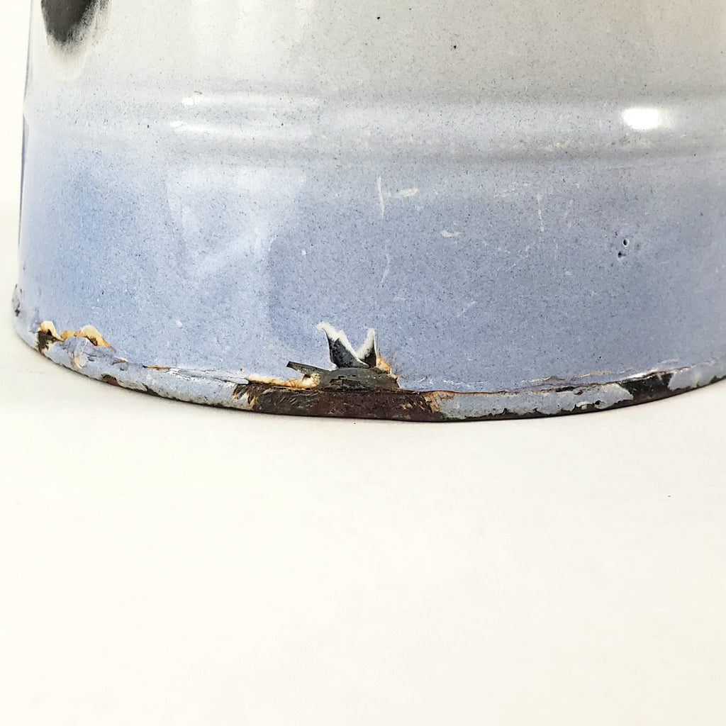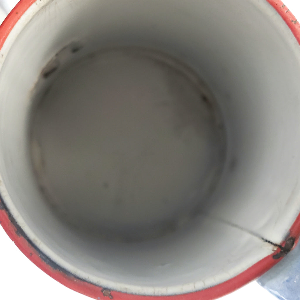 Condition: Previously owned - used. Art work is still colorful. Enamel chips on rim, edge of base and spout. One 1” x 1” enamel chip on body. Leak at bottom edge, therefore does NOT hold water. Interior exhibits some scratches and rust. No Lid.