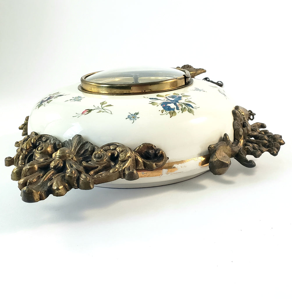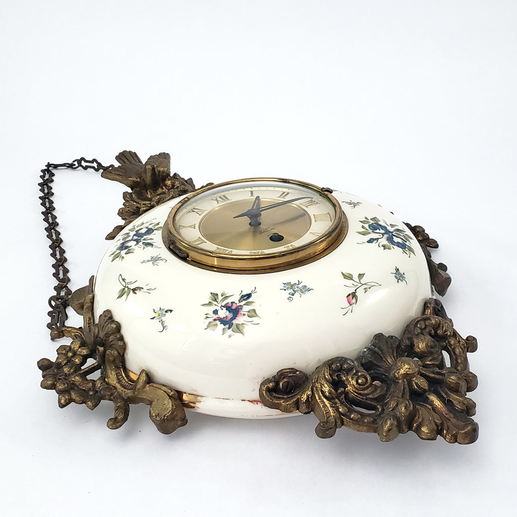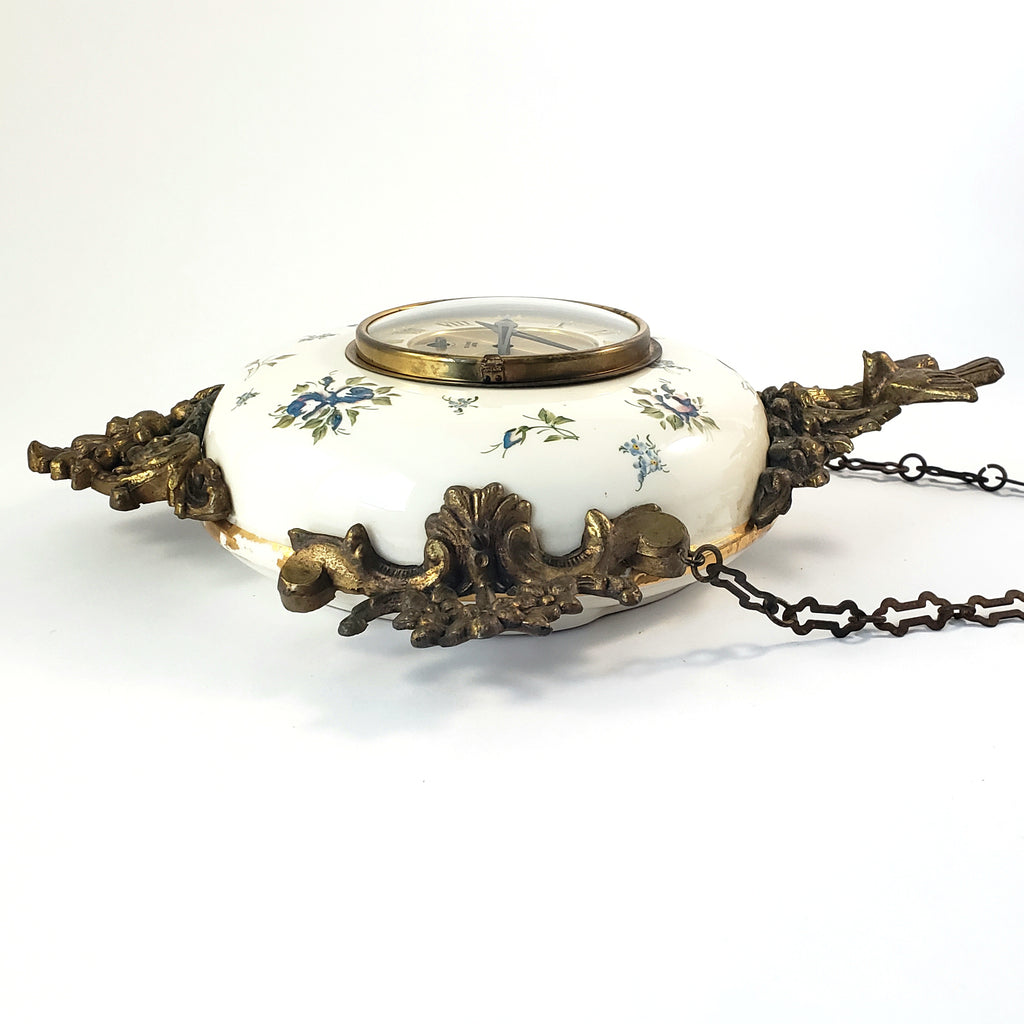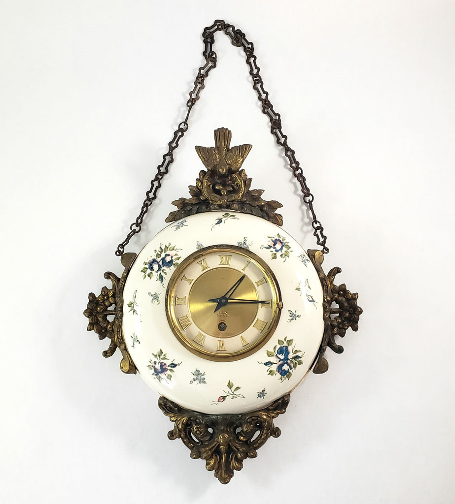 Condition: Previously owned - used. Being sold for parts and/or restoration or wall decoration only. Not tested – likely not in working order. Original chain is still intact. Face Casing and cover are in good condition. Latch on cover is in working condition. Some wear to hand-painted floral designs on porcelain and gold gilt around sides of clock. Brass bird accent is tight and solid to clock. Other three brass accents have some movement and/or loose although in good condition. Based on wear around back cover hardware, it appears it was previously taken off therefore not known what parts are still intact, replaced and/or in proper condition. Missing key. Please refer to photographs or reach out with inquiries.
