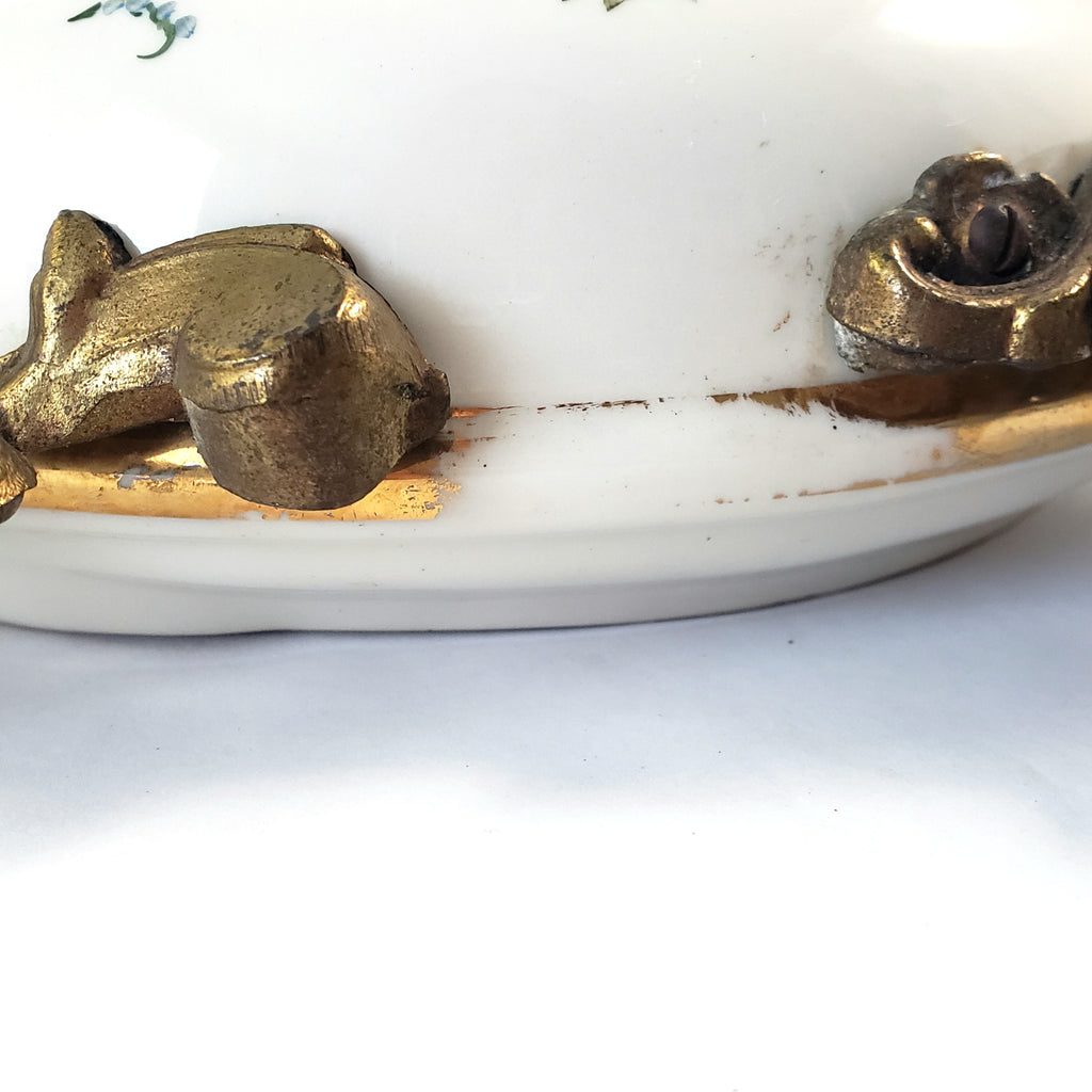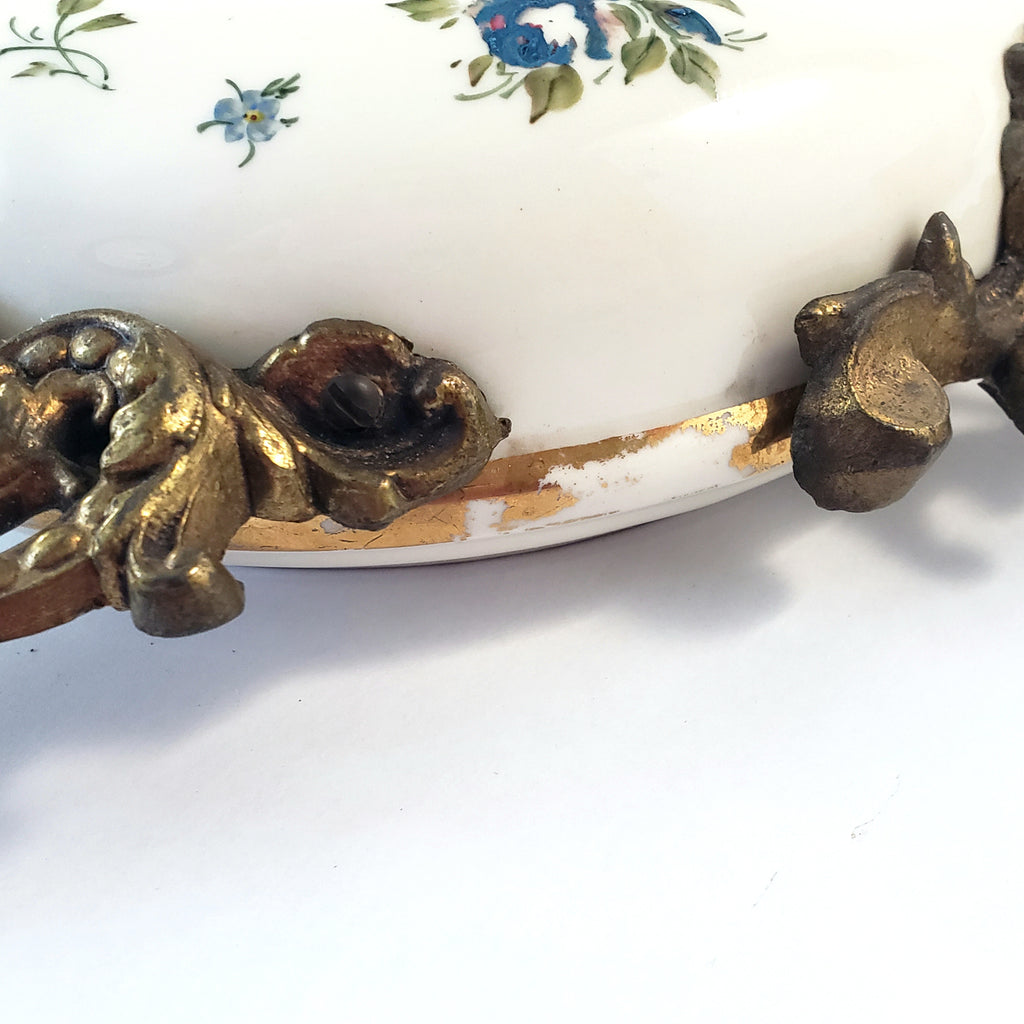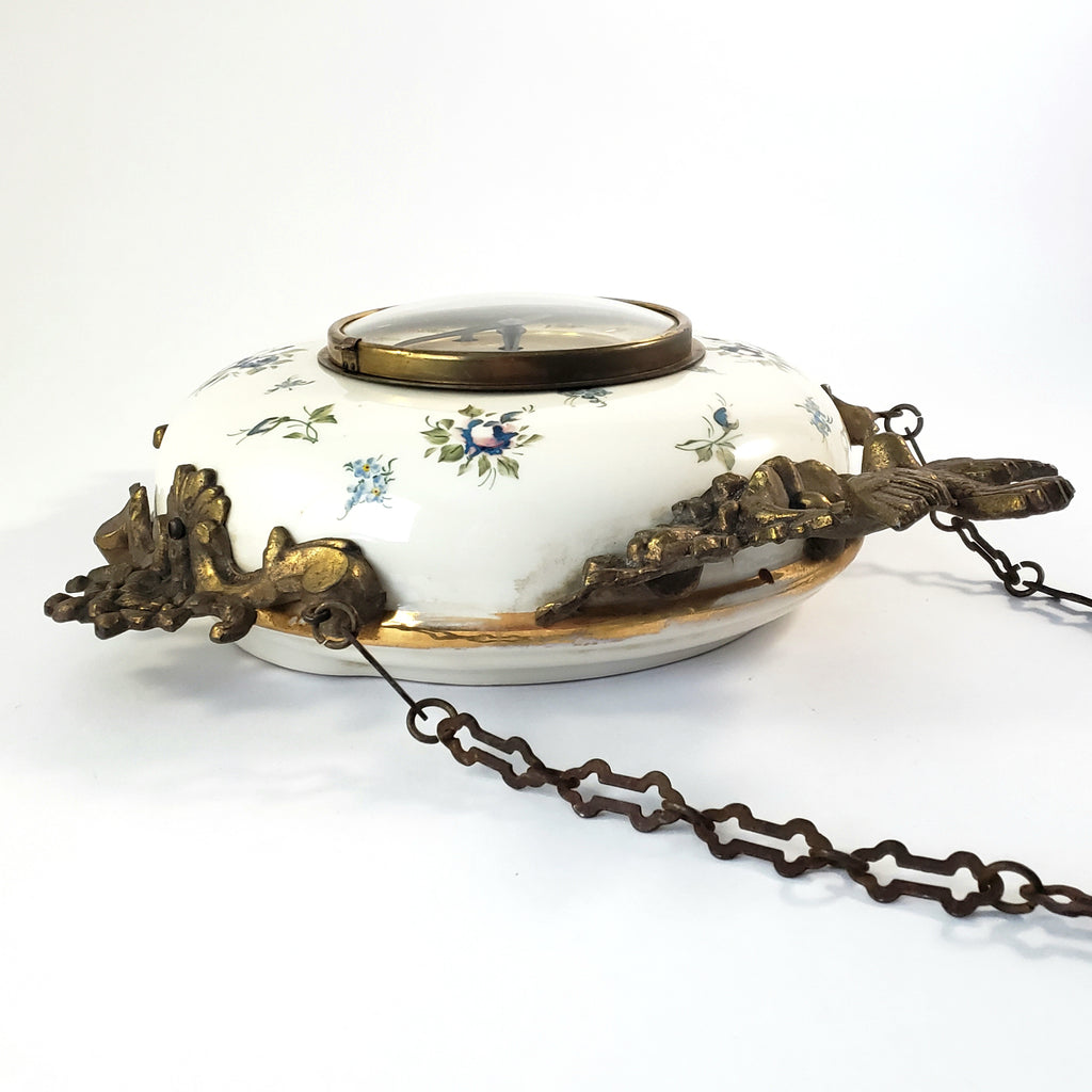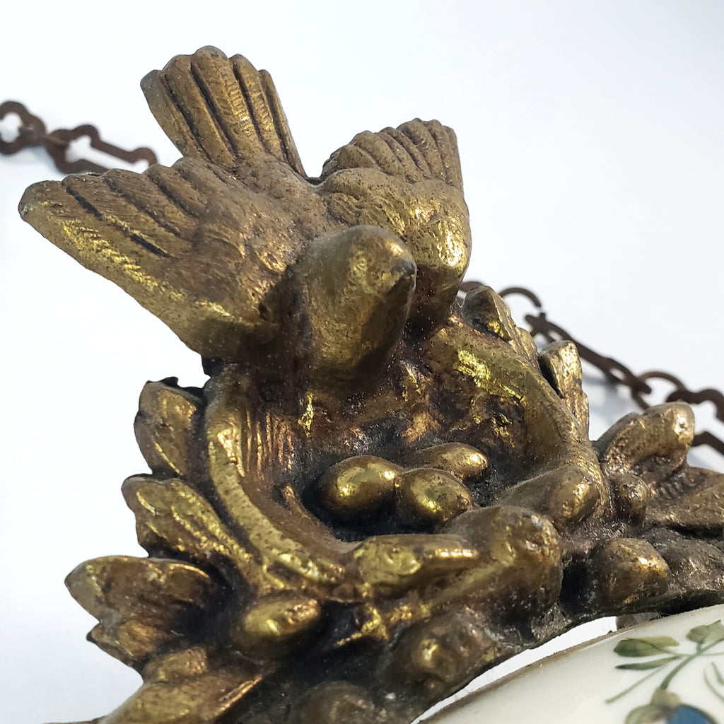 Condition: Previously owned - used. Being sold for parts and/or restoration or wall decoration only. Not tested – likely not in working order. Original chain is still intact. Face Casing and cover are in good condition. Latch on cover is in working condition. Some wear to hand-painted floral designs on porcelain and gold gilt around sides of clock. Brass bird accent is tight and solid to clock. Other three brass accents have some movement and/or loose although in good condition. Based on wear around back cover hardware, it appears it was previously taken off therefore not known what parts are still intact, replaced and/or in proper condition. Missing key. Please refer to photographs or reach out with inquiries.