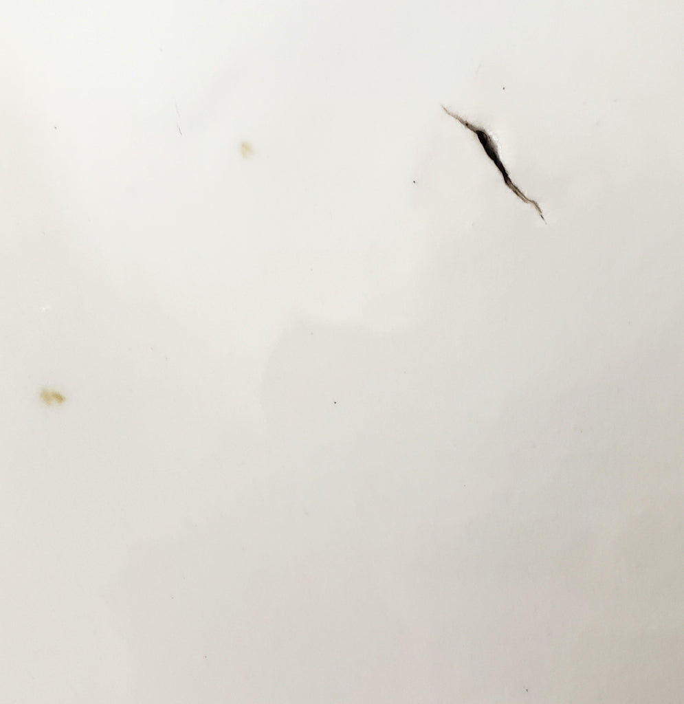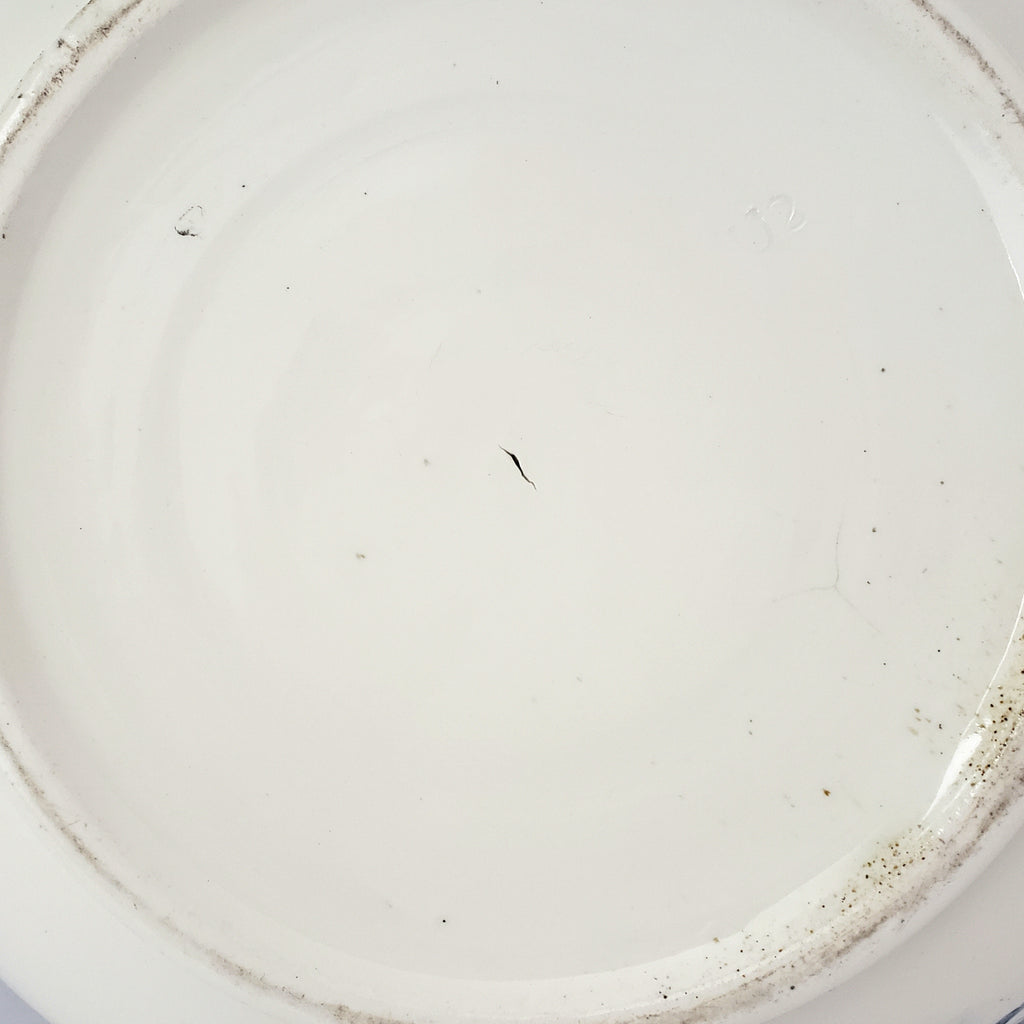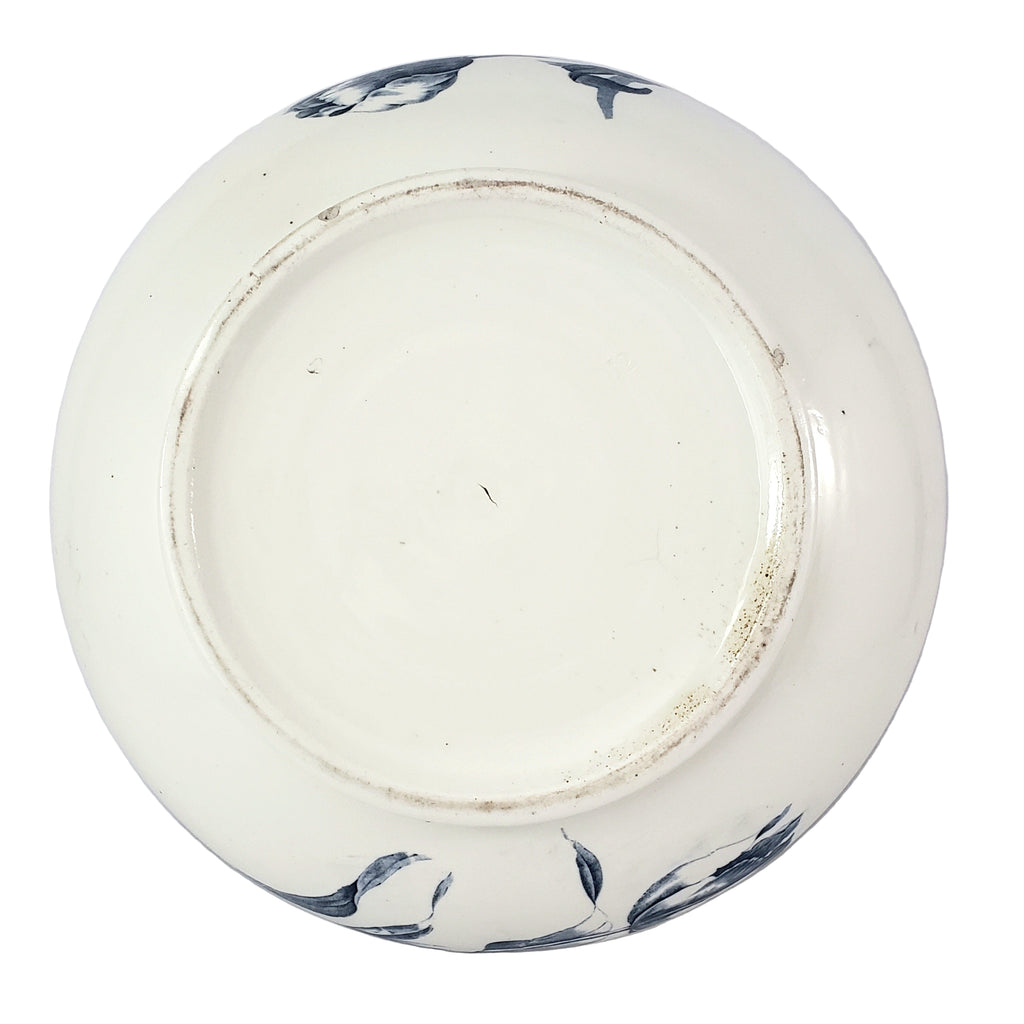 Condition:  Previously owned - used.  Condition is consistent with age and use. Blue decoration in good condition. No cracks - holds water. Due to age and use, spotty discoloration on side of round footed base (towards back-side) and what appears to be discolored glaze pops on inner body, area of a raised clay particle on exterior, ¼ deep glaze scratch in bottom base and two 1/4"chips on underneath rim of footed base (one is more of a scrape). Still sits firmly.