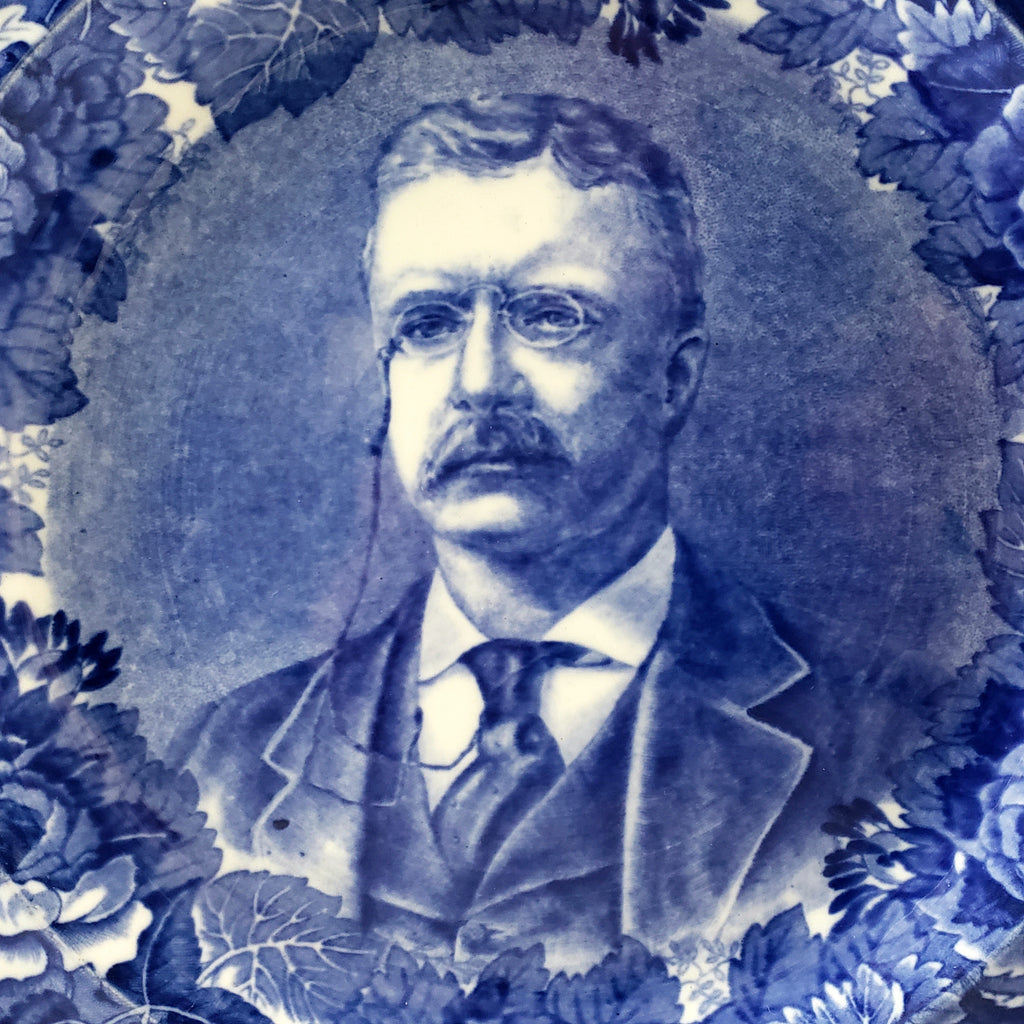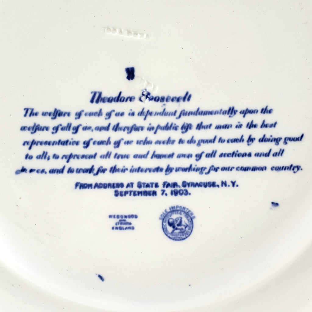 Description: This Historical Blue Commemorative Plate depicting Theodore Roosevelt captures a moment in American history with stunning artistry. Crafted by Wedgwood in Staffordshire, England and imported by Jones, McDuffie & Stratton, Boston, Massachusetts, this commemorative plate features a central image of a cobalt blue transfer-printed bust portrait of Theodore Roosevelt. The inner edge showcases an ornate floral and leaf pattern with a thin geometric band. The back is a printed text from Theodore Roosevelt’s address at the State Fair in Syracuse, NY on September 7, 1903. A special addition for your historical plate collection or anyone seeking an authentic conversation piece about American history.