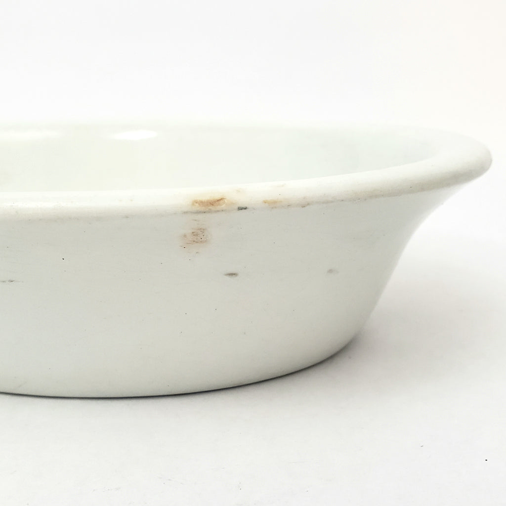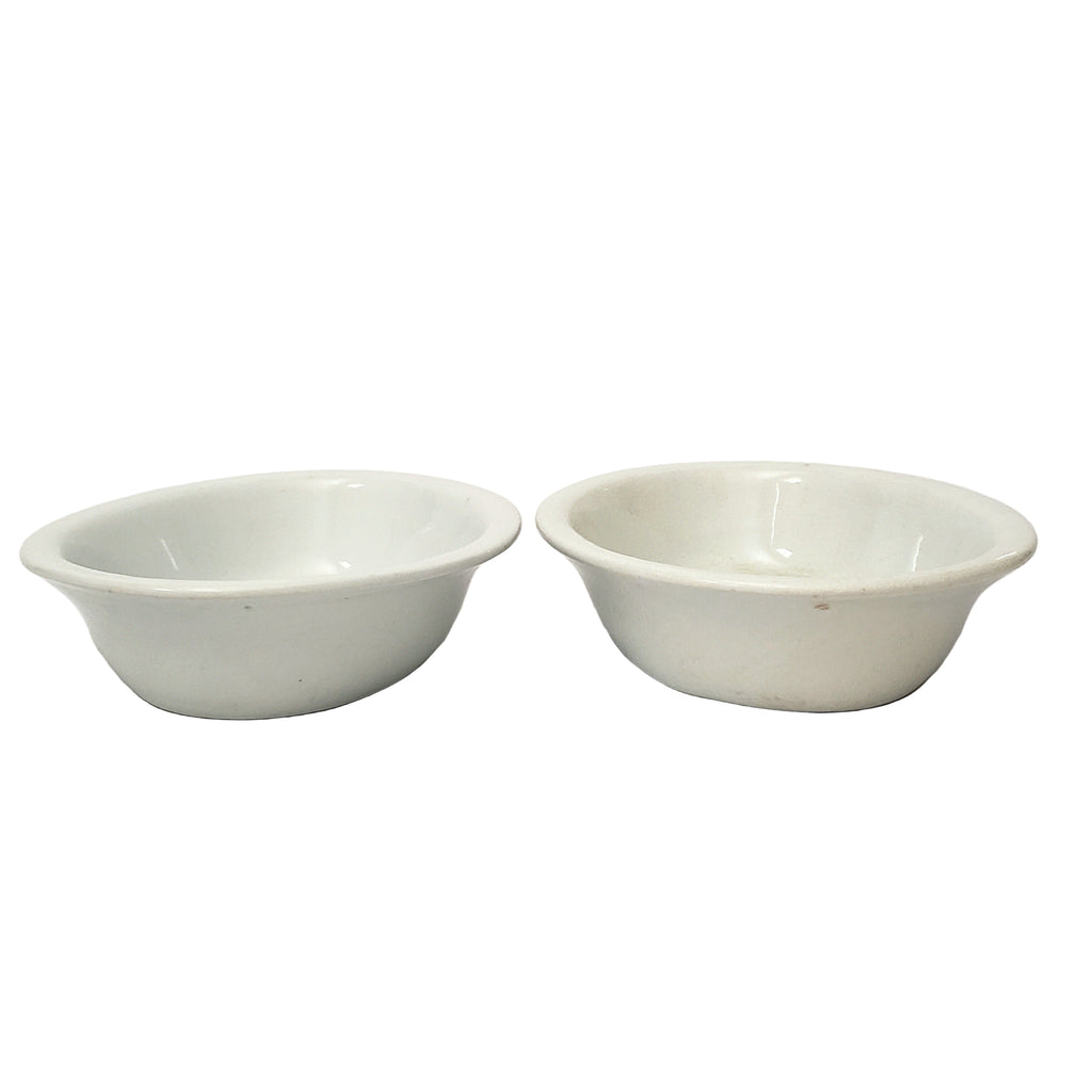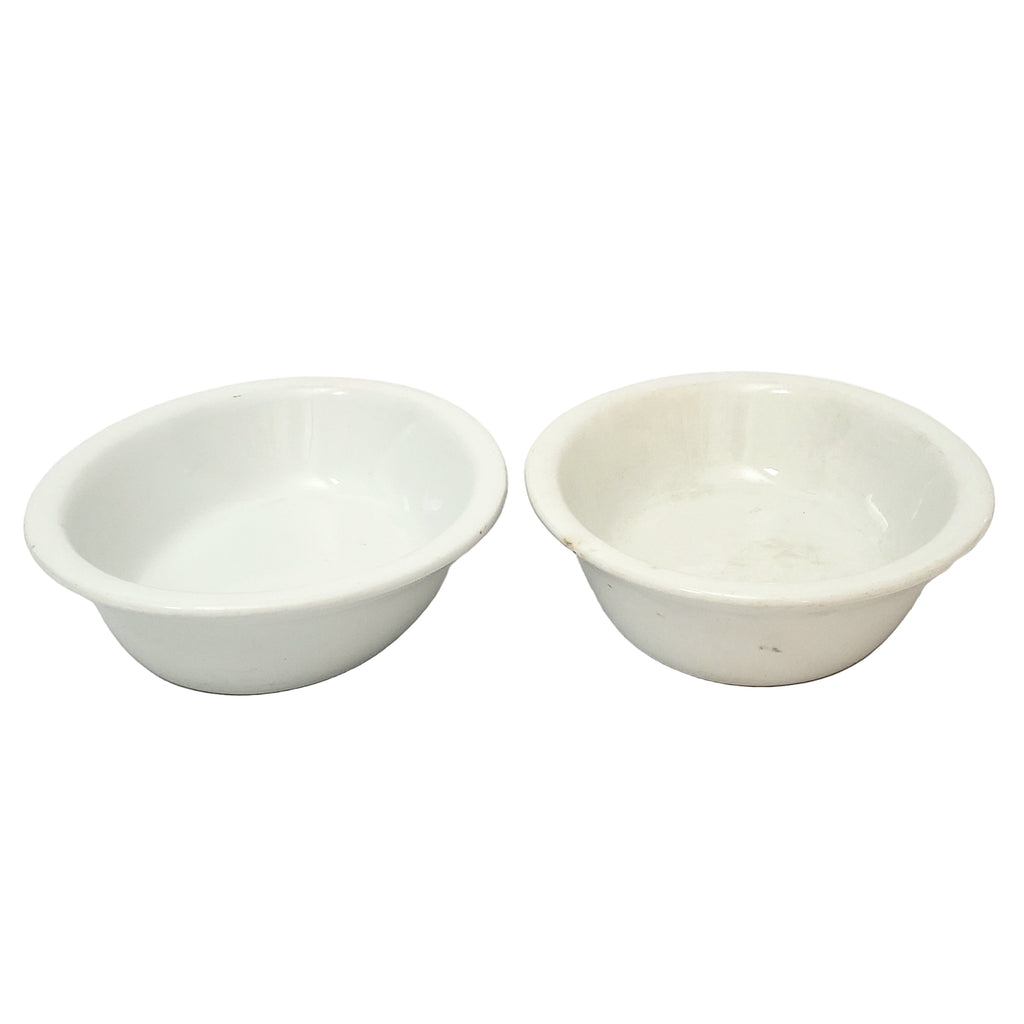 Condition: Previously owned – used. Signs of use with scratches and discoloration and crazing. Whiter surface on one bowl with signs of scratches on inner and exterior base. All over crazing is clear on 2nd bowl with areas of discoloration and aging to interior, exterior including rim. Nick to bottom base. Stilt marks from the making of the pottery are present on the back of the bowls. Being sold for decorating purposes, no longer for food use.