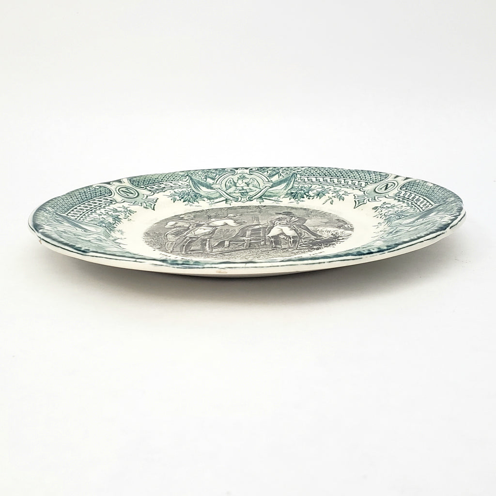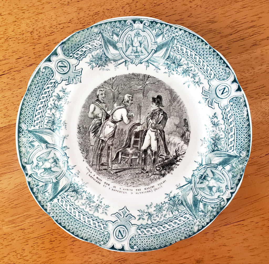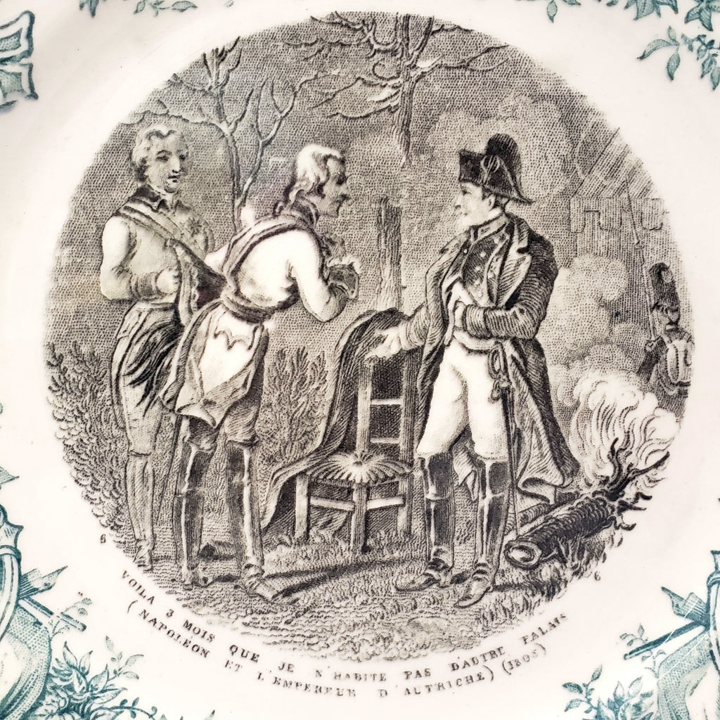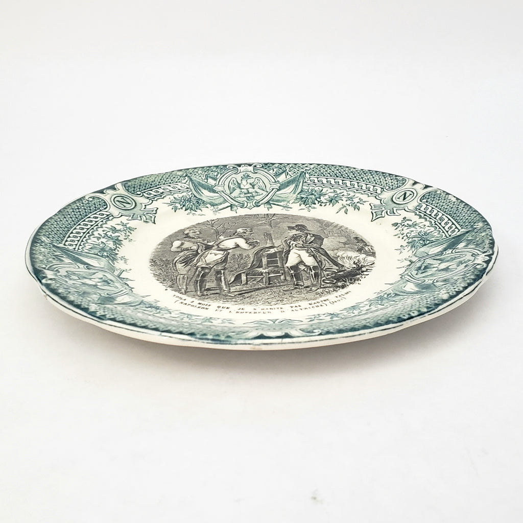 Description: A delightful French Bi-Color Transferware Plate crafted by Digoin & Sarreguemines, a French tableware manufacture. This 7 ½ inch ceramic salad or dessert plate showcases a black transfer-printed Napoleonic scene, a caption and a green – teal color decorative border on a creamy white background.