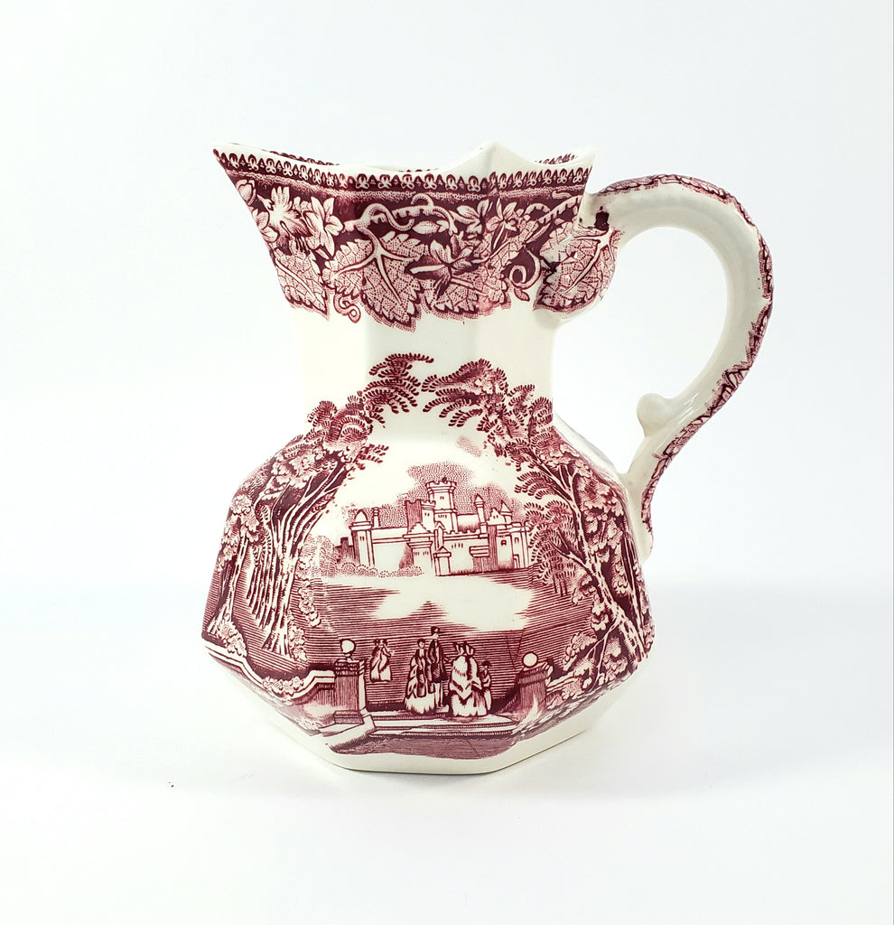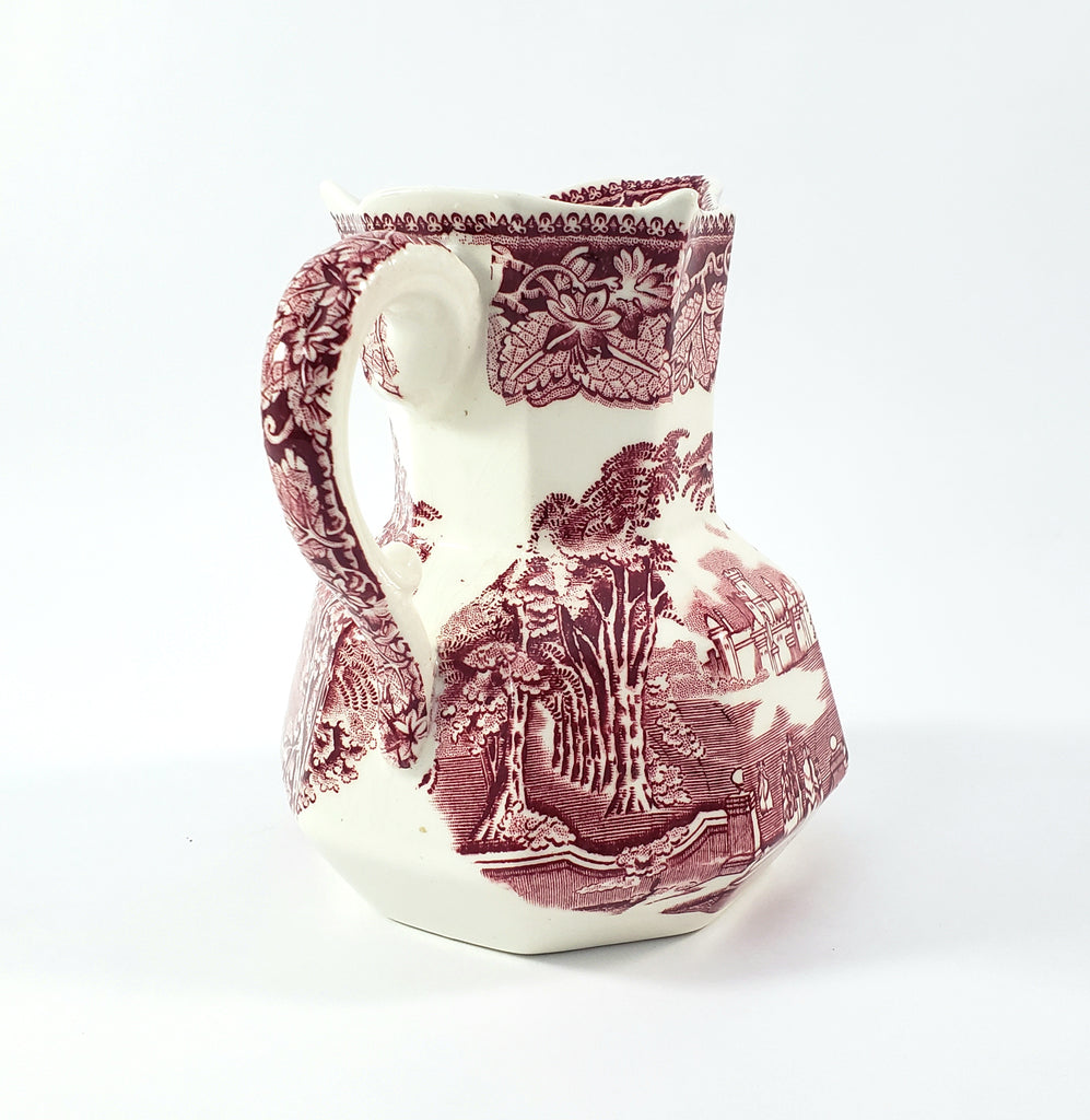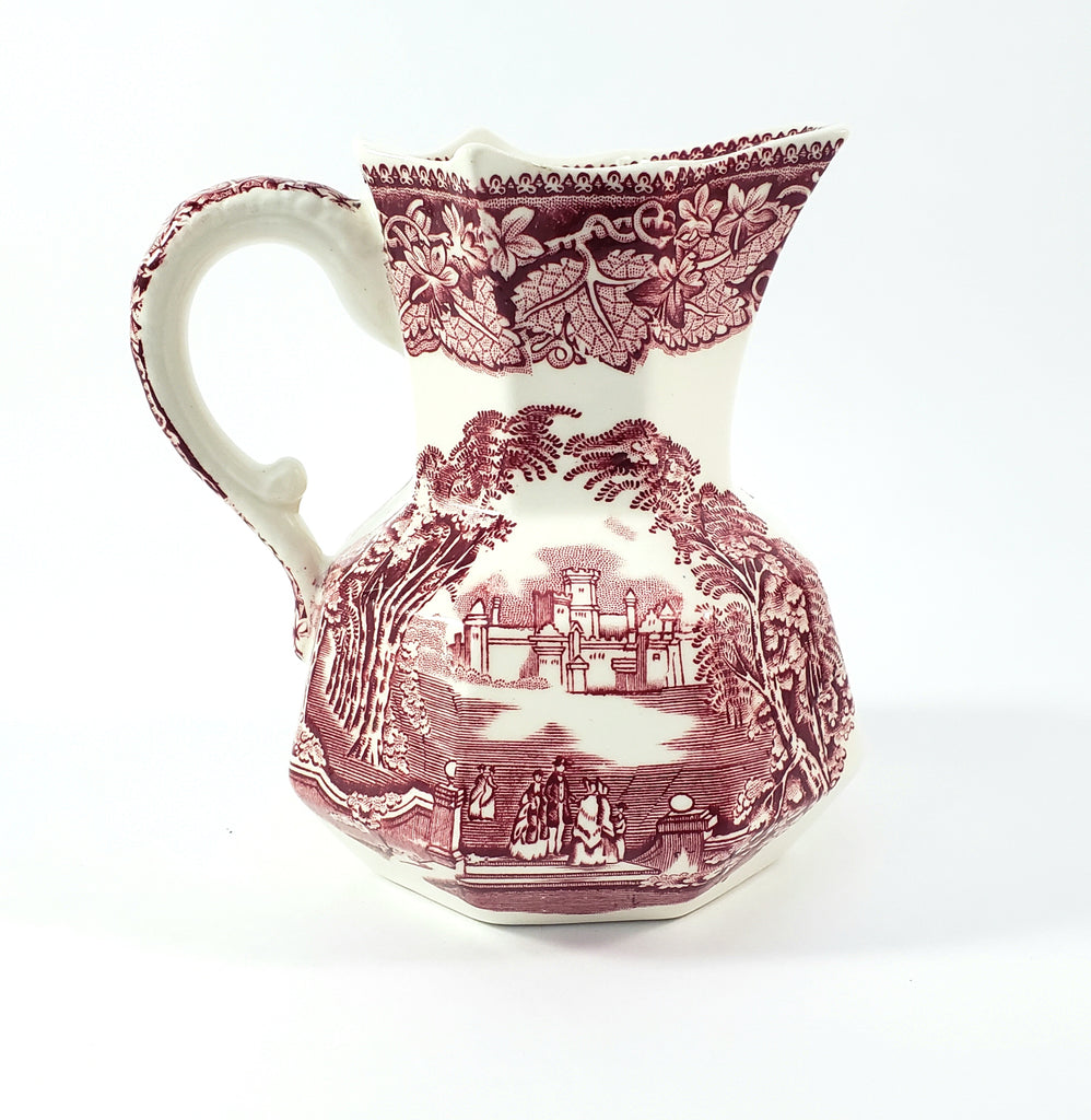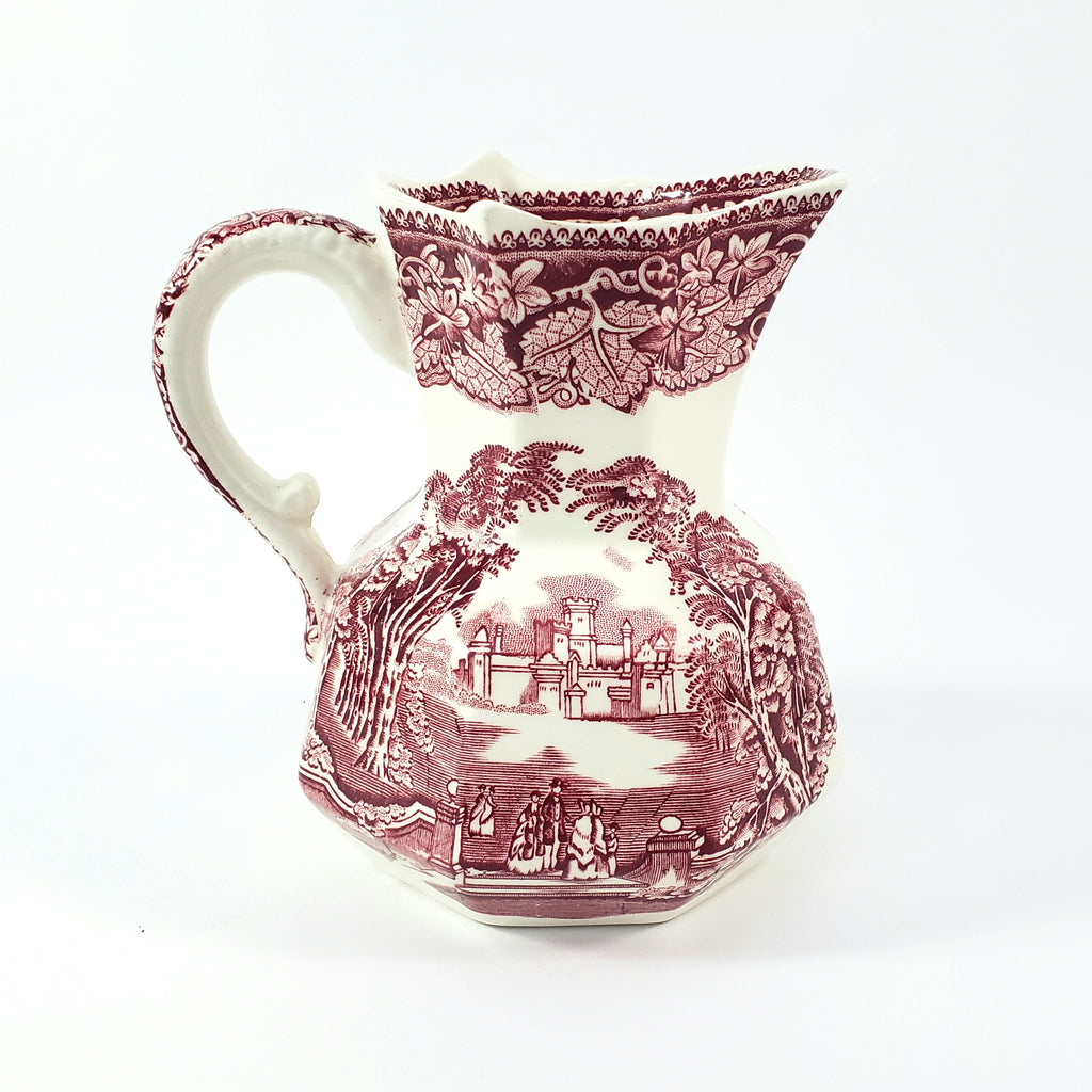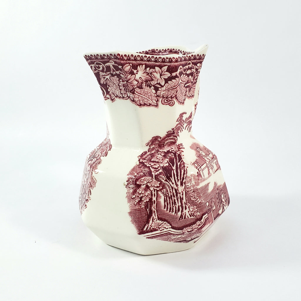 Product Description: This English Ironstone Octagonal Creamer Jug in the VISTA red transfer pattern on a creamy white will add charm to your home décor. Measuring 5 1/4 inches tall, two sides feature an English park-like scene with wispy trees, period figures, a castle in the background and a highly decorative border of leaves and vines with a pointed rim. An essential addition for ironstone enthusiasts and those who appreciate authentic English craftsmanship.