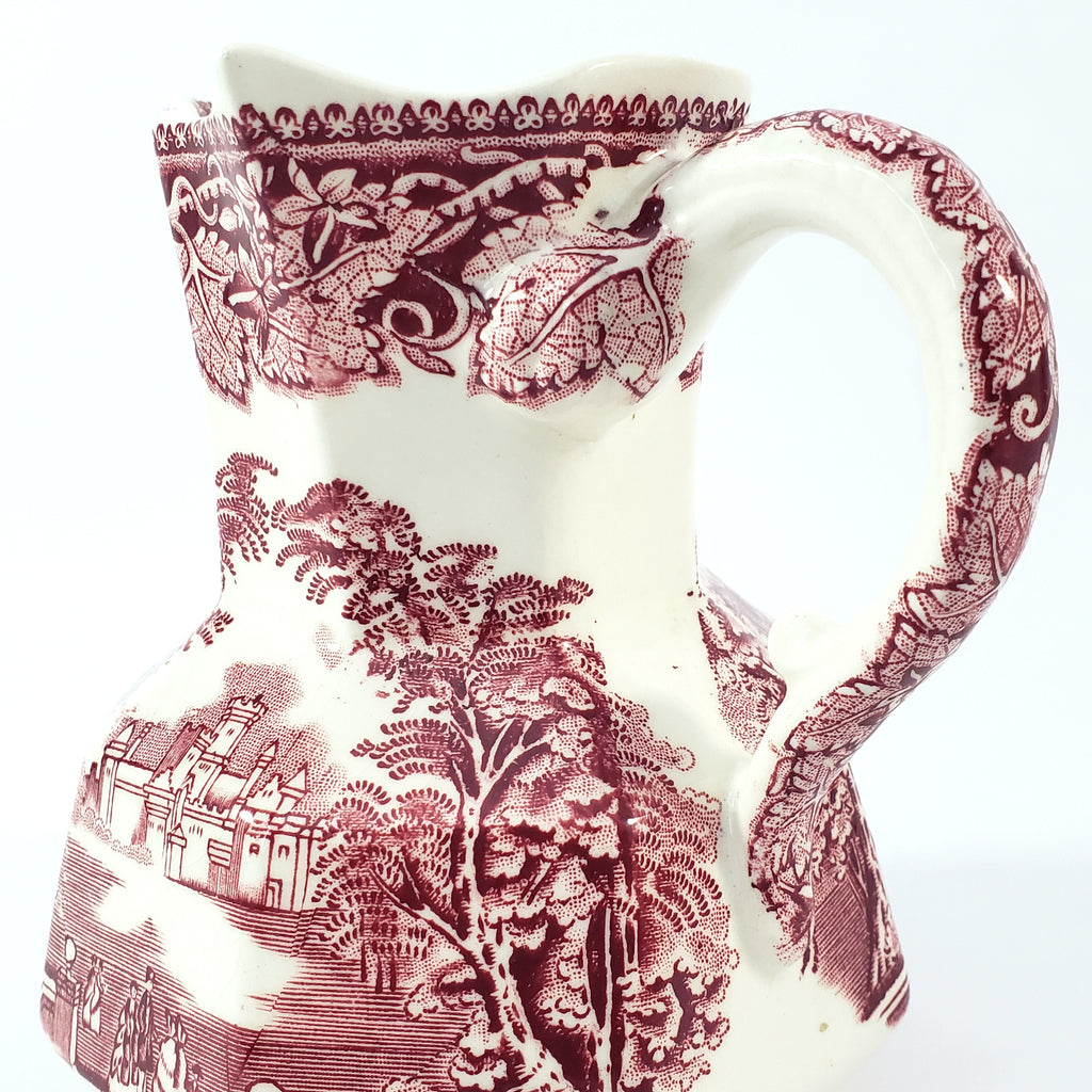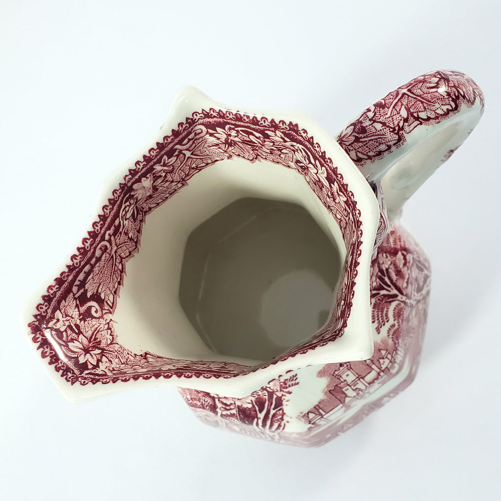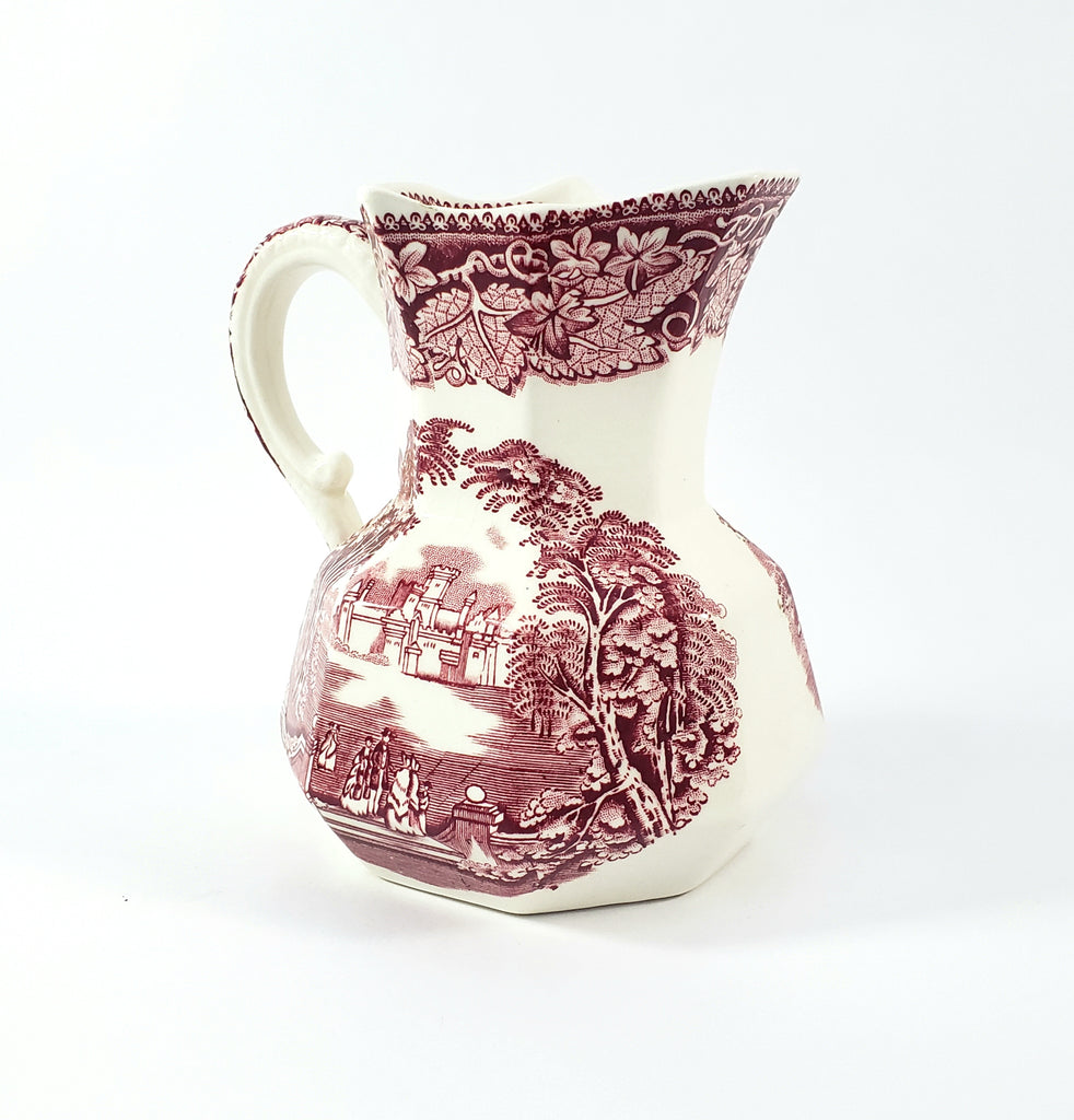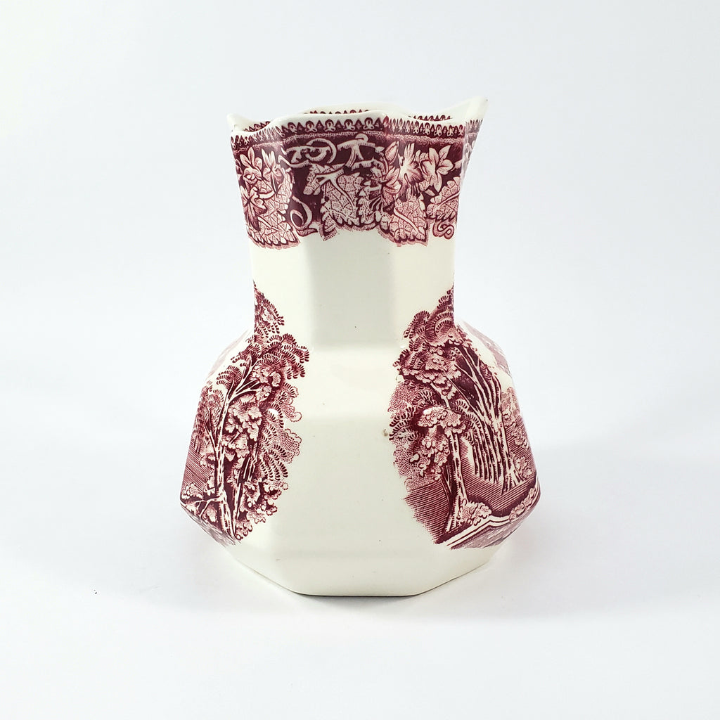 Product Description: This English Ironstone Octagonal Creamer Jug in the VISTA red transfer pattern on a creamy white will add charm to your home décor. Measuring 5 1/4 inches tall, two sides feature an English park-like scene with wispy trees, period figures, a castle in the background and a highly decorative border of leaves and vines with a pointed rim. An essential addition for ironstone enthusiasts and those who appreciate authentic English craftsmanship.