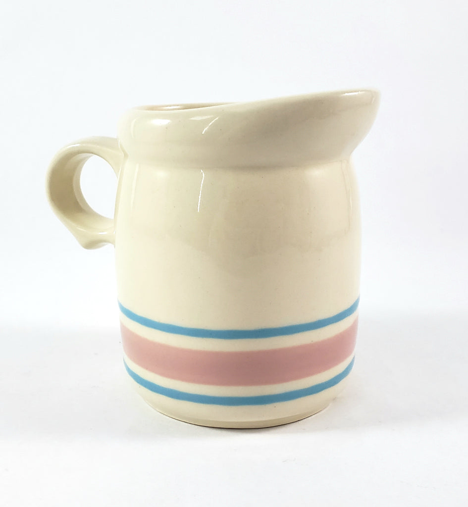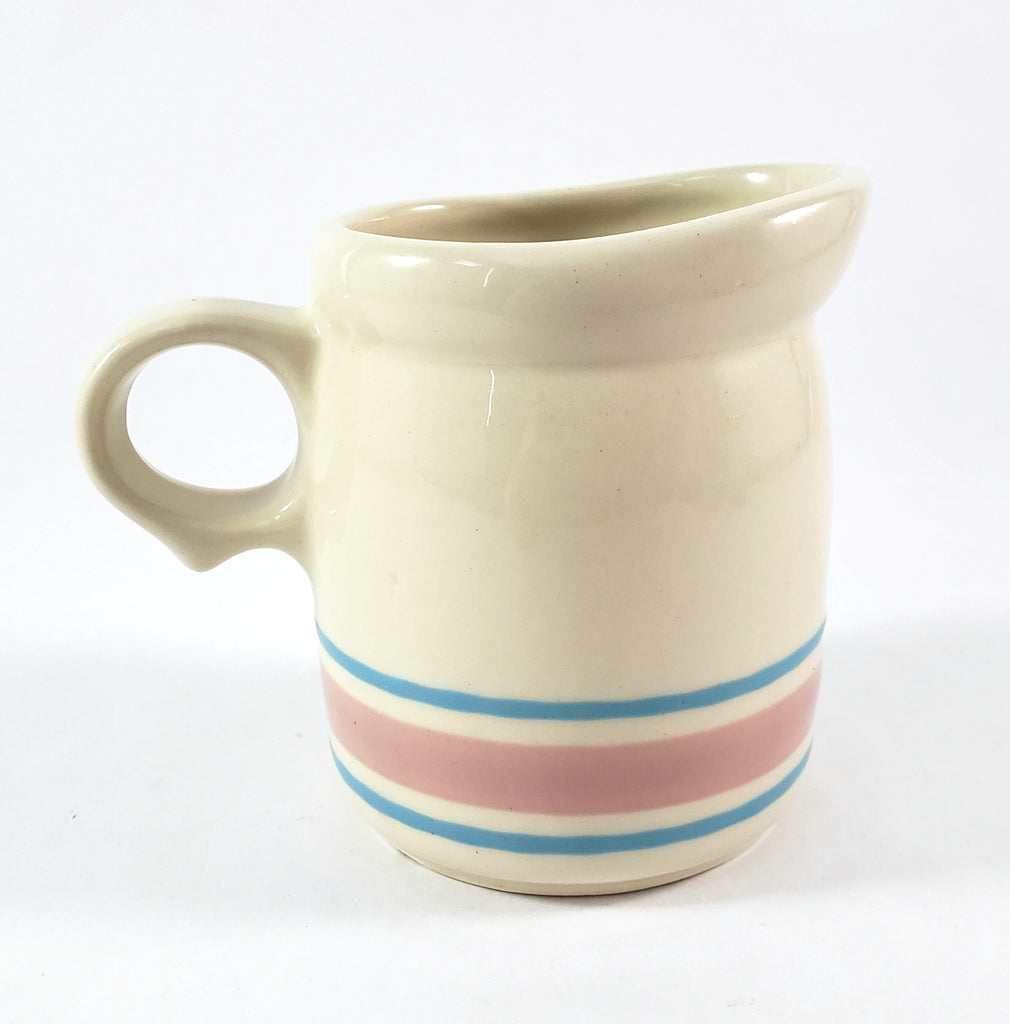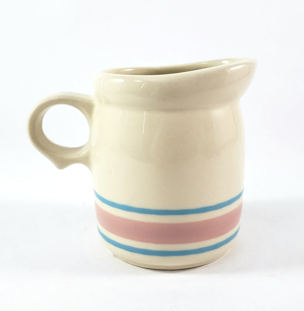 Product Description: This McCoy stoneware creamer is part of the Stone Craft Pink and Blue Dinnerware Line. It features a cream-tone surface accented by one pink and two thin blue bands that encircle the piece, reflecting the quality craftsmanship.