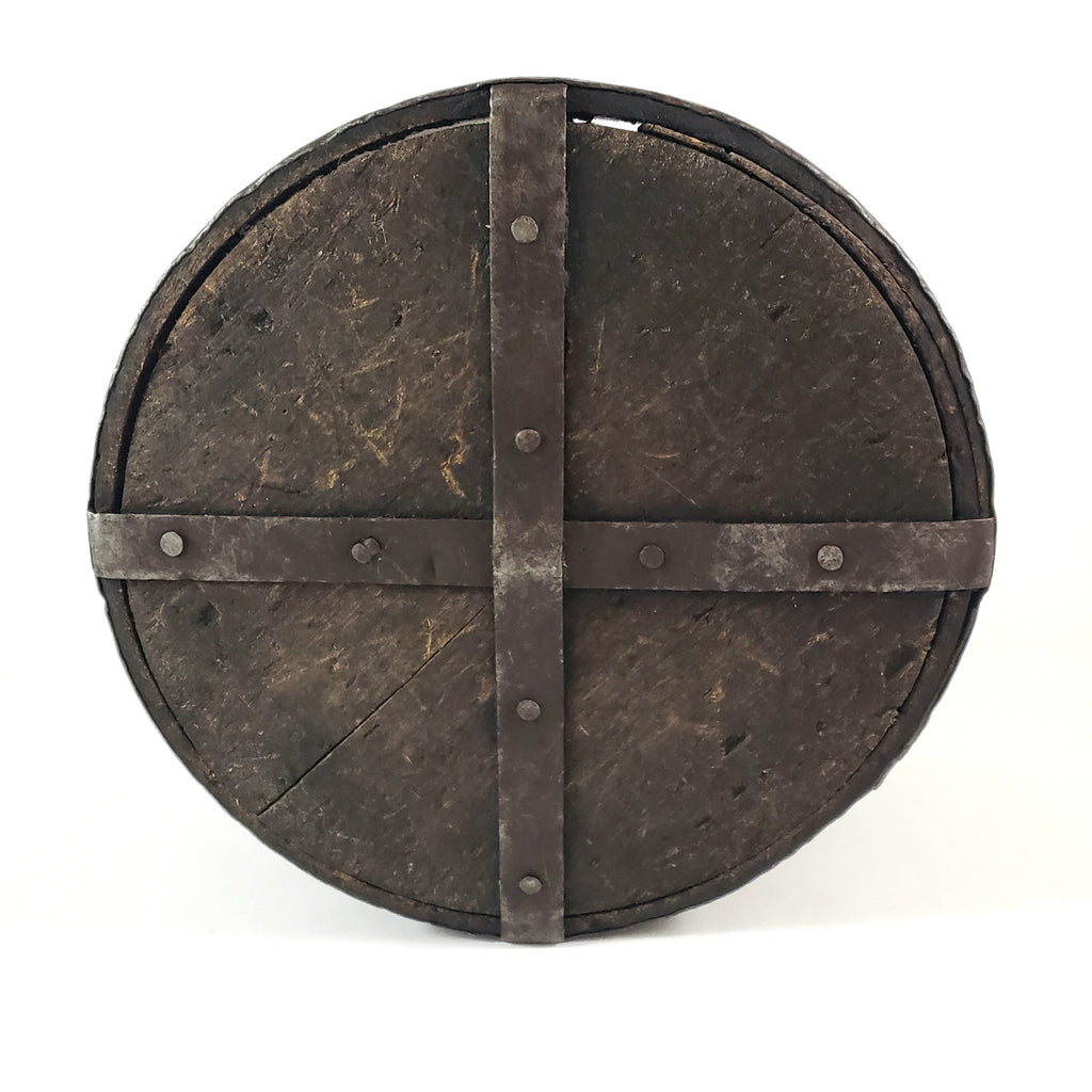 Description: During the earlier years, wooden containers similar to this one were common for measuring dry goods or other commodities. This smaller dry measure most likely used in the agriculture or industrial environment, measures 7 inches in diameter and 4 1/4 inches tall. Well-constructed with bentwood, small nails and reinforced with metal horizontal and vertical bands encircling the exterior sides and bottom. If limited on space, an exceptional choice for primitive or farmhouse decorating.