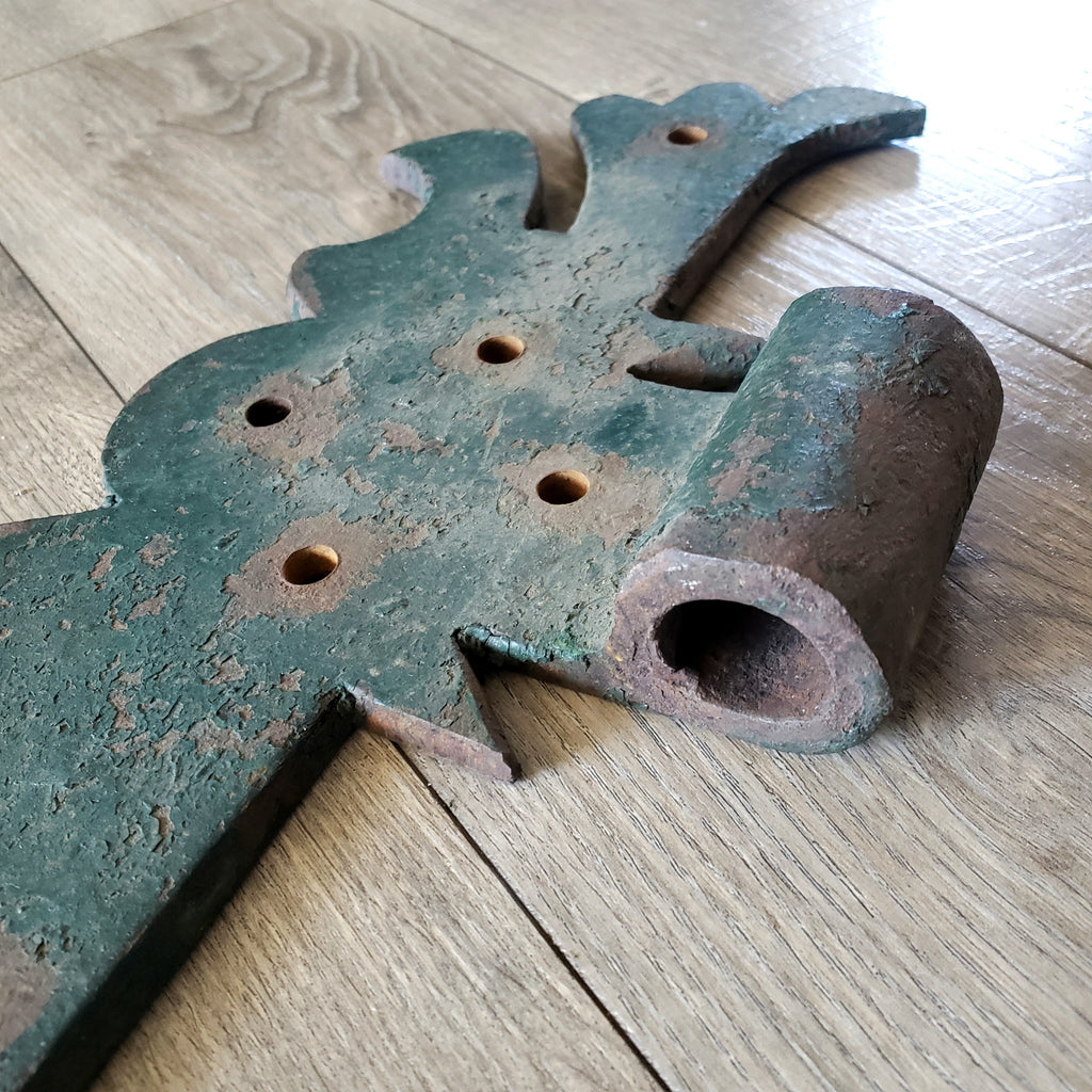 Description: Add this pair of Old World Rustic Cast Iron Hinges to your antique hardware collection. This heavy duty pair from architectural salvage takes center stage with remnants of original green paint and heavy patina. Don’t miss the opportunity to own this rare set for your next restoration or repurpose project.
