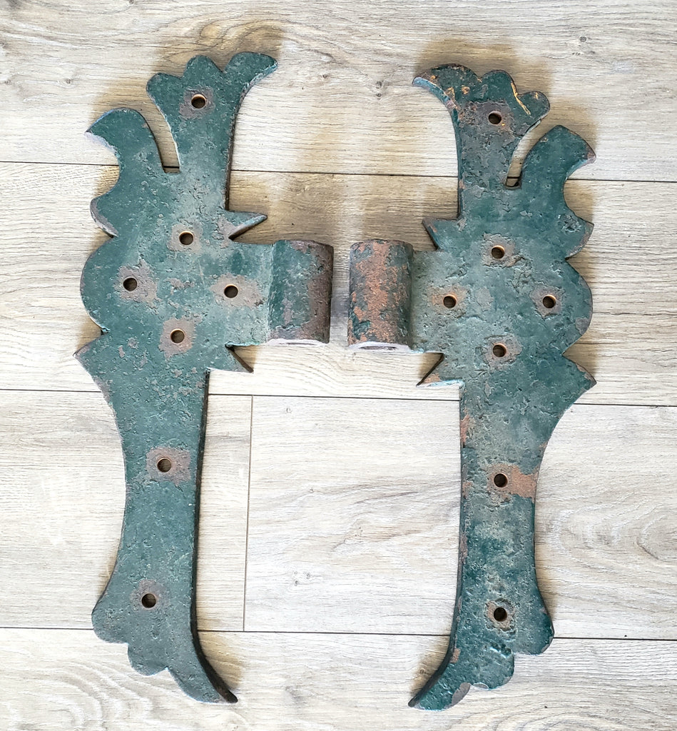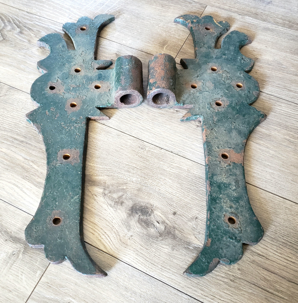 Antique Large Rustic Green Cast Iron Hinges Architectural Salvage