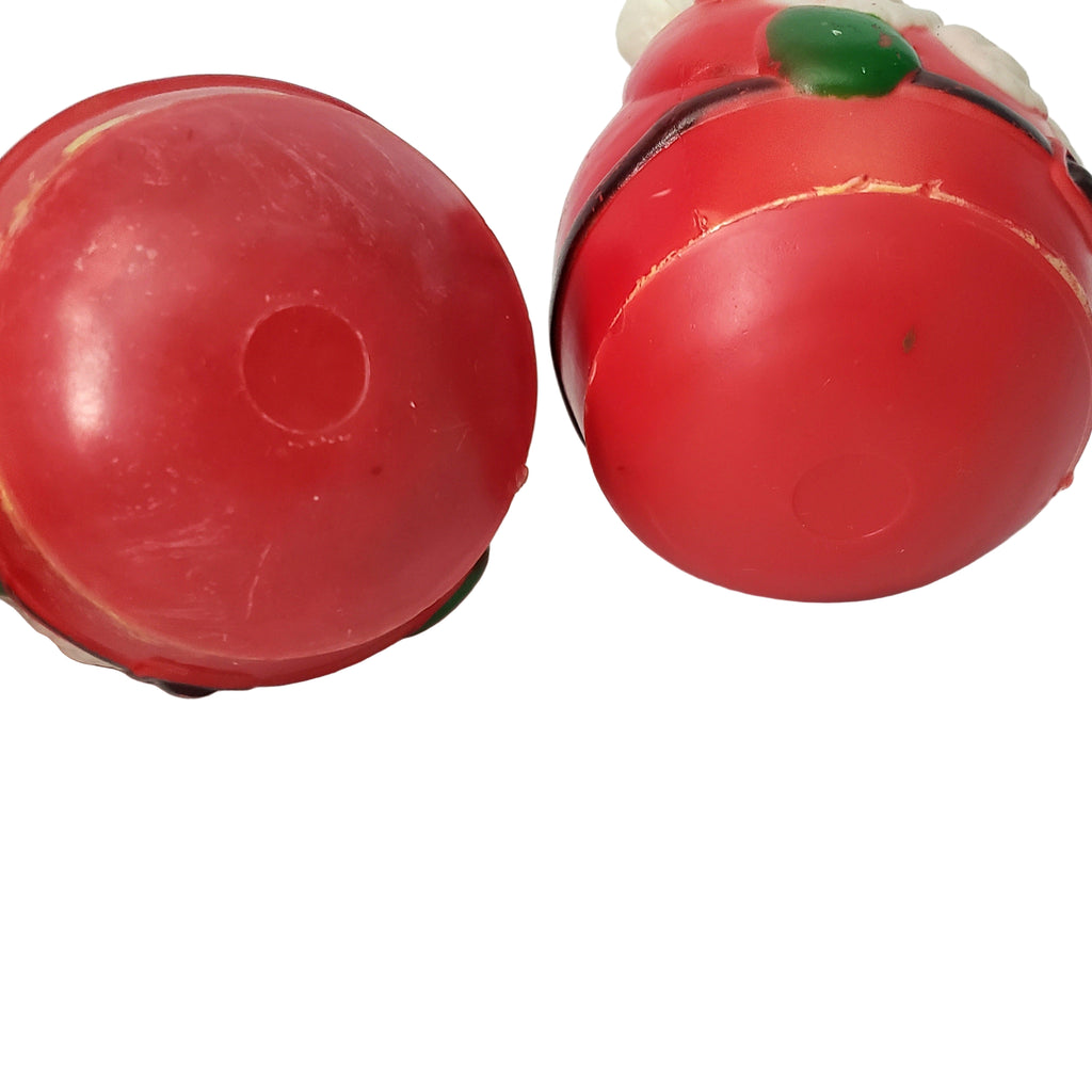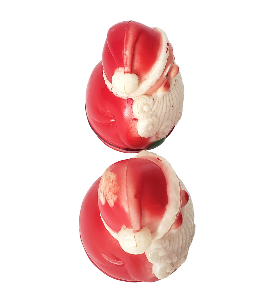 Description: An adorable pair of mid-20th century Roly Poly Chiming Santa Clauses. Made of plastic, both Santa’s in their red suits and matching hats are weighted at the bottom designed to return to upright position when tipped, rocked or knocked over. When they are pushed they chime with a rattle sound, as they rock back and forth. A nostalgic toy collectible that would welcome to be included in with your holiday décor.