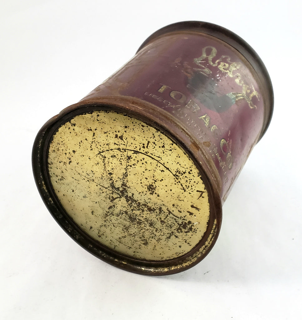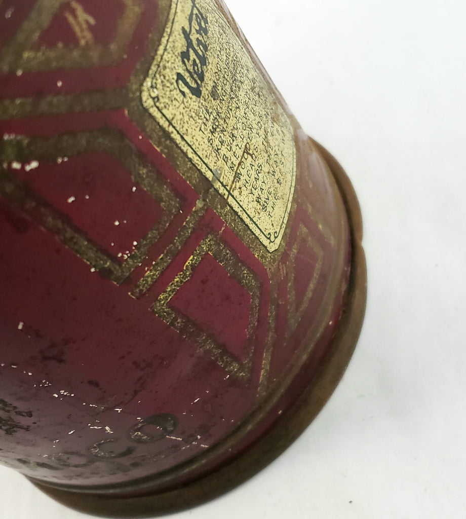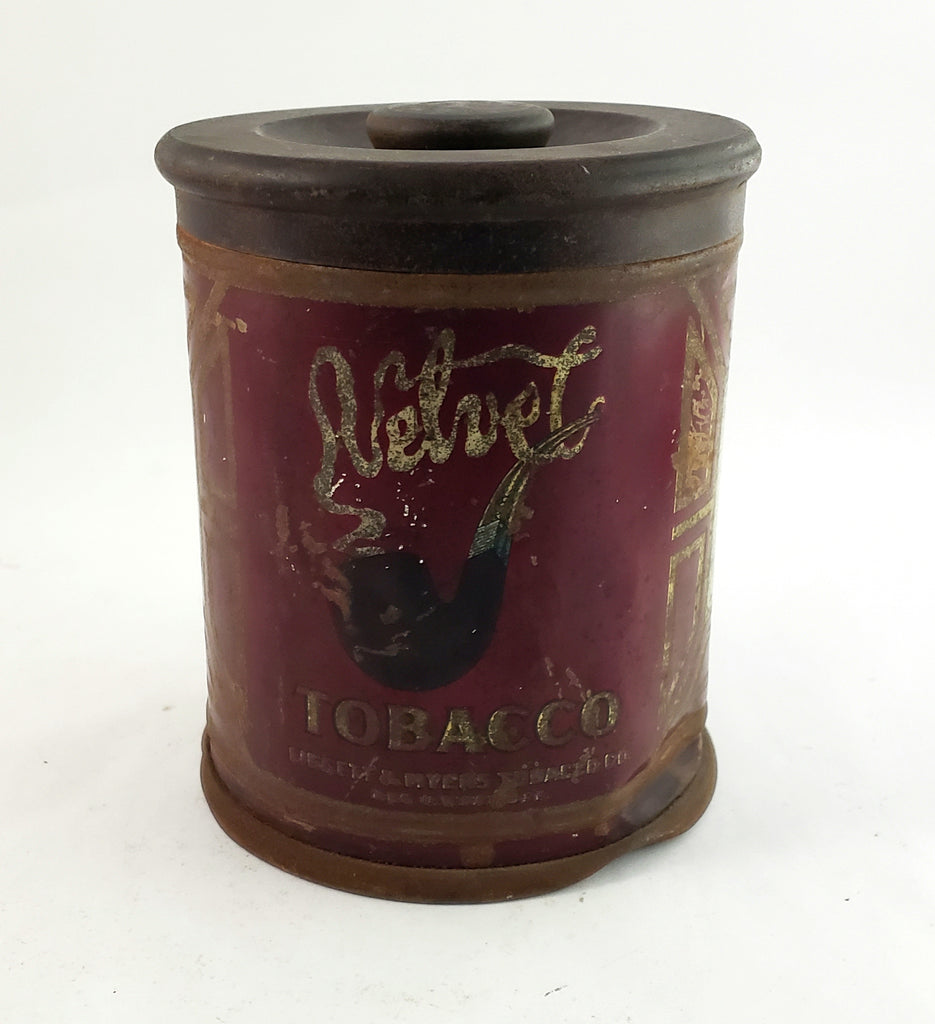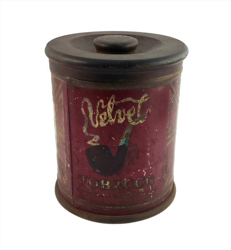 Product Description: This is not just an old tin can. It’s a Velvet Tobacco tin with its original round lid. Early smoke font lettering makes this one desirable. In taller 6 inch cylinder form with lithographics encircling the can on a dark, brick red background, this scarce one will display nicely with your advertising collection.