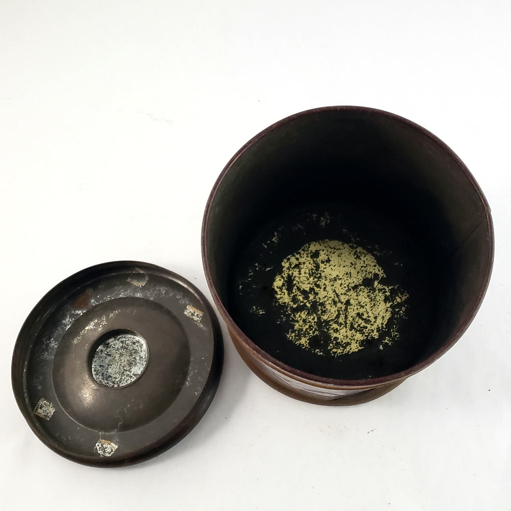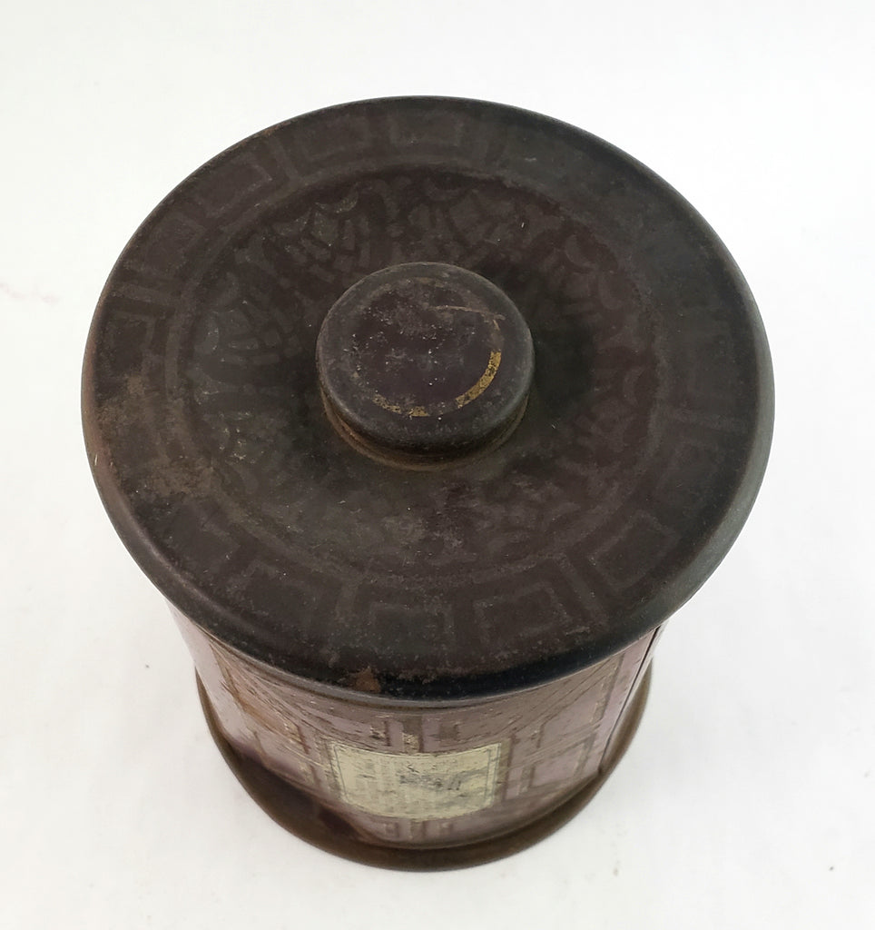 Condition: Previously owned – used. Condition is consistent with age and use. Lid fits snug with no issues, although litho on top is worn and mostly patinated. Two dents in bottom rim (as shown). Scattered scratches and wear in lithographic. Interior exhibits patina and scratches.