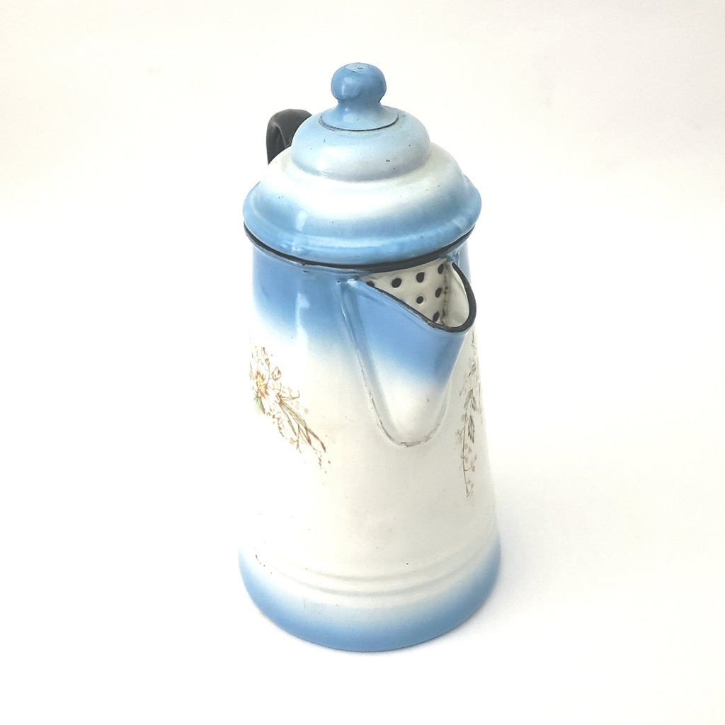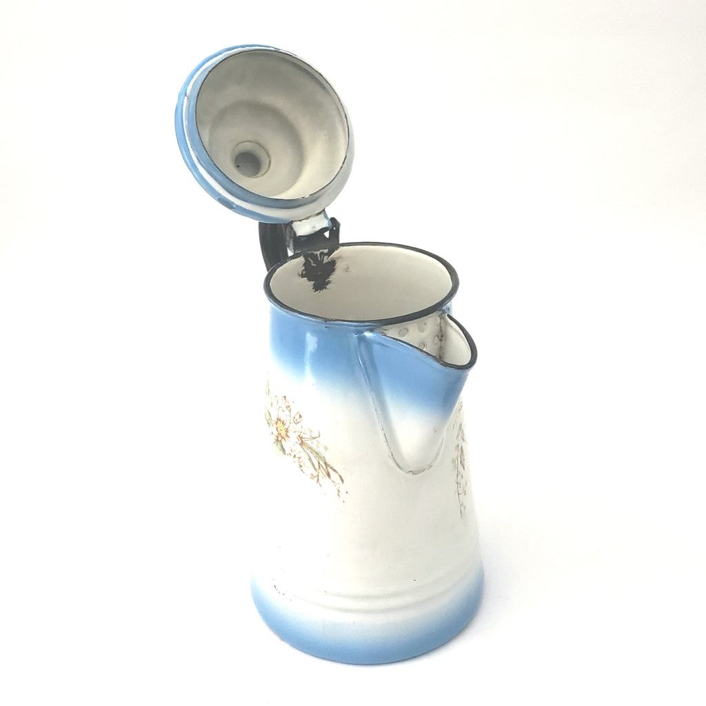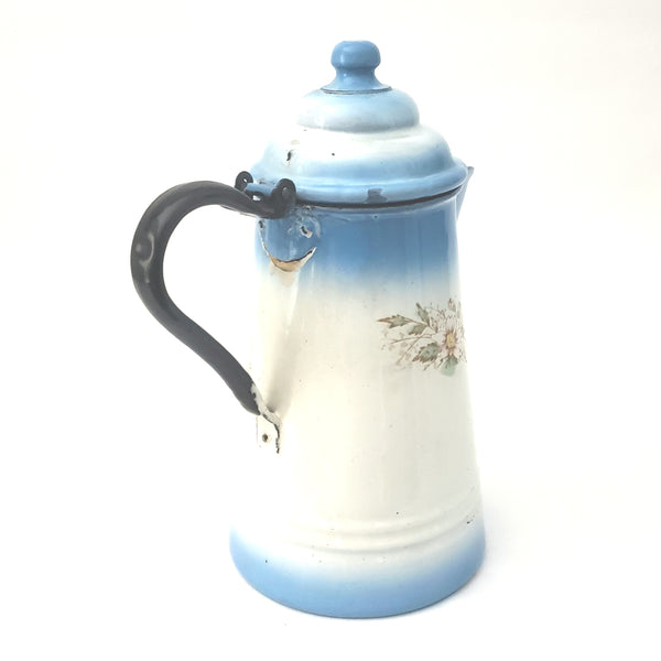 Antique Enameled Coffee Pot Blue & White Blend Flowers Riveted Handle by Stewart