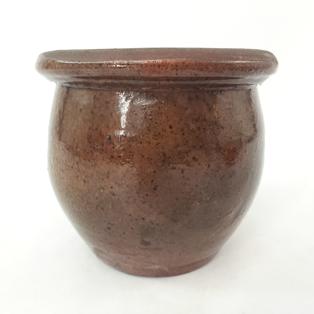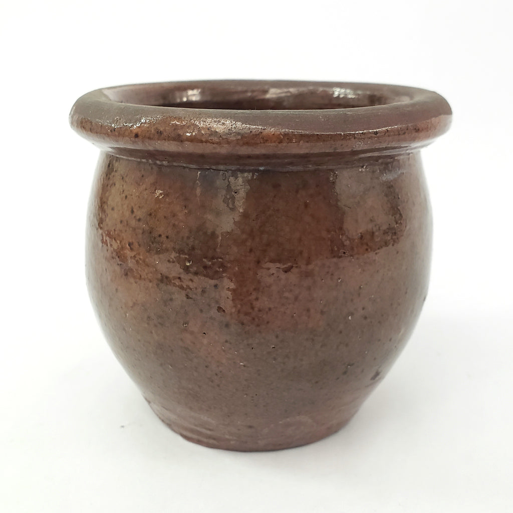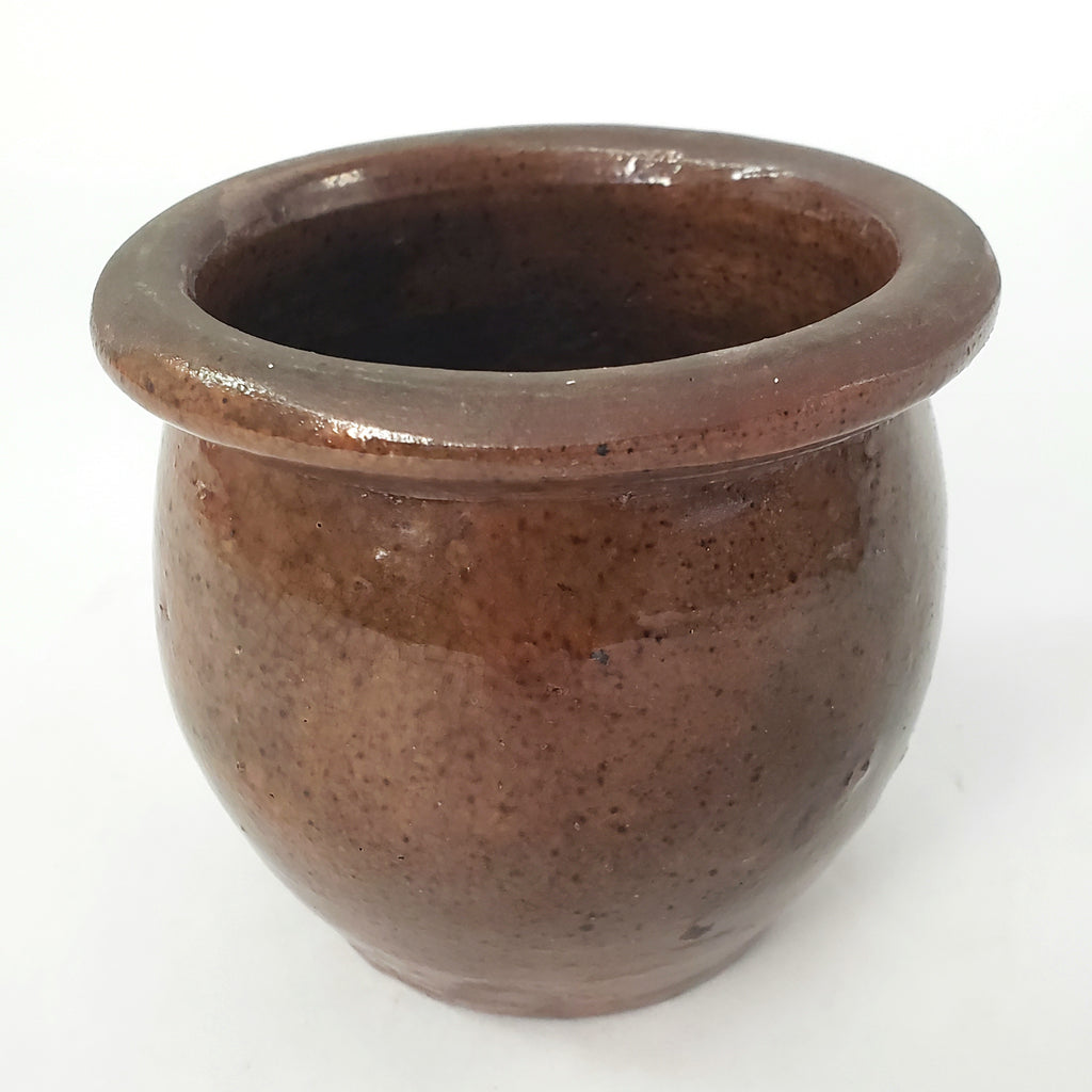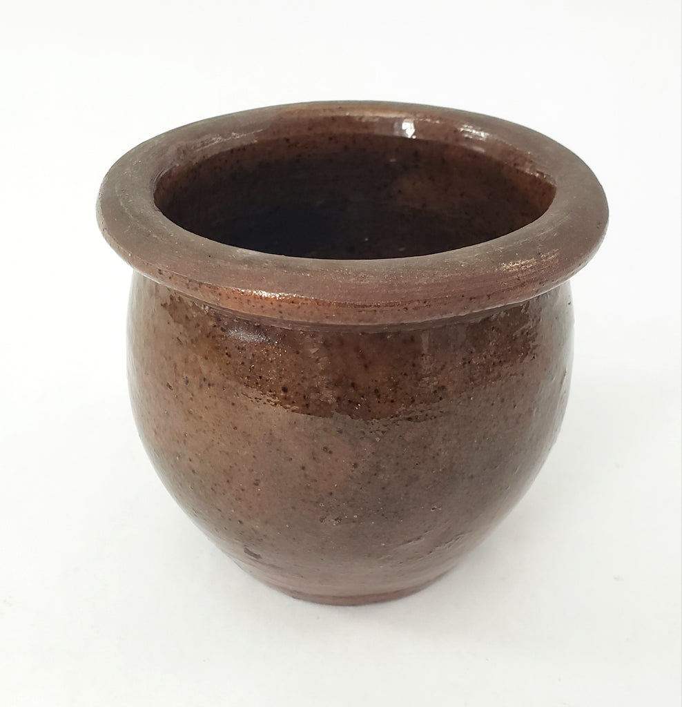 Product Description: Discover authentic 19th century craftsmanship with this exceptional Redware Apple Butter or Preserve Crock. Standing just 3 ½ inches tall-small enough to nestle in the palm of your hand, it features a short bulbous form with interior and exterior glaze that showcases the carmel-brown color-tone with all-over dark speckles. The authentic patina and imperfections reveals the originality we admire in early pottery. Smaller crocks of this size are popular among collectors due to the size, fragility and rarity of redware. Once a practical vessel for preserving food, now serves as a highly collectible crockery jar that will bring warmth and American history to your home.