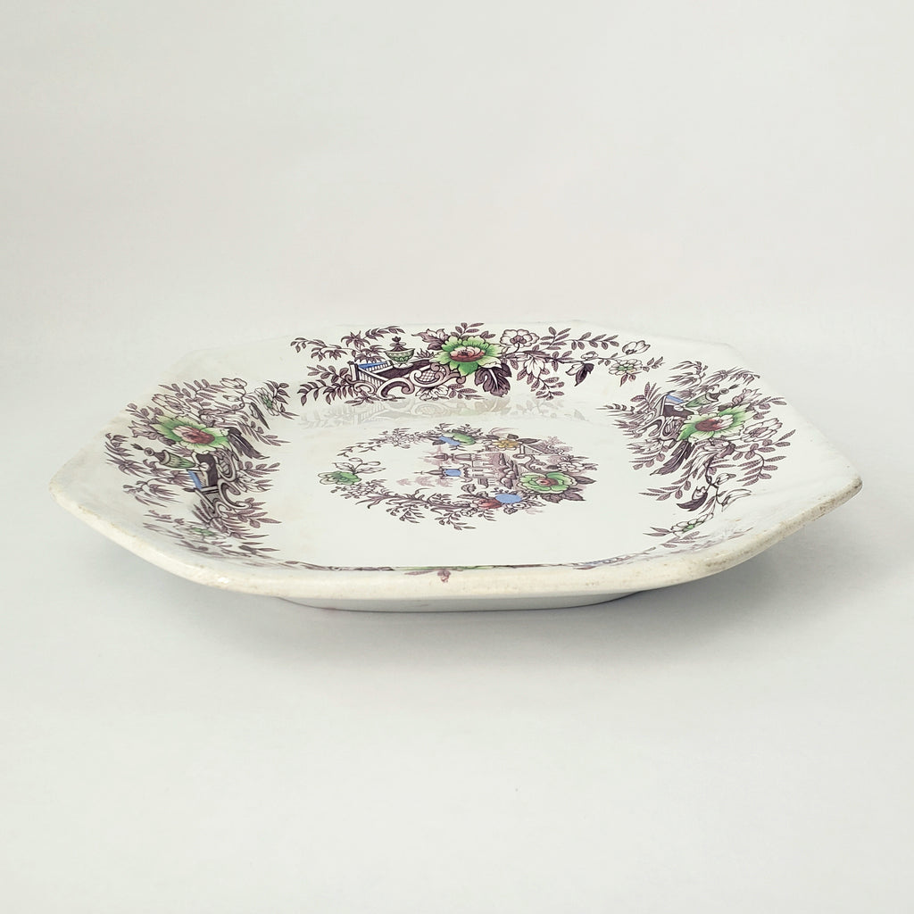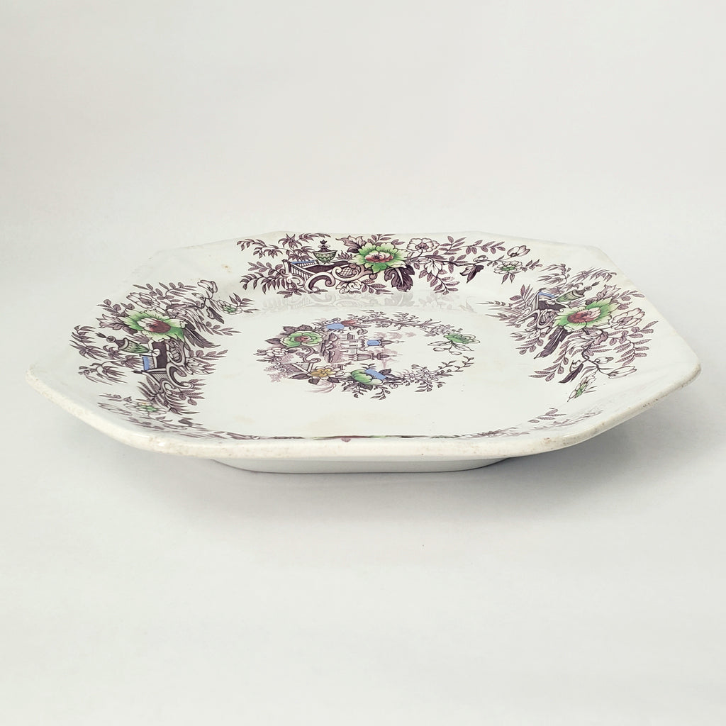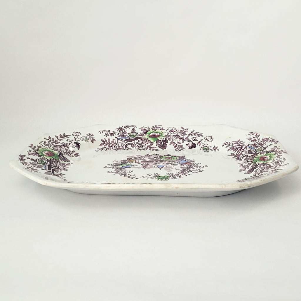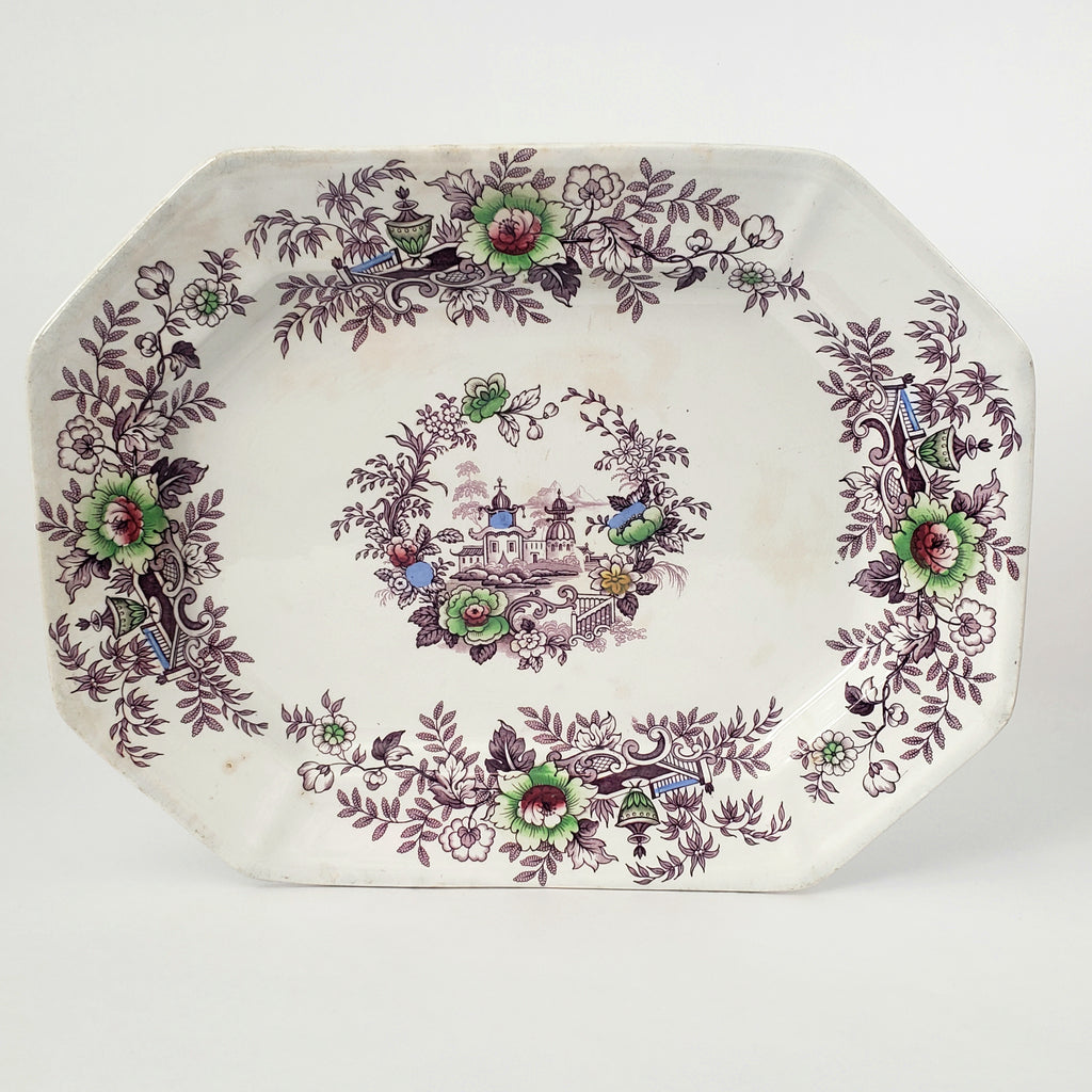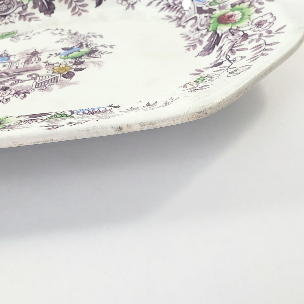 Description: This stunning mid-19th century Ironstone Platter exemplifies John Wedgwood’s master of polychrome transferware production. The Tyrol pattern combines purple transferware printing on white with hand-applied details in green, red and blue, depicting flowering botanicals, scenic castles, and mountains in the background and a glaze. In rectangular form with an octagonal edge, it measures 15 ¾ inches long, showcasing craftsmanship of early English ironstone. Although in good condition, some authentic period aging is present through all-over crazing and areas of natural discoloration that whisper of its storied past.