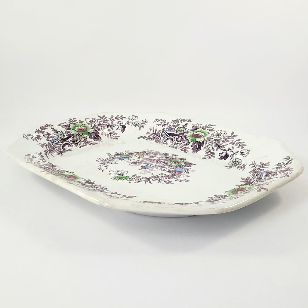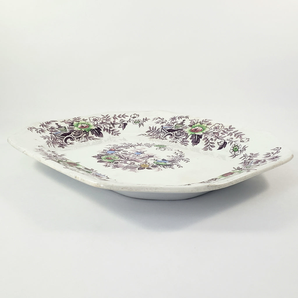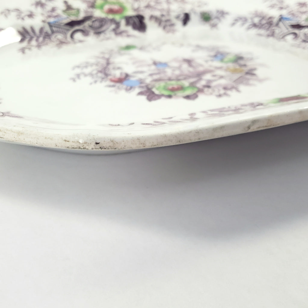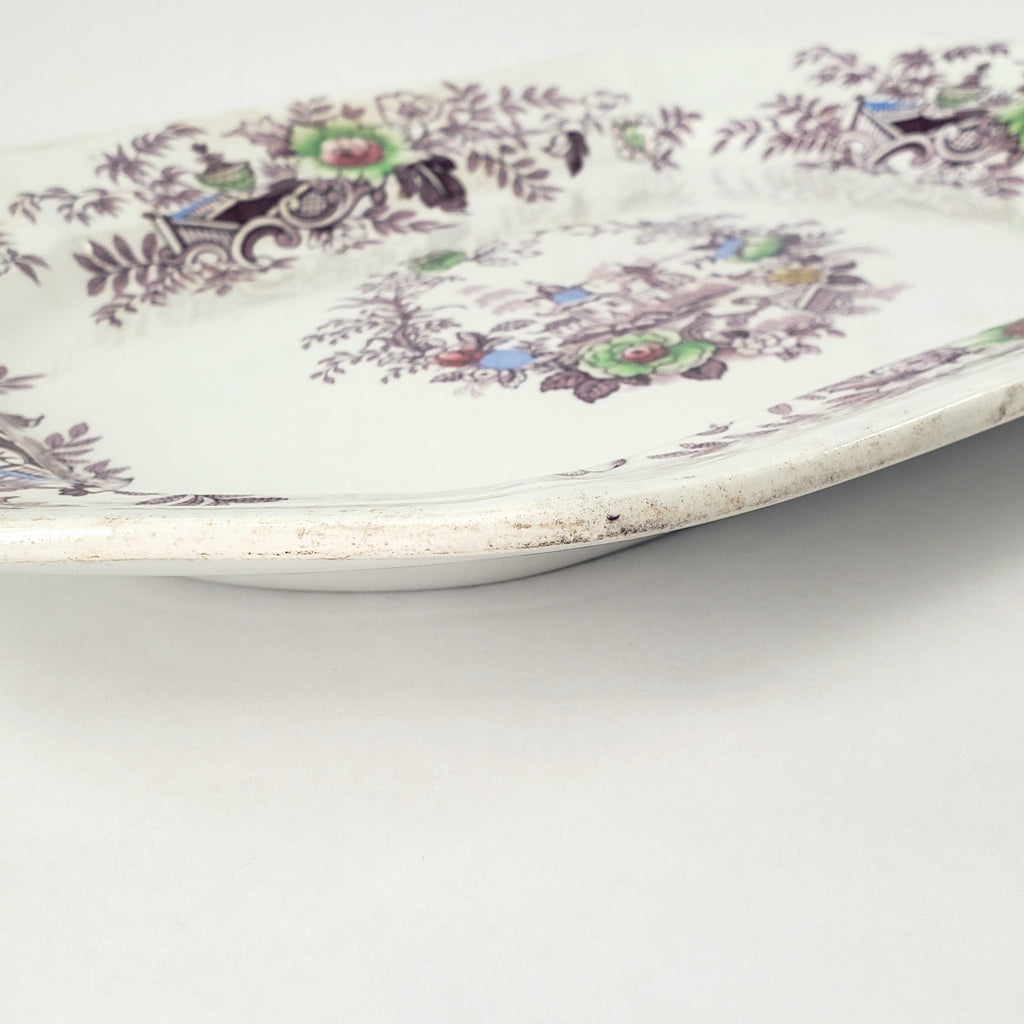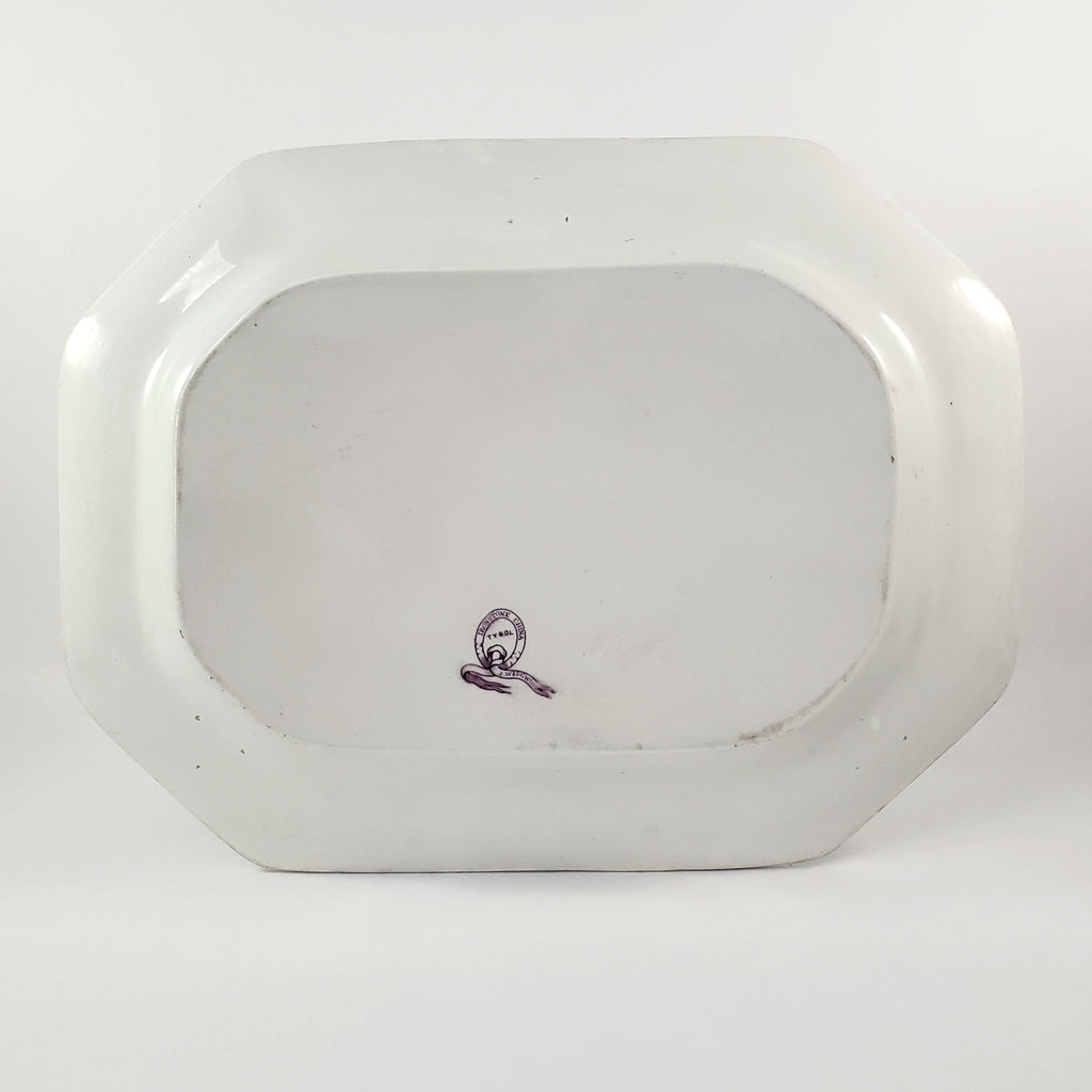 Description: This stunning mid-19th century Ironstone Platter exemplifies John Wedgwood’s master of polychrome transferware production. The Tyrol pattern combines purple transferware printing on white with hand-applied details in green, red and blue, depicting flowering botanicals, scenic castles, and mountains in the background and a glaze. In rectangular form with an octagonal edge, it measures 15 ¾ inches long, showcasing craftsmanship of early English ironstone. Although in good condition, some authentic period aging is present through all-over crazing and areas of natural discoloration that whisper of its storied past.