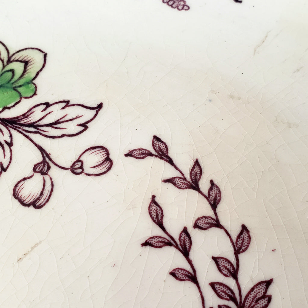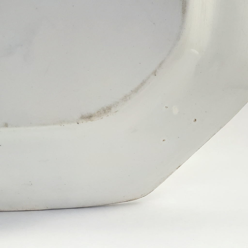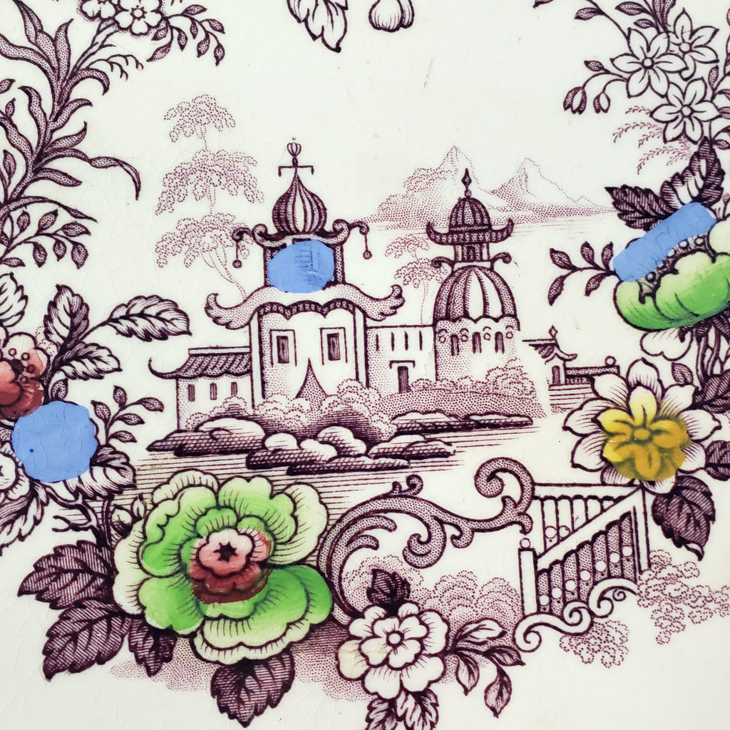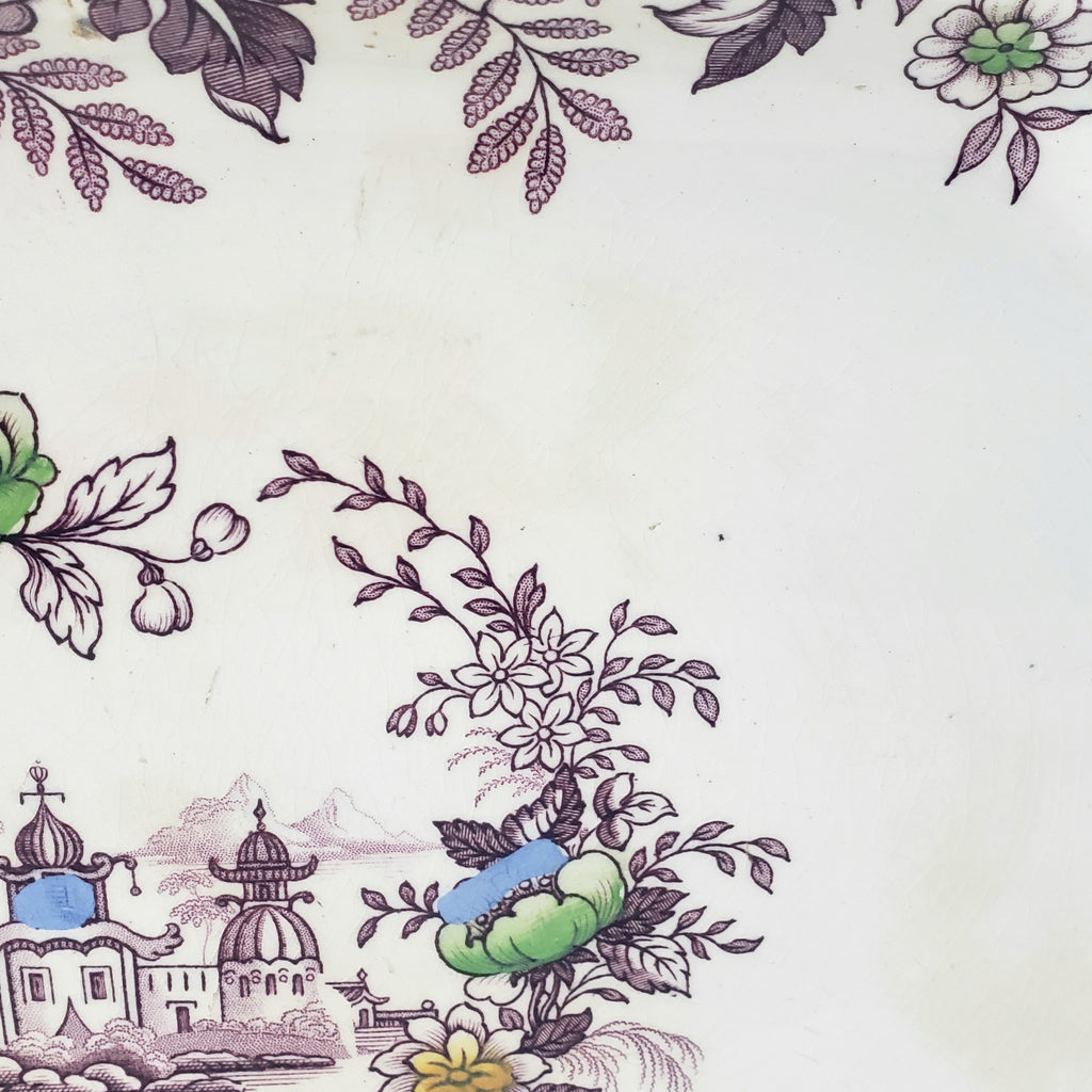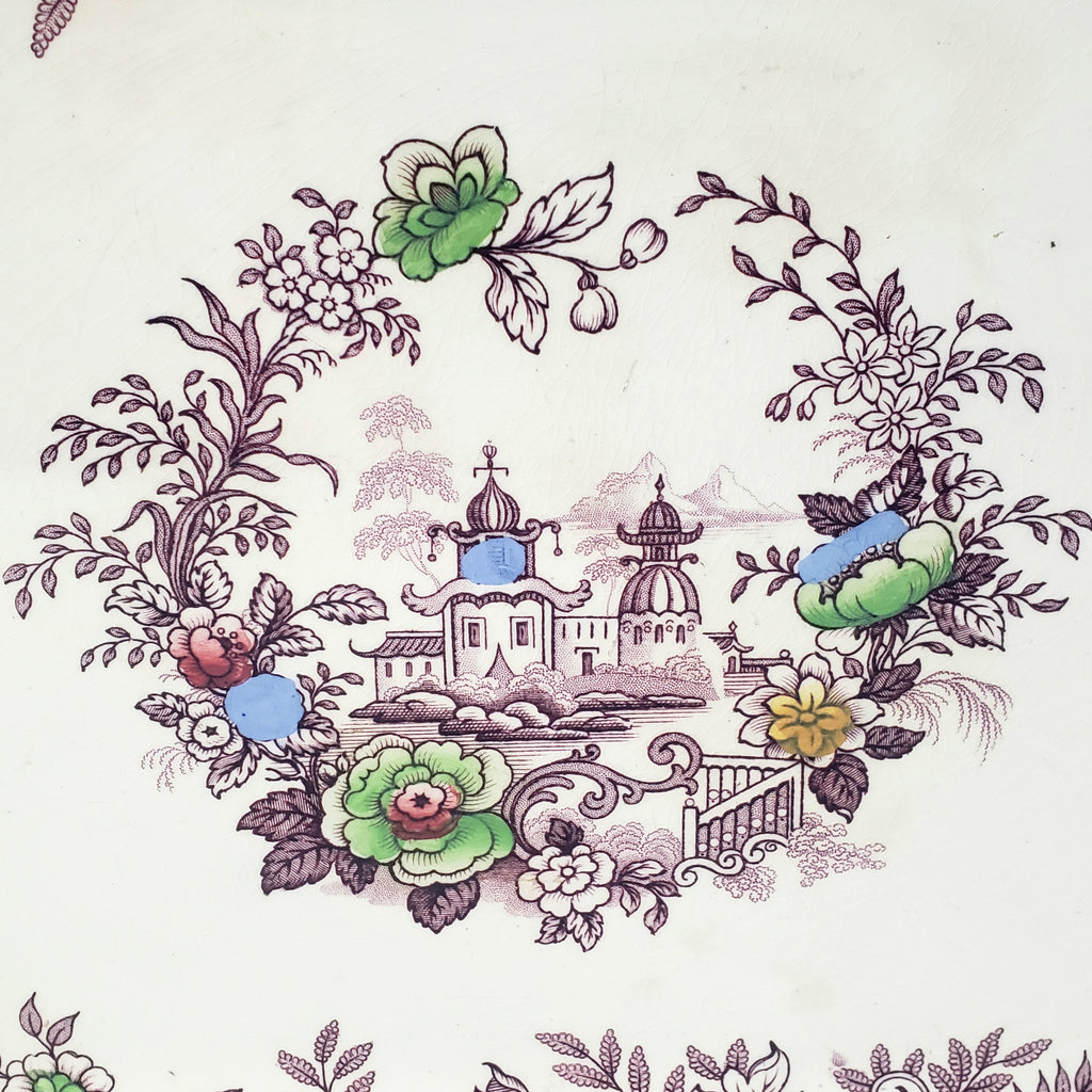 Description: This stunning mid-19th century Ironstone Platter exemplifies John Wedgwood’s master of polychrome transferware production. The Tyrol pattern combines purple transferware printing on white with hand-applied details in green, red and blue, depicting flowering botanicals, scenic castles, and mountains in the background and a glaze. In rectangular form with an octagonal edge, it measures 15 ¾ inches long, showcasing craftsmanship of early English ironstone. Although in good condition, some authentic period aging is present through all-over crazing and areas of natural discoloration that whisper of its storied past.