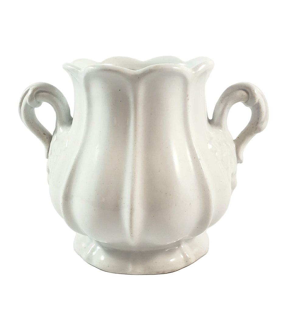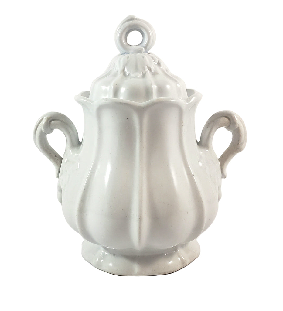 Product Description: Meet your new favorite tabletop treasure that will bring sophistication and vintage charm to your home. This Antique White Ironstone Sugar Bowl in the Paneled Grape body style with a glazed, white surface will offer sophistication and charm to any style decor. The gently fluted paneled body and lid with an embossed grapes & leaf pattern and organic, branch-like handles offers a delightful find for those who admire white pottery.