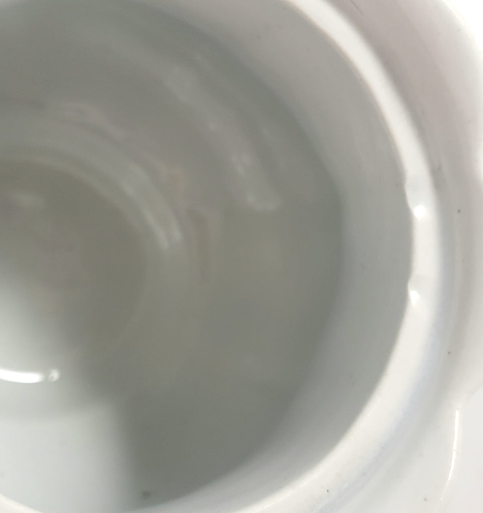 Condition: Previously owned - used. Condition is consistent with age and use. No cracks or repairs. All three handles have been evaluated for repairs - all free of any damage or repairs. Any color difference are undertones or discoloration within or under glazing. Interior is clean. Aging on bottom in the form of discoloration or tea stain color on base ring. Slight roughness and discoloration on edge of handles from use. Two nicks on underside of lid. Four 1/8” to ¼ inch chips on inner lip of bowl which the lid rests on and appear to be glazed over. Scalloped rim is smooth.
