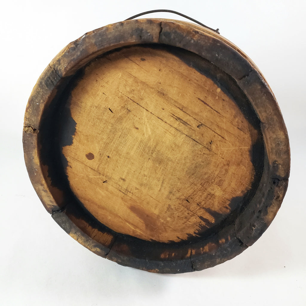 Condition: Previously owned - used. Condition is commensurate with age & use. Considered good antique condition. All original. Discoloration and surface patina on interior, lip and bottom base from the product that it was stored within the firkin. Wire Handle and grip are in good condition. Strong wooden staves and finger laps. Circular insert in lid is slightly warped although still contained by the staple and tacks. Sold as a decorative collectible only.
