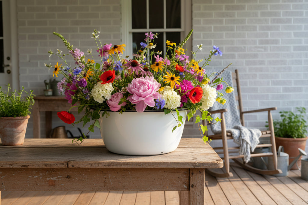 Description: This vintage White Enamelware Basin represents classic farmhouse design with its white enameled surface and authentic surface wear. It stands 6 1/4 inches tall with a gentle tapered body and generous 15-inch top diameter. Perfect as a porch or kitchen container to hold your favorite plants or spring and summer flowers.