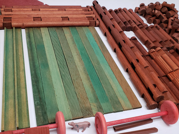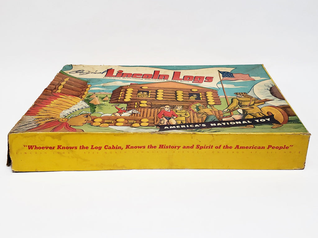 Product Description: Fantastic graphics on the package of this original Lincoln Logs 3-LF Set. This collectible 1940's toy features 129 pieces along with the 4 page original Lincoln Log design book. Although all of the miniature figures are missing but 1 dog, America's National Toy is still a highly collectible toy today.